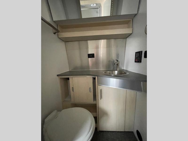 When you enjoy the finer things when traveling, this trailer will provide that for you plus lots of natural lighting and plenty of conveniences. The convertible rear dinette offers a place to dine and socialize for four, and there is a lounging area along the side with a TV on the wall. The table acts as a sturdy base below the cushions when you need some sleeping space. The front bedroom offers more panoramic windows and a comfortable queen bed or optional twin beds with a view each morning and night. You will find storage for your clothing, and a split bathroom with a private toilet and sink on one side and a shower that stands independently across the hall. And the kitchen offers everything you need to make meals including extra counter space and a refrigerator for leftovers. And there is a rear hatch option for this trailer you might want to add to let fresh air in!