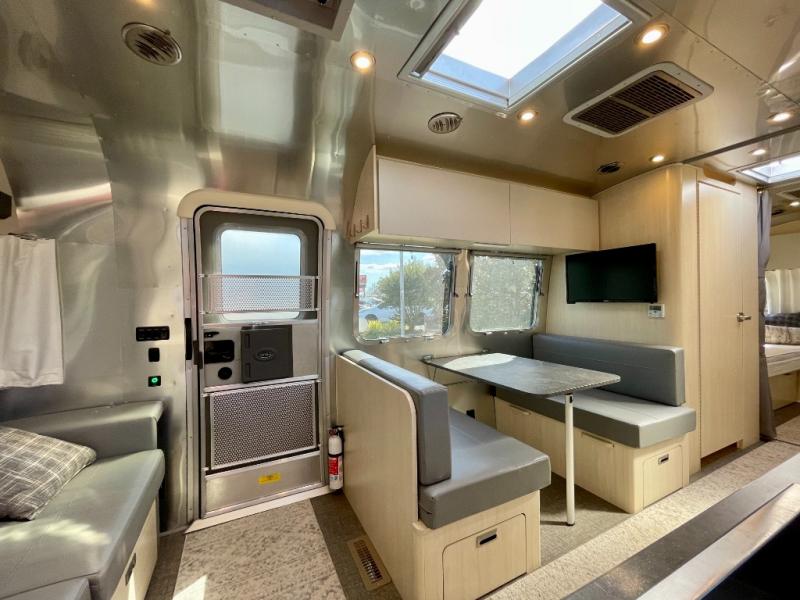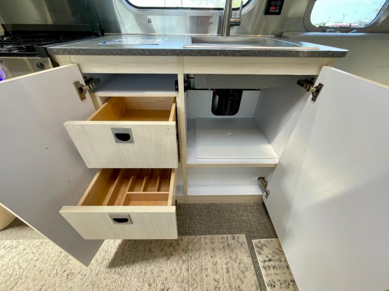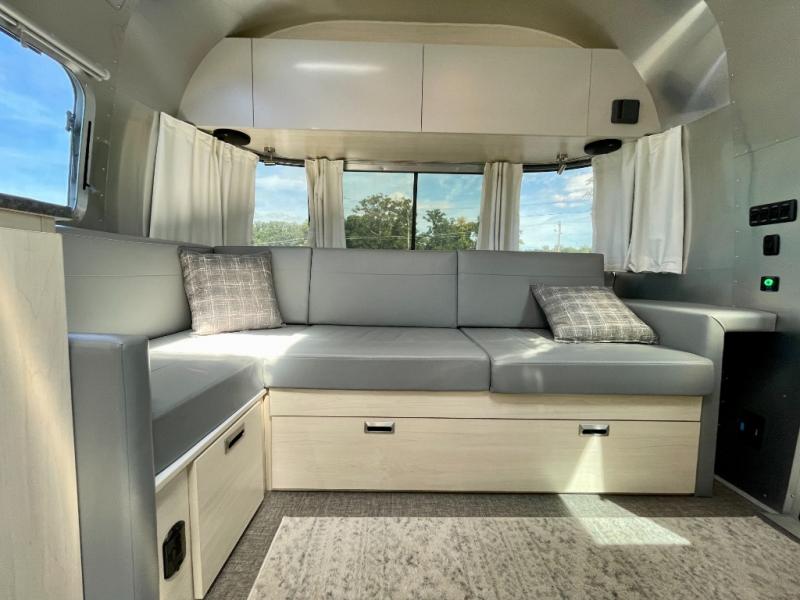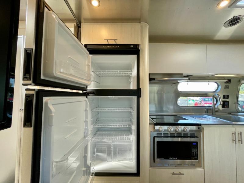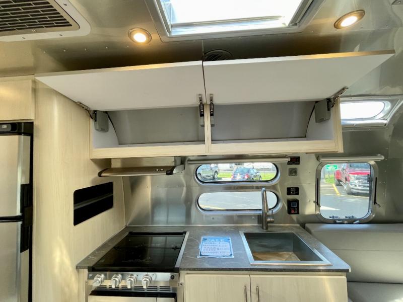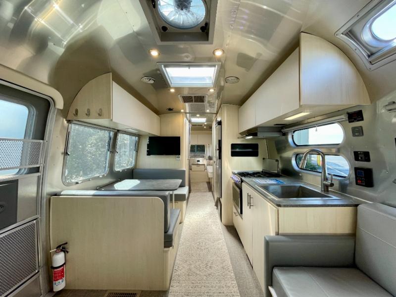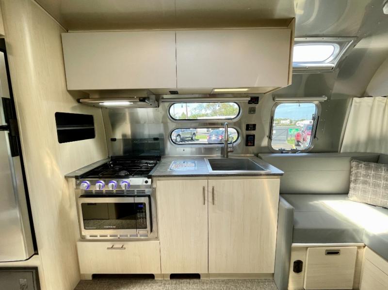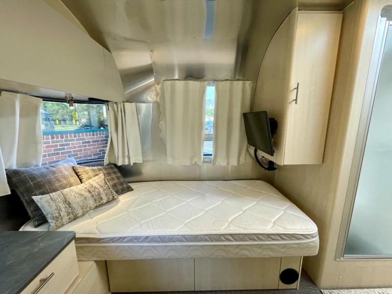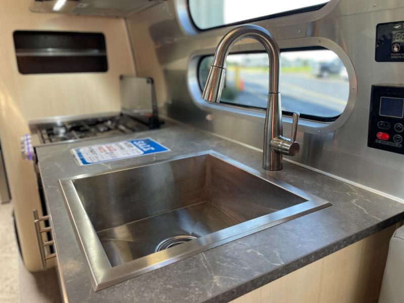 With each Flying Cloud travel trailer by Airstream, there are two axles, and each is built for ease of towing, plus there is a rear-view camera to make reversing and parking easier, and stainless steel front stone guards to protect the lower segments from road debris. The iconic Airstream design is created outside and inside by the semi-monocoque aluminum superstructure, the temperature reducing one-piece white aluminum roof, the panoramic front windows, and the stylish aluminum wheels. The interior will have you feeling right at home with handcrafted cabinetry, plenty of storage and counter space, sleek roller blinds and blackout curtains, plus residential style faucets!