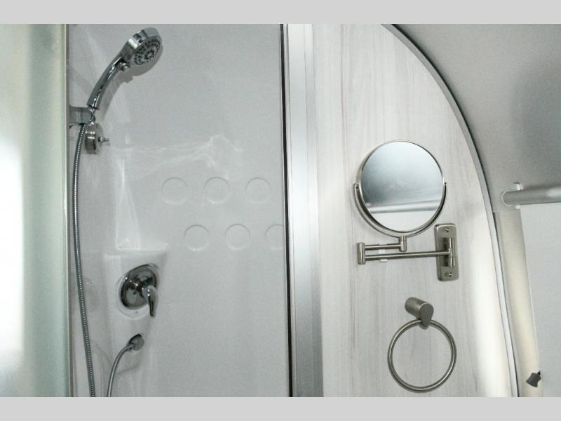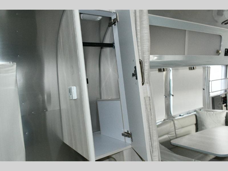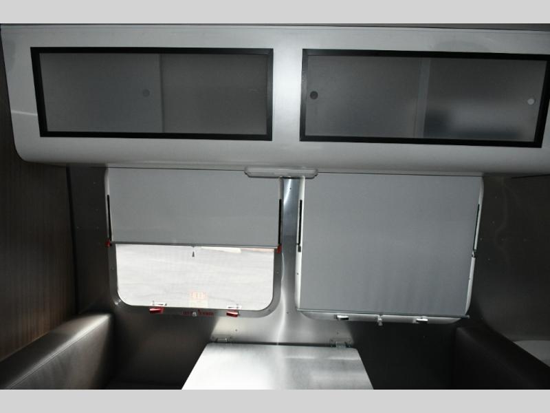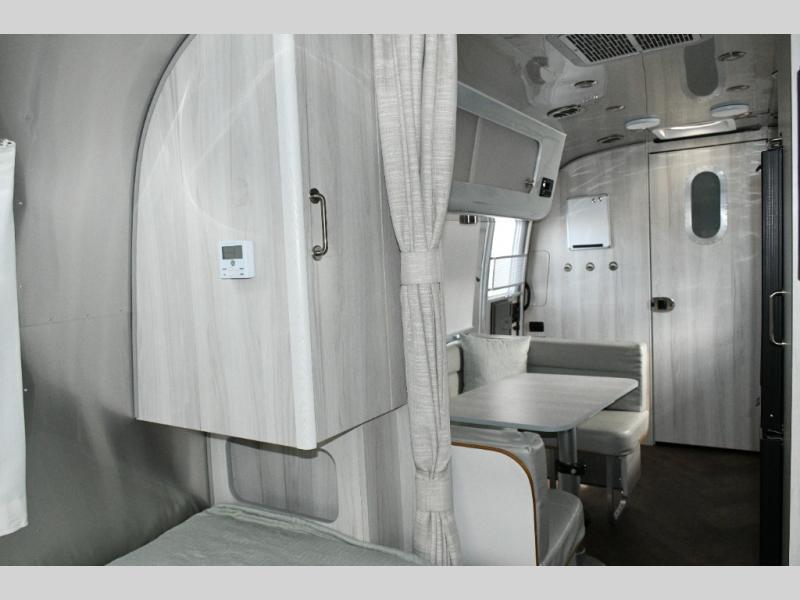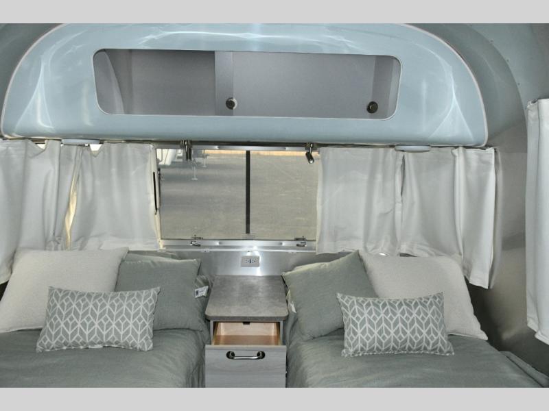 Twin Bed Layout. With a rear bathroom, U-shaped dinette, and ample storage, this Airstream combines practical features with timeless design.