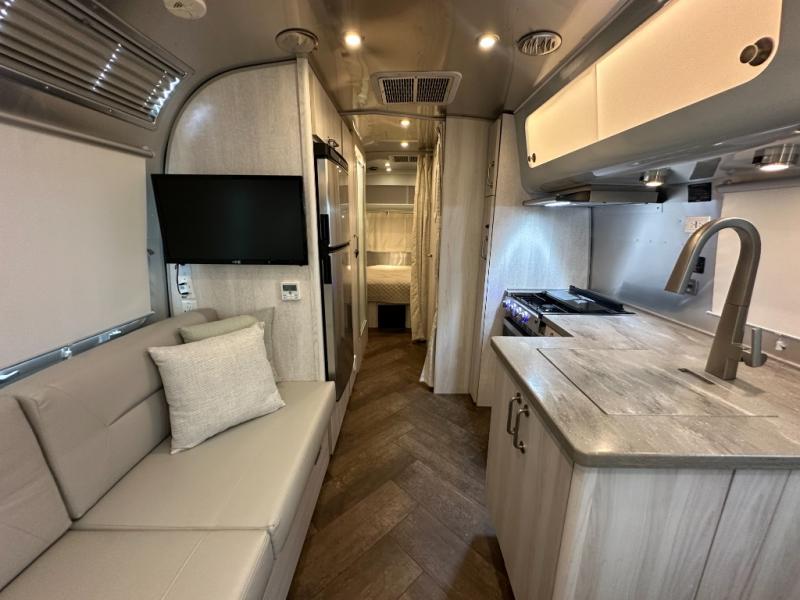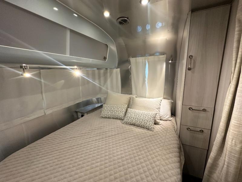 Every time you step foot into the Airstream International travel trailer, you will feel as if you are breathing in a breath of fresh air! The fresh coastal décor was inspired by the waterfront, and the stylish interior delivers a relaxing environment and comfortable luxury. The panoramic windows increase the amount of natural sunlight that streams through to the interior, but they also have blackout shades that you can close whenever you need a darkened room. The beautiful handcrafted Italian Lite-Ply laminated cabinetry is an attractive base for the overhead storage lockers that have sliding doors and LED lighting. The dimmable interior LED lighting will create the perfect amount of illumination for you as you spend time indoors. The exterior has excellent features as well with its enclosed aluminum insulated heated underbelly, unique front door key with heavy-duty deadbolt, optional solar package, solar front window protection, and exterior shower with hot and cold water.