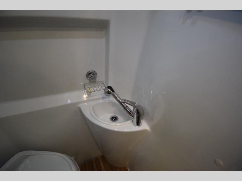 Prepare your meals wherever adventure takes you using the two-burner gas cooktop with an integrated cover, convection microwave, and the 3.2 cu. ft. 12V refrigerator/freezer. A slide-out pantry keeps your dry goods organized, and the stainless steel sink makes cleanup easy.