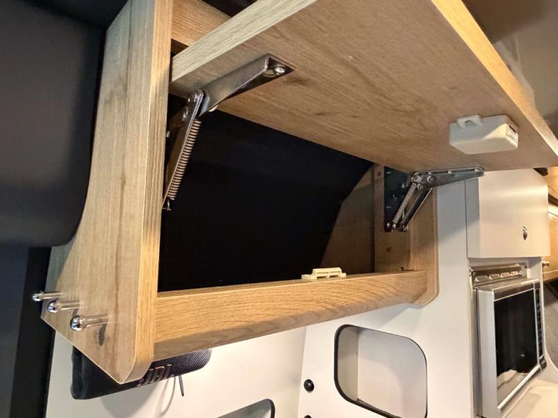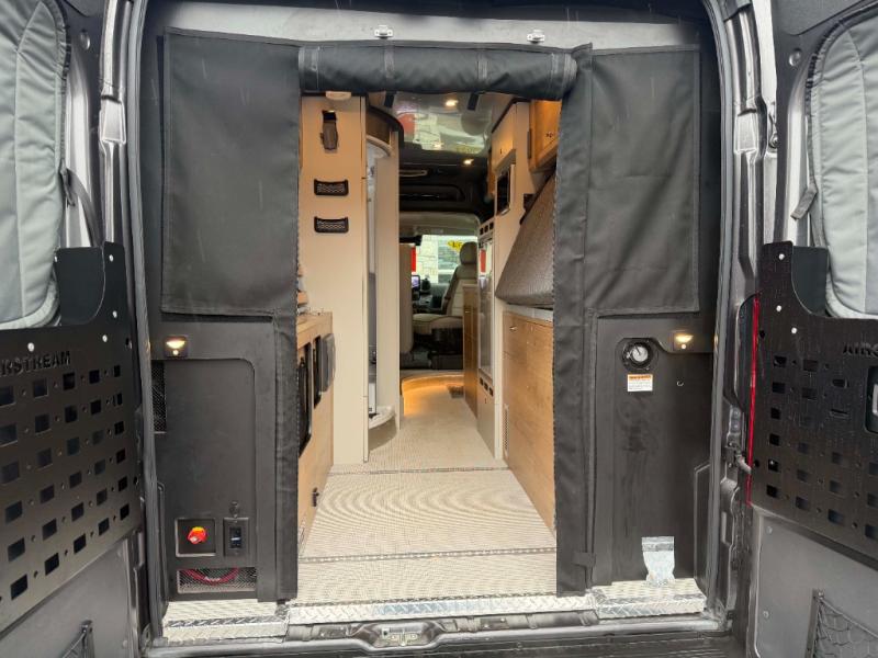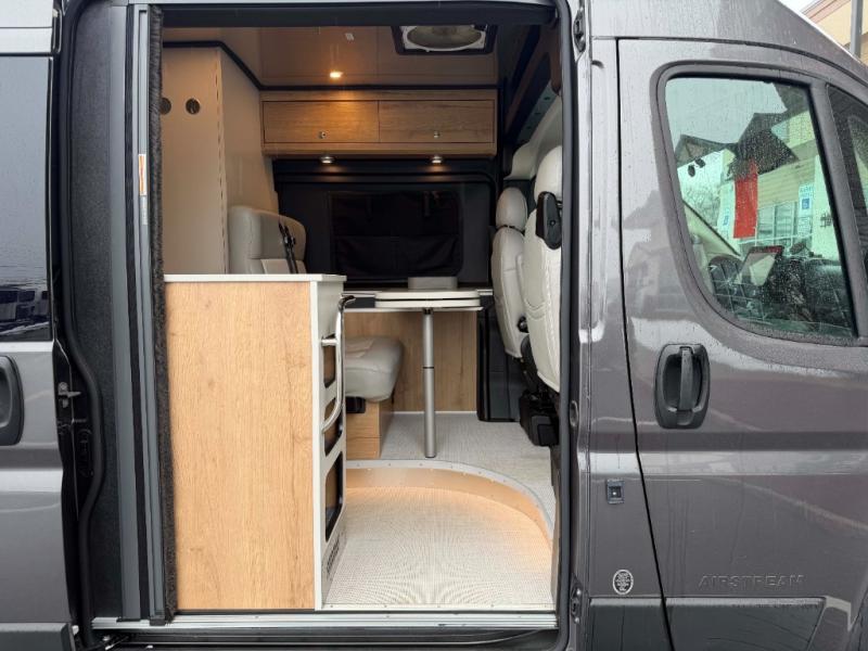 The Airstream Rangeline offers complete comfort and flexibility with great living spaces, flexible storage throughout, and all the amenities you need to enjoy travel. Its sleek design with painted grille, two interior color choices with Warm River Oak cabinets and drawers, and gray laminate countertops allows you to travel in style. The Ram ProMaster 3500 chassis offers front-wheel drive and 276 horsepower, with an efficient gas-powered heat and hot water system plus SumoSprings and SuperSprings for an overall better driving experience. Rear storage includes MOLLE panels on the rear doors to hang all your gear, and space under the bed for even more cargo. The optional pop-top roof has three screen windows and another bed, expanding sleeping capacity to four people.