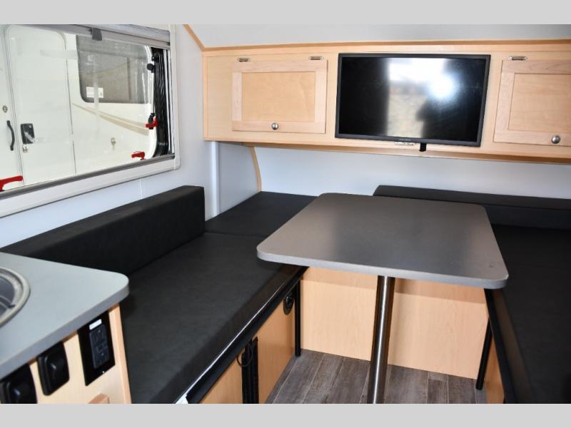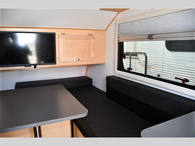 Spacious dinette with two cushioned bench seats and a table—ideal for dining, planning, or playing cards -