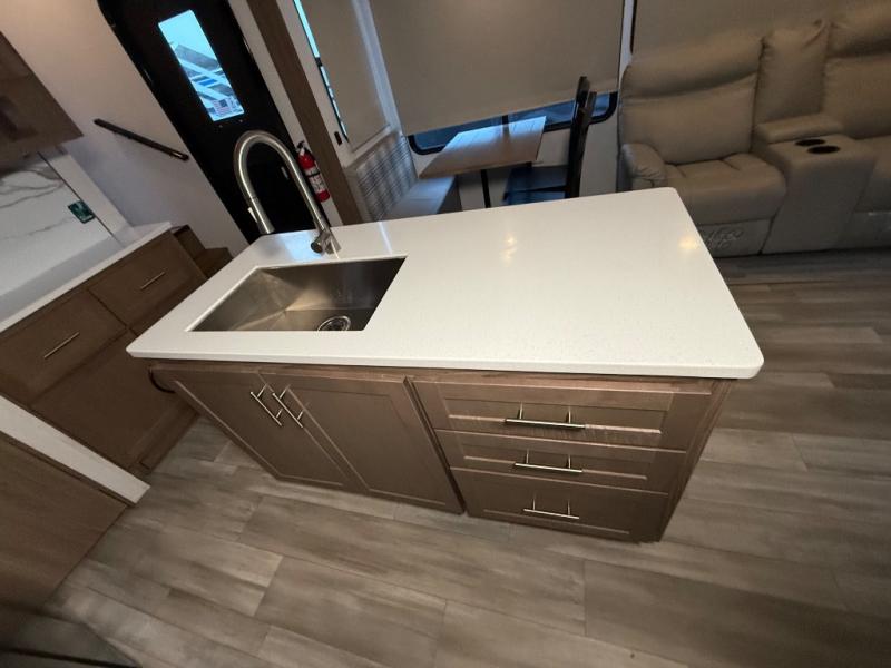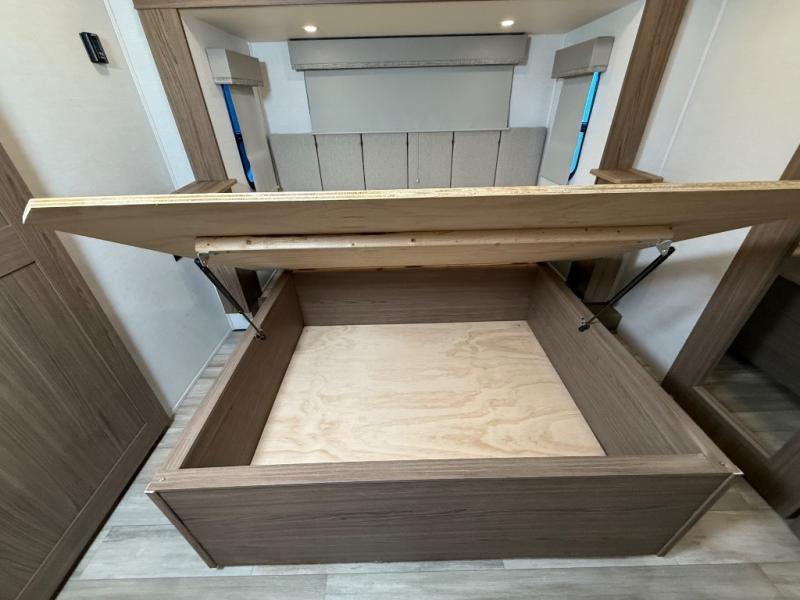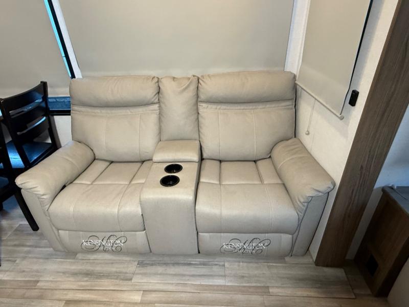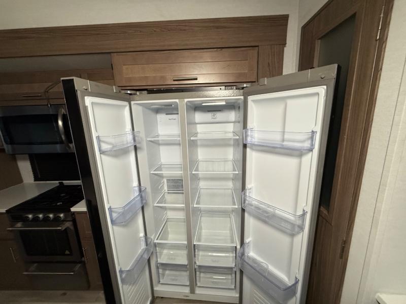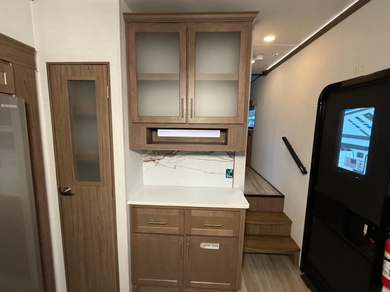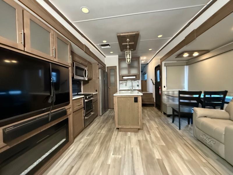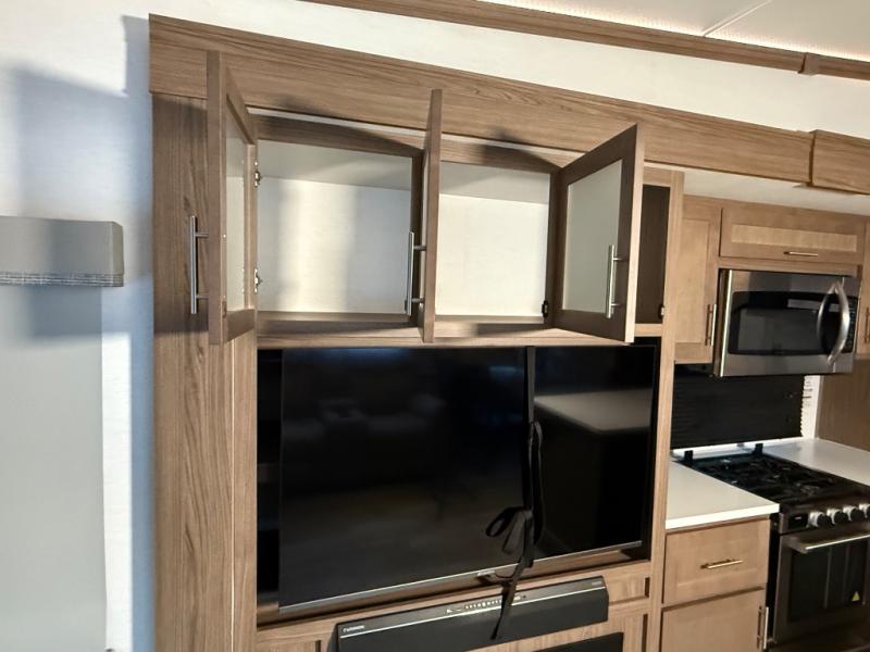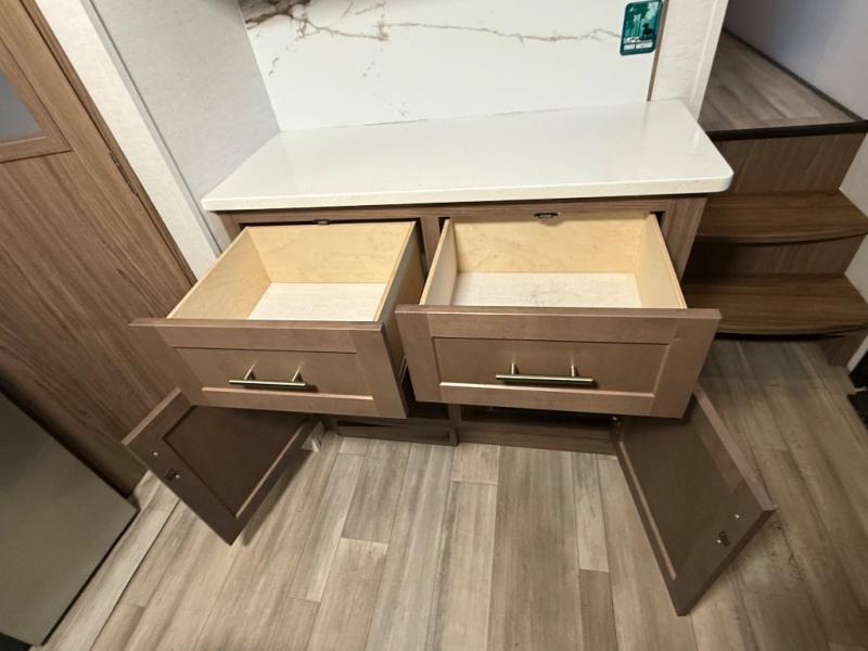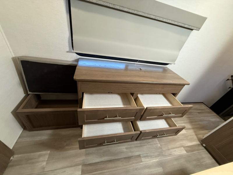 A kitchen island with countertop space makes it easy to prepare meals in this fifth wheel! The floating dinette table has two chairs on one side and a movable ottoman with flip up storage on the other side to keep your games or extra table cloths in. You can store your dishes and snacks inside the hutch/pantry or in the second pantry. The front private bedroom has a queen bed slide but can be switched out for the optional king bed if you like. There is also a dresser and large wardrobe for storage, and either side of the wardrobe has been prepped for a washer and dryer which you could add for those extended trips. The rear living area features a dual recliner theater seat across from an entertainment center with a 50" class HDTV with hidden storage behind it and is also on a swing mount for all to see even at the rear sleeper sofa!