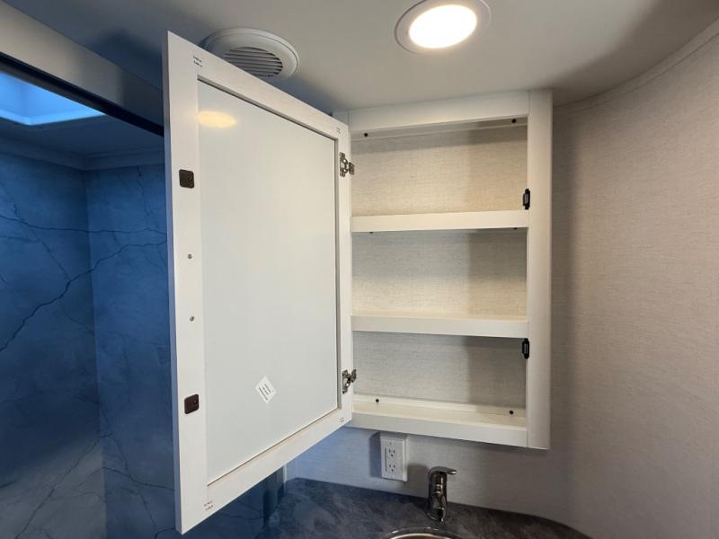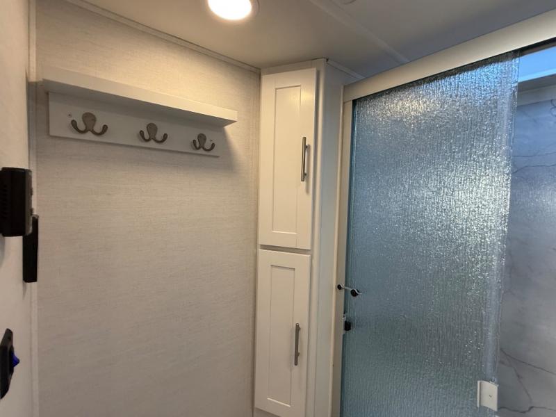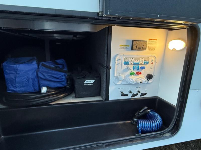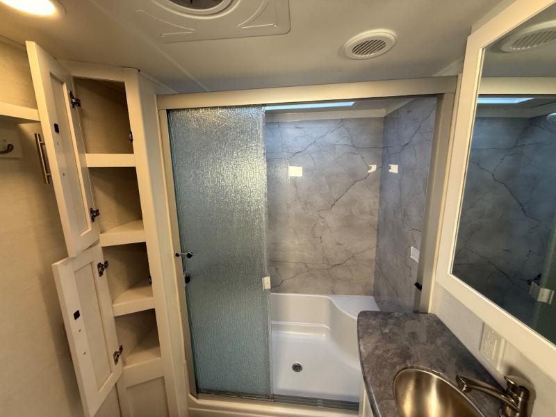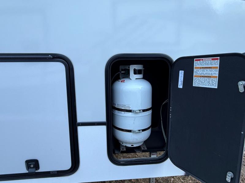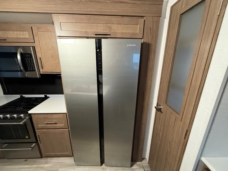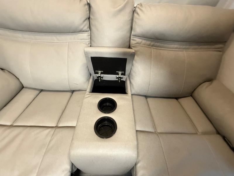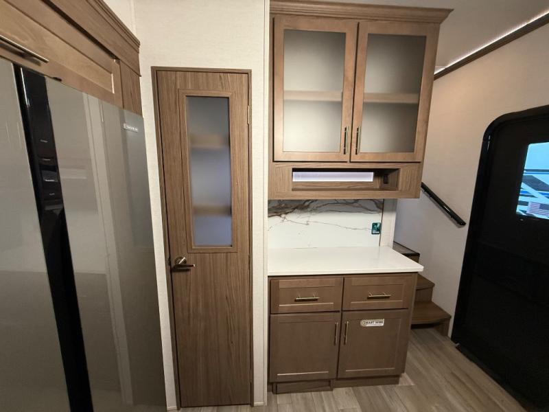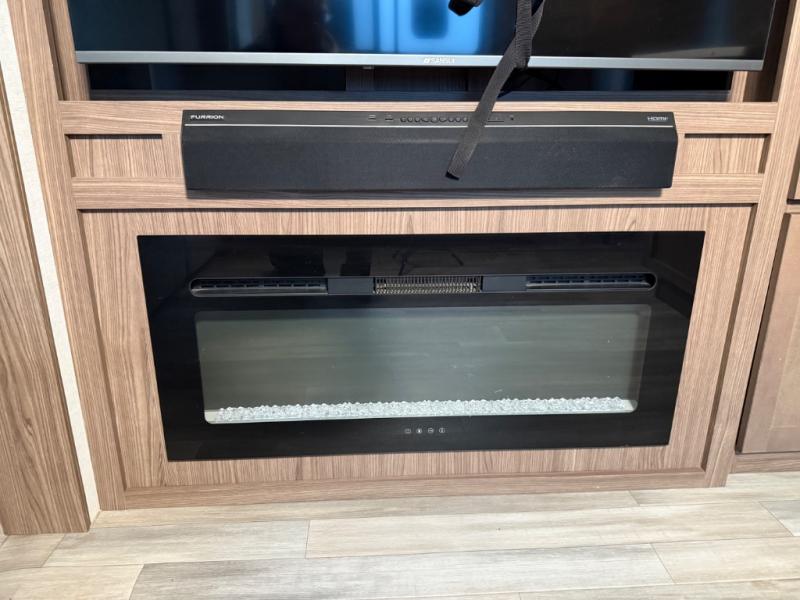 A kitchen island with countertop space makes it easy to prepare meals in this fifth wheel! The floating dinette table has two chairs on one side and a movable ottoman with flip up storage on the other side to keep your games or extra table cloths in. You can store your dishes and snacks inside the hutch/pantry or in the second pantry. The front private bedroom has a queen bed slide but can be switched out for the optional king bed if you like. There is also a dresser and large wardrobe for storage, and either side of the wardrobe has been prepped for a washer and dryer which you could add for those extended trips. The rear living area features a dual recliner theater seat across from an entertainment center with a 50" class HDTV with hidden storage behind it and is also on a swing mount for all to see even at the rear sleeper sofa!