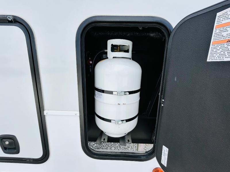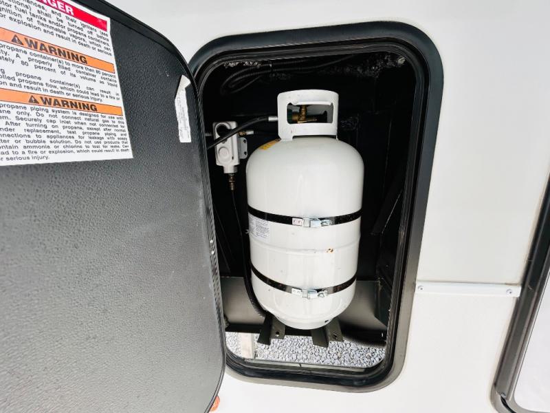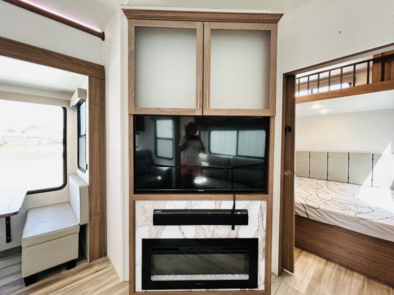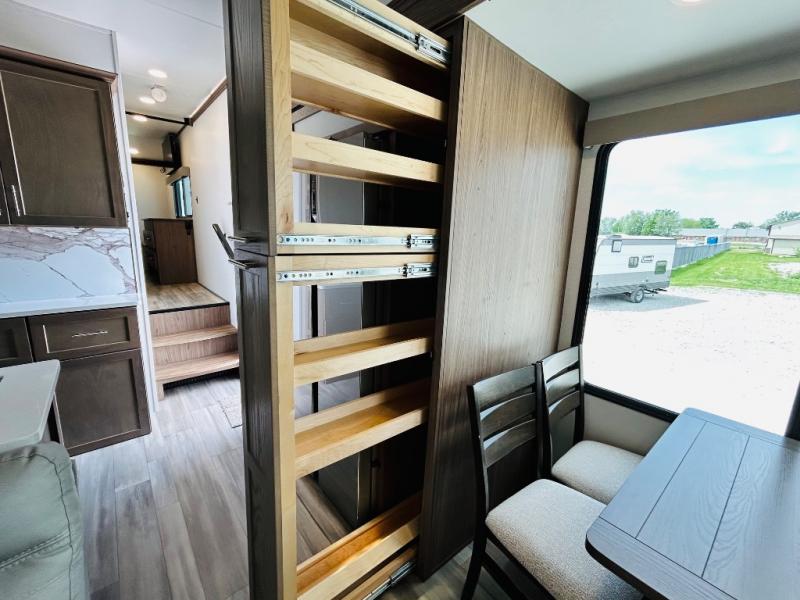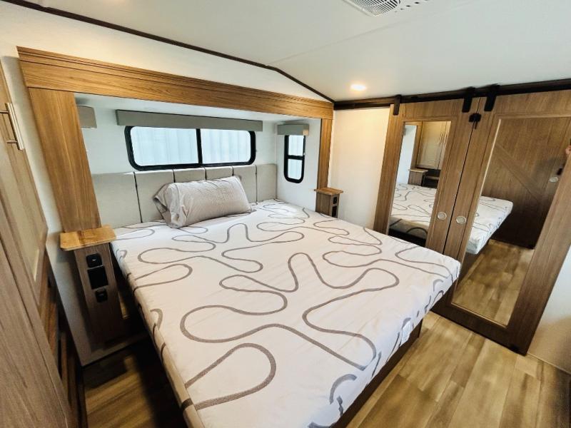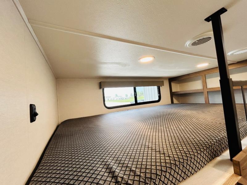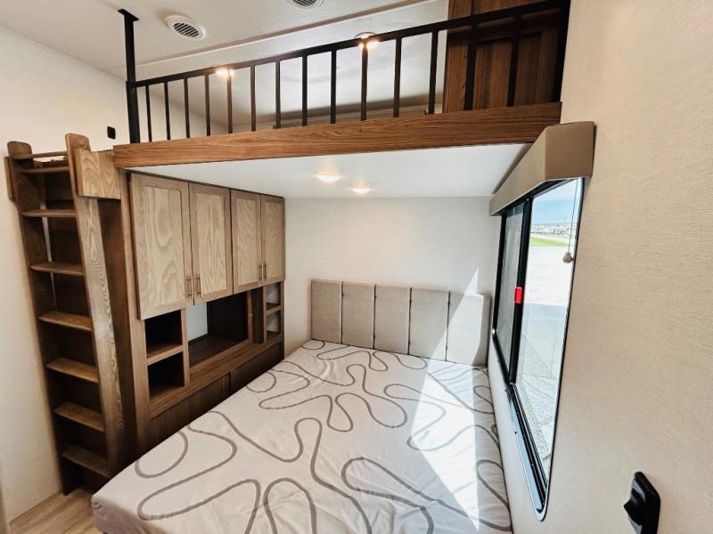The whole gang can join in on the fun in this fifth wheel! The rear private 54" x 74" loft bed features a lower 60" x 70" bed beneath with storage and a TV, and its very own half bathroom with private entry/exit to the outside. There is also an exterior baggage door so you can easily pack gear straight into this room. The living area comes with dual recliner theater seating, a swing out 50" class HDTV, and a floating dinette table with two chairs and a movable ottoman with flip up storage. There is also a 16 cu. ft. 12 volt refrigerator and pull-out pantry here for food storage. And you can easily prepare your best home cooked meals using the three burner cooktop. When you're ready to wind down your night, head to the front private bedroom and relax on the queen bed slide which could be switched out for the optional king bed if you like! This unit also features an outdoor griddle and refrigerator under the loft space.