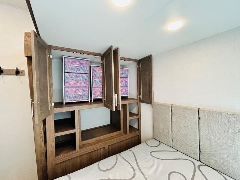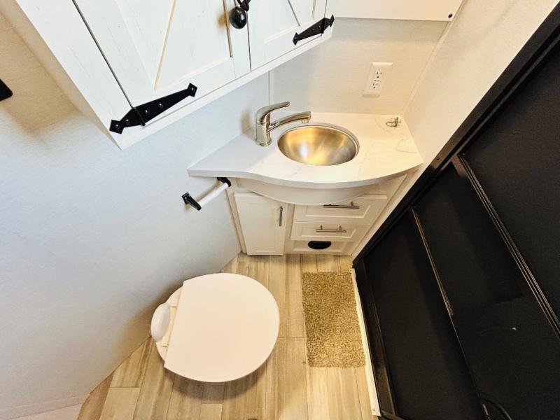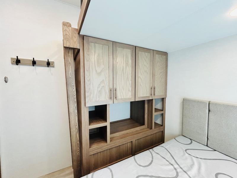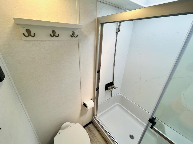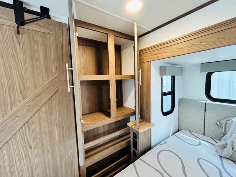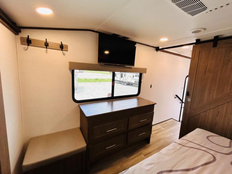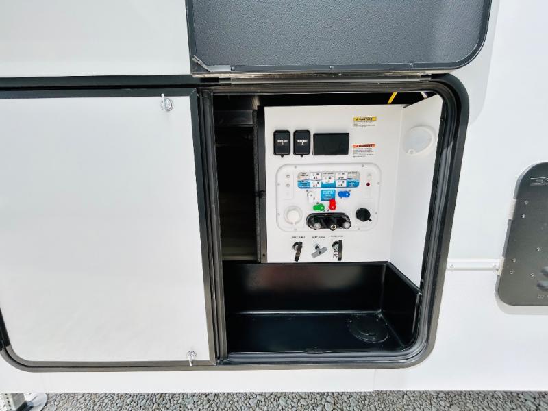 The whole gang can join in on the fun in this fifth wheel! The rear private 54" x 74" loft bed features a lower 60" x 70" bed beneath with storage and a TV, and its very own half bathroom with private entry/exit to the outside. There is also an exterior baggage door so you can easily pack gear straight into this room. The living area comes with dual recliner theater seating, a swing out 50" class HDTV, and a floating dinette table with two chairs and a movable ottoman with flip up storage. There is also a 16 cu. ft. 12 volt refrigerator and pull-out pantry here for food storage. And you can easily prepare your best home cooked meals using the three burner cooktop. When you're ready to wind down your night, head to the front private bedroom and relax on the queen bed slide which could be switched out for the optional king bed if you like! This unit also features an outdoor griddle and refrigerator under the loft space.