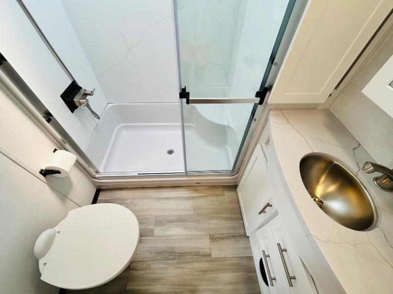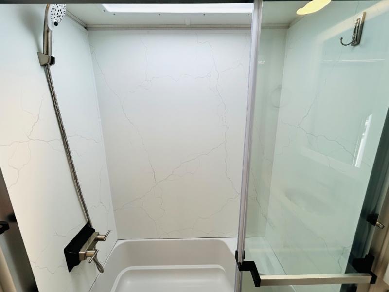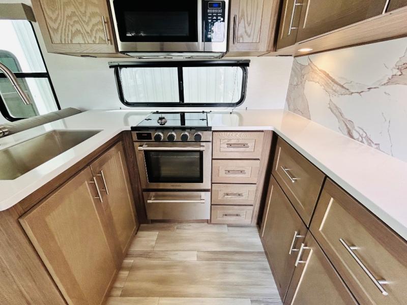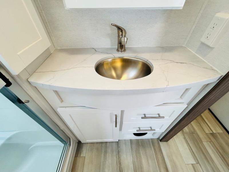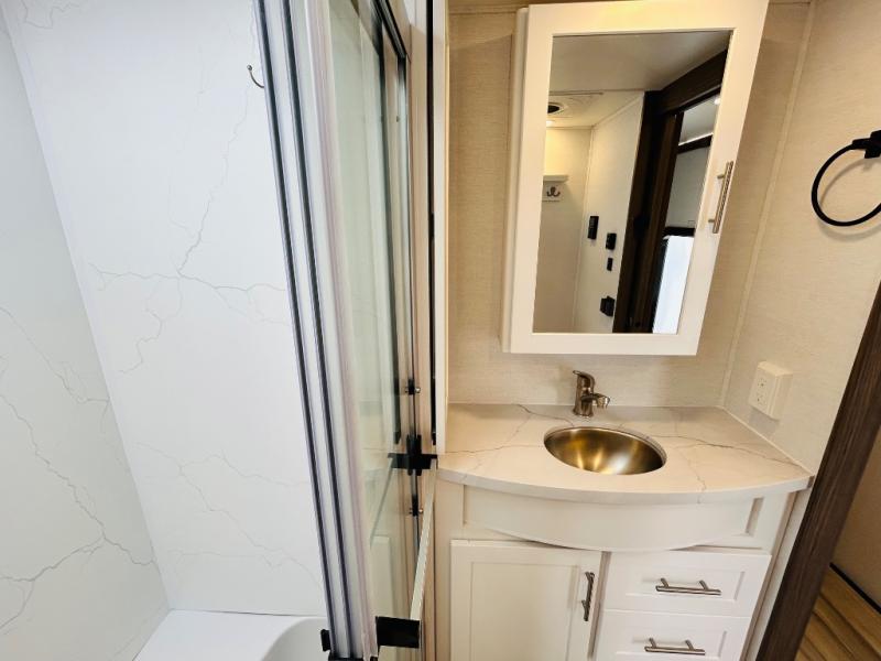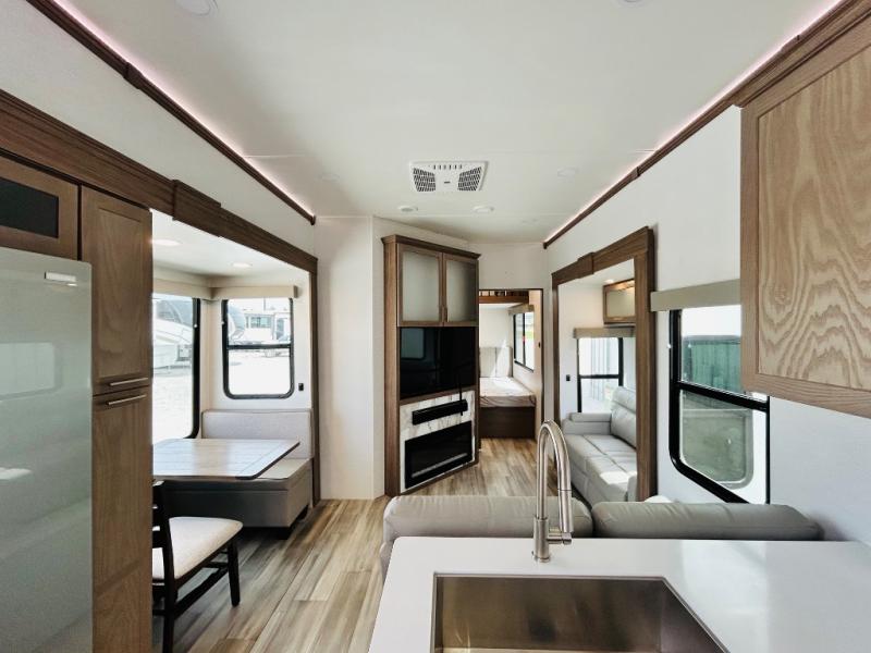 A benchmark chassis creates a space saver upper deck with each one of these Avenue fifth wheels by Alliance RV! The 101 in. wide-body construction gives you more room to walk around and the flush slide out floors throughout prevent any tripping. There are Azdel composite sidewalls inside and out, and a seamless fully walkable PVC roof for extreme durability, zero maintenance, and it is more solar reflective because of the bright white color. Twin 13,500 BTU A/C units provide 27,000 BTUs of cooling power which are ultra quiet and independently controlled keeping you comfortable during your entire trip. And, the fully enclosed and heated underbelly means that you can extend your camping season into the colder months if you like. You are sure to love the "no carpet zone" making each Avenue easy to clean and allergen free, not to mention pet friendly with vinyl flooring throughout. And, strategically placed Atrium windows in the bedroom and living area will not only provide more light, cross ventilation and fresh air, but bring a spectacular view of your surroundings right inside. You can maximize your space throughout with innovative storage solutions like the hidden storage behind the TV, inside the end tables, ottoman, and dinette chairs. Come choose your favorite model today!