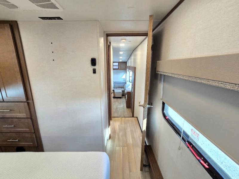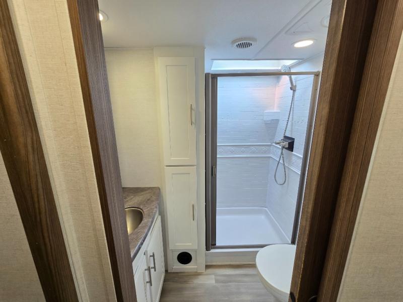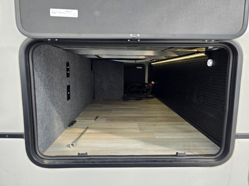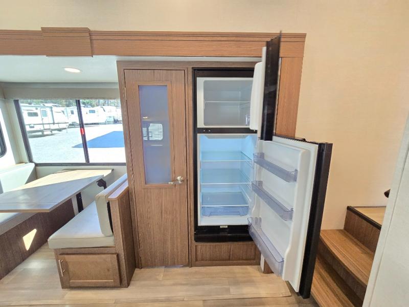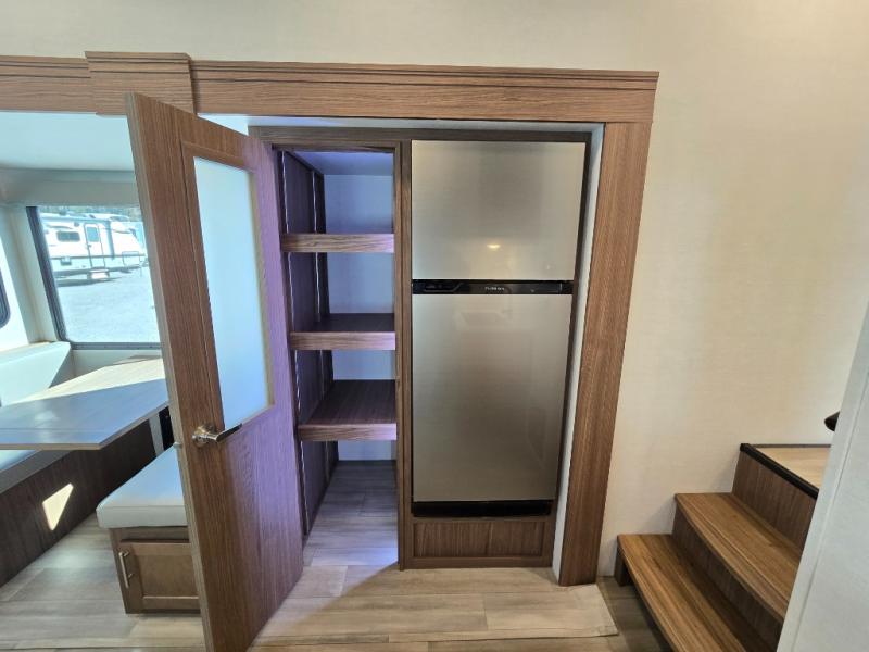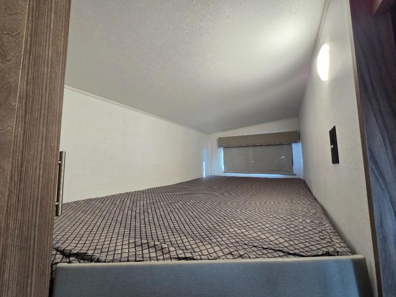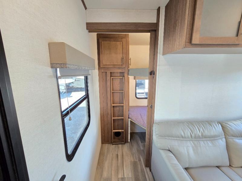 Your family will enjoy traveling in this bunk model including two 42" x 74" bunks featuring storage beneath that can be accessed from outside using the bike storage door, or by lifting up the lower hinged bunk from inside. The combined living room and kitchen area is spacious thanks to the large slide which houses the floating dinette table, the 10 cu. ft. 12V refrigerator, and pantry. There is more seating adjacent to this slide. Here you will find a sofa, and all seating can easily view the swing mount 40" Class HDTV. In front, you will find a spacious side aisle bath including a 30" x 36" shower, toilet, vanity with a sink and medicine cabinet, plus linen storage as well. And don't overlook the front private bedroom with a walk-around queen bed, dual nightstands, plus a bedroom closet to keep your clothes wrinkle-free!