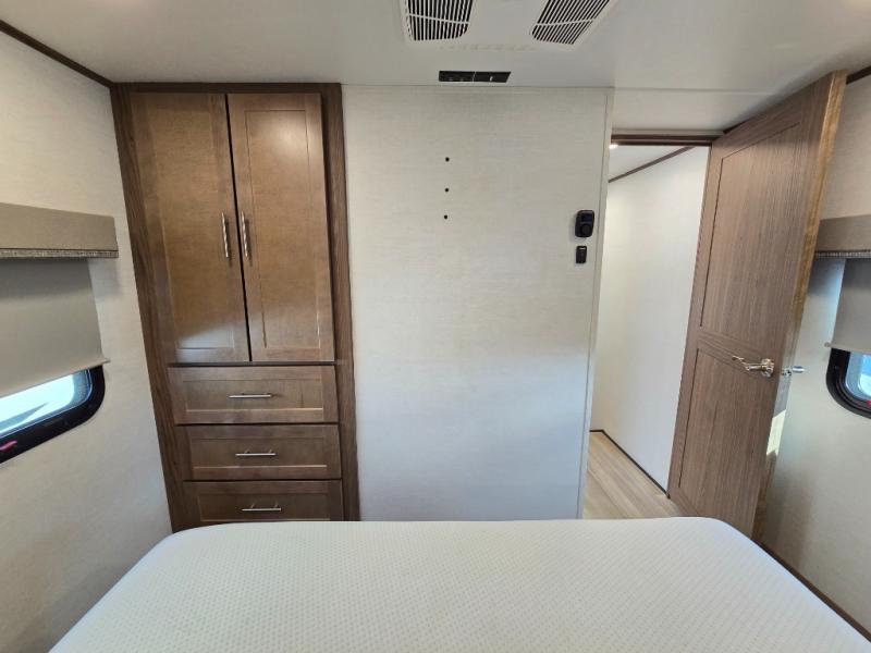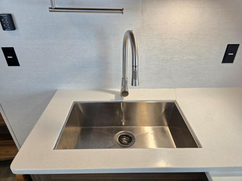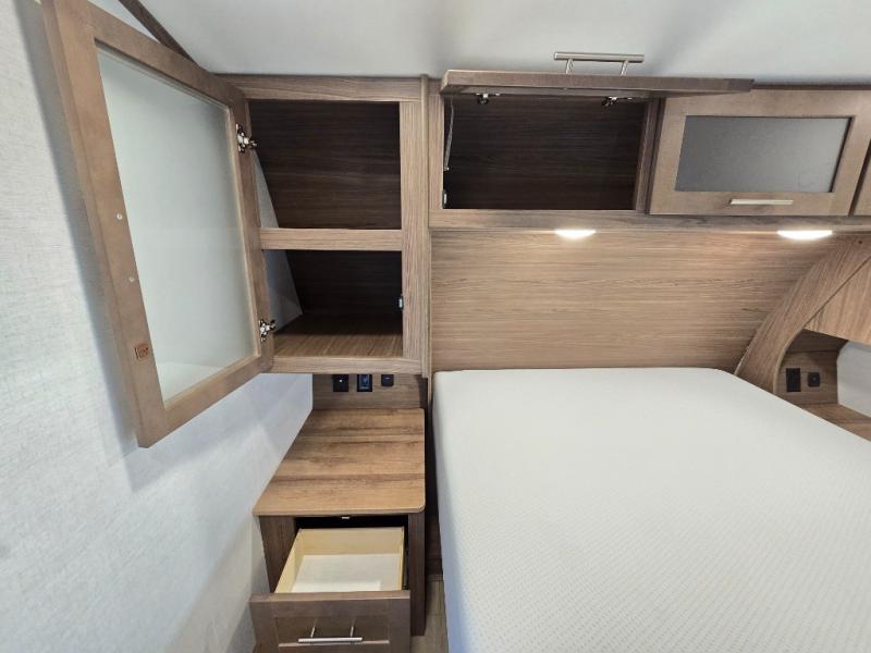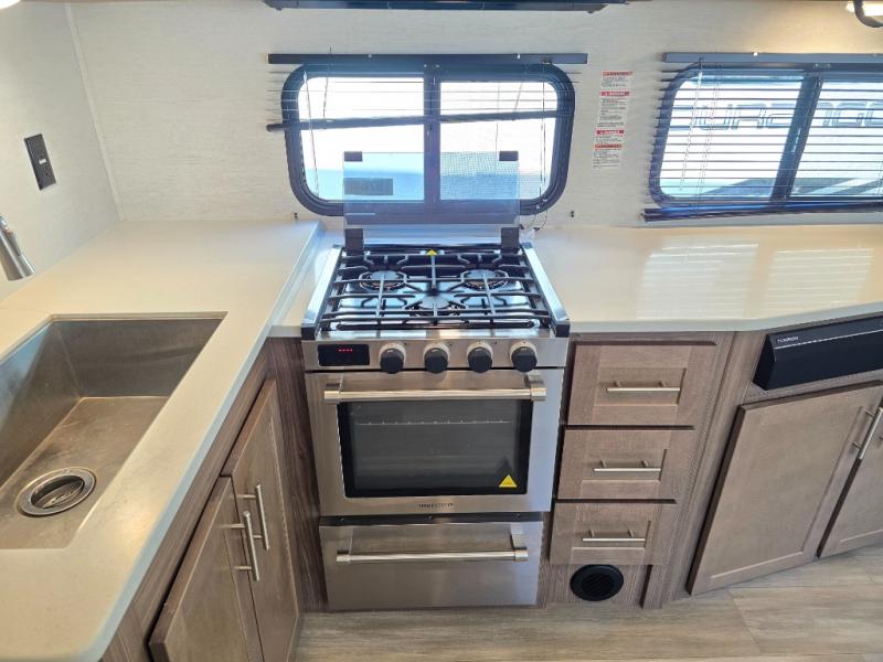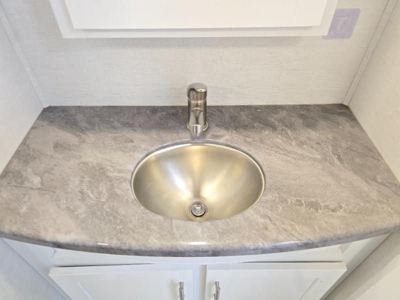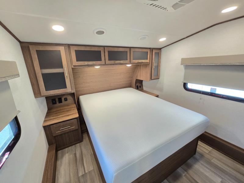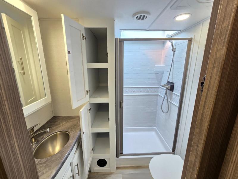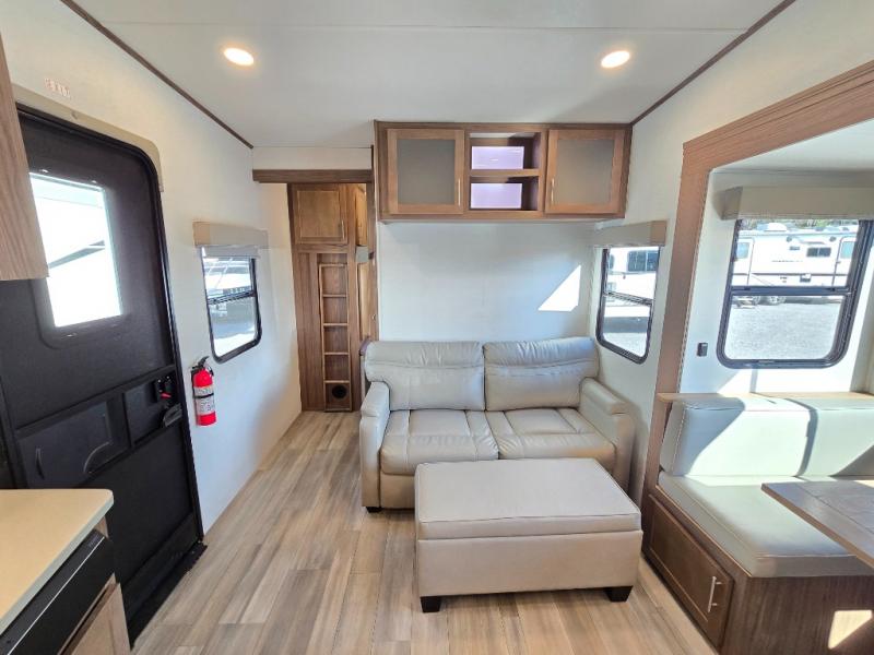 Your family will enjoy traveling in this bunk model including two 42" x 74" bunks featuring storage beneath that can be accessed from outside using the bike storage door, or by lifting up the lower hinged bunk from inside. The combined living room and kitchen area is spacious thanks to the large slide which houses the floating dinette table, the 10 cu. ft. 12V refrigerator, and pantry. There is more seating adjacent to this slide. Here you will find a sofa, and all seating can easily view the swing mount 40" Class HDTV. In front, you will find a spacious side aisle bath including a 30" x 36" shower, toilet, vanity with a sink and medicine cabinet, plus linen storage as well. And don't overlook the front private bedroom with a walk-around queen bed, dual nightstands, plus a bedroom closet to keep your clothes wrinkle-free!