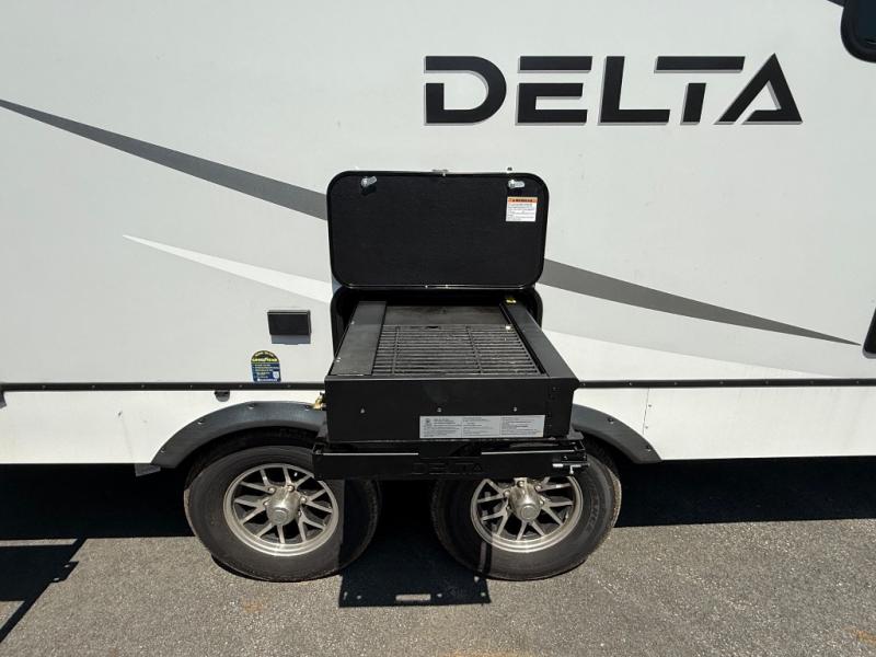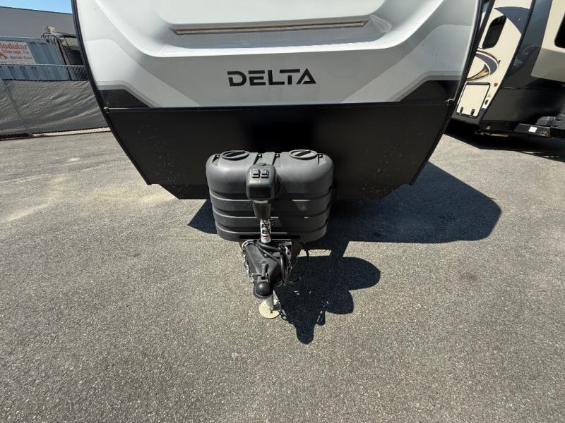 You will love all of your adventures with this Delta travel trailer in tow! This unit is perfect for a couple or even a family of four or six with a queen bed in the front private bedroom, and also using the sofa and U-shaped dinette once converted for more sleeping space. The U-shaped dinette is great for gathering for meals, a board game or game of cards, and the sofa is directly opposite a 40" HDTV which makes viewing enjoyable. You can easily prepare all of your favorite meals and snacks with the kitchen amenities provided inside. A three burner range allows you to easily cook indoors, or you can cook outside using the outdoor griddle/grill if you like. There is a 10 cu. ft. 12V refrigerator to keep all of your perishables and drinks nice and cold, plus a large sink for dishes and cleaning up, and a convenient pull-out trash can and flip-up counter extension as well. You will also appreciate the full rear bath featuring a 30" x 36" shower, toilet, vanity with sink, and linen cabinet for your towels and toiletries.