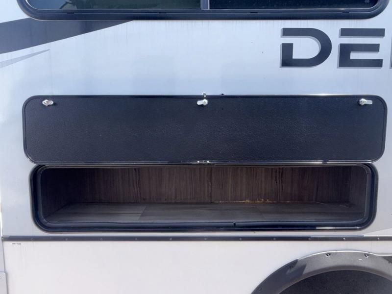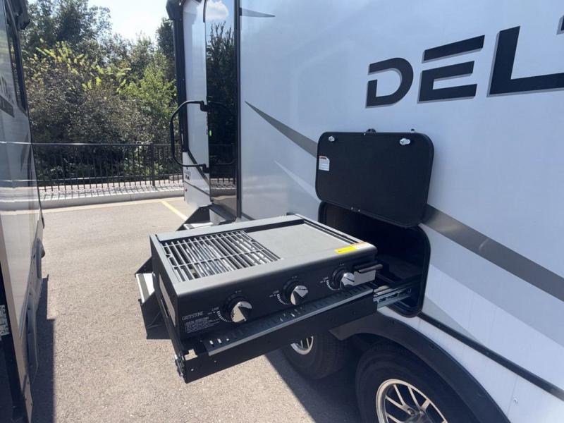 You will love all of your adventures with this Delta travel trailer in tow! This unit is perfect for a couple or even a family of four or six with a queen bed in the front private bedroom, and also using the sofa and U-shaped dinette once converted for more sleeping space. The U-shaped dinette is great for gathering for meals, a board game or game of cards, and the sofa is directly opposite a 40" HDTV which makes viewing enjoyable. You can easily prepare all of your favorite meals and snacks with the kitchen amenities provided inside. A three burner range allows you to easily cook indoors, or you can cook outside using the outdoor griddle/grill if you like. There is a 10 cu. ft. 12V refrigerator to keep all of your perishables and drinks nice and cold, plus a large sink for dishes and cleaning up, and a convenient pull-out trash can and flip-up counter extension as well. You will also appreciate the full rear bath featuring a 30" x 36" shower, toilet, vanity with sink, and linen cabinet for your towels and toiletries.