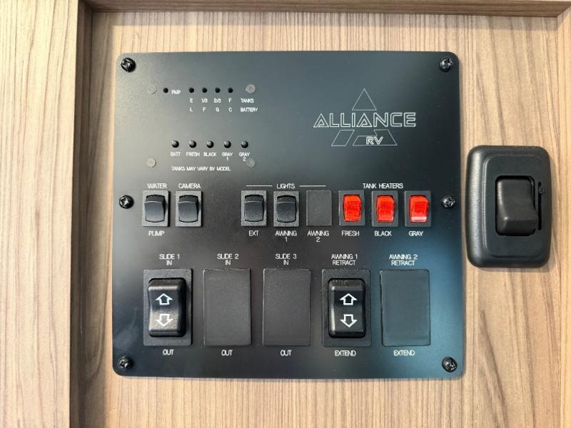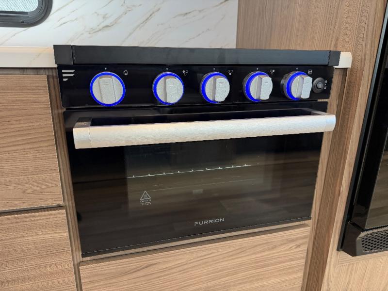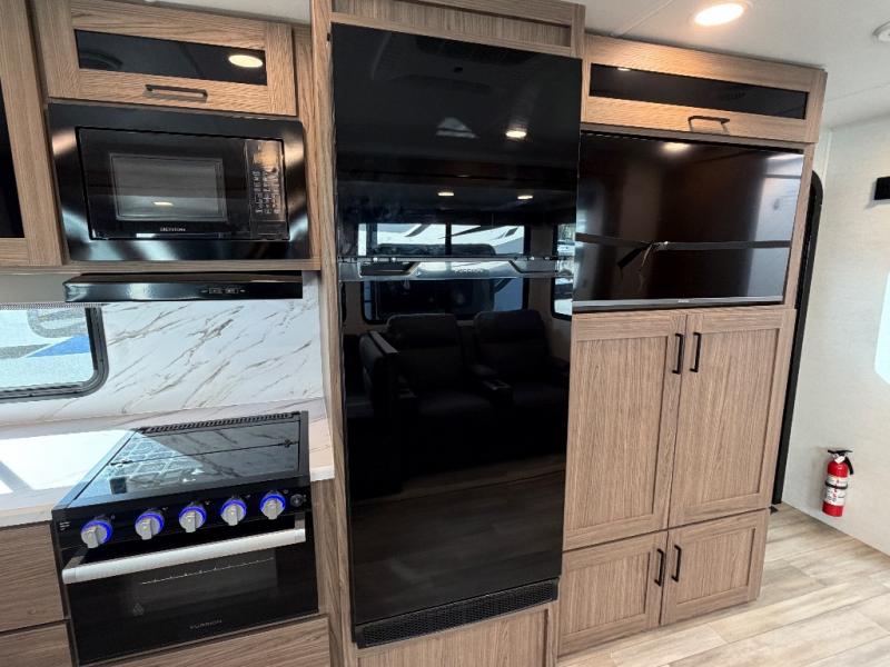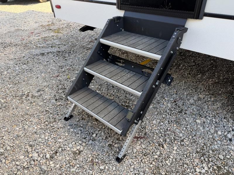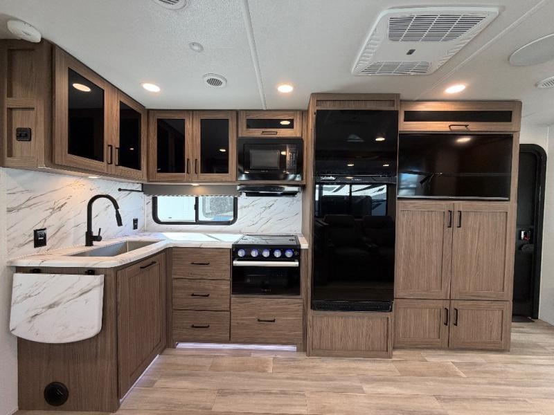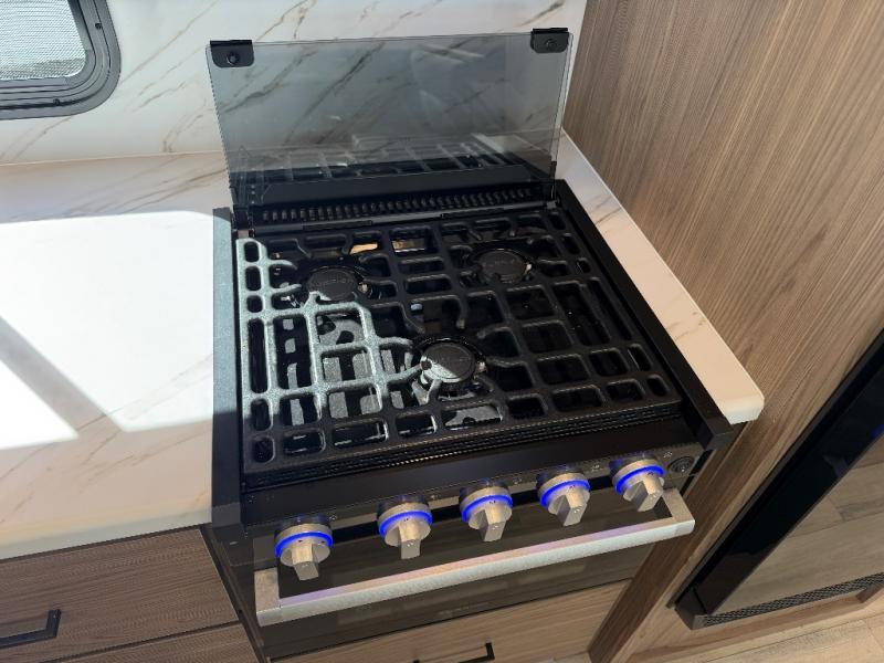 The kitchen is thoughtfully designed to make meal prep a breeze with a three-burner range, 10 cu. ft. 12V refrigerator, large stainless sink, and flip-up counter extension for added workspace. A pull-out trash can helps keep things tidy, and when you’re craving a meal under the open sky, the outdoor griddle offers the perfect setup for grilling.