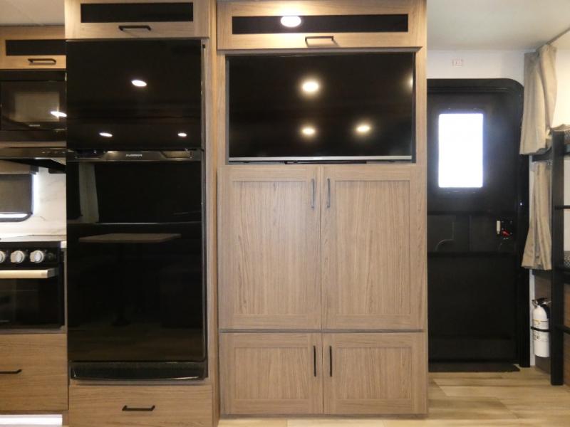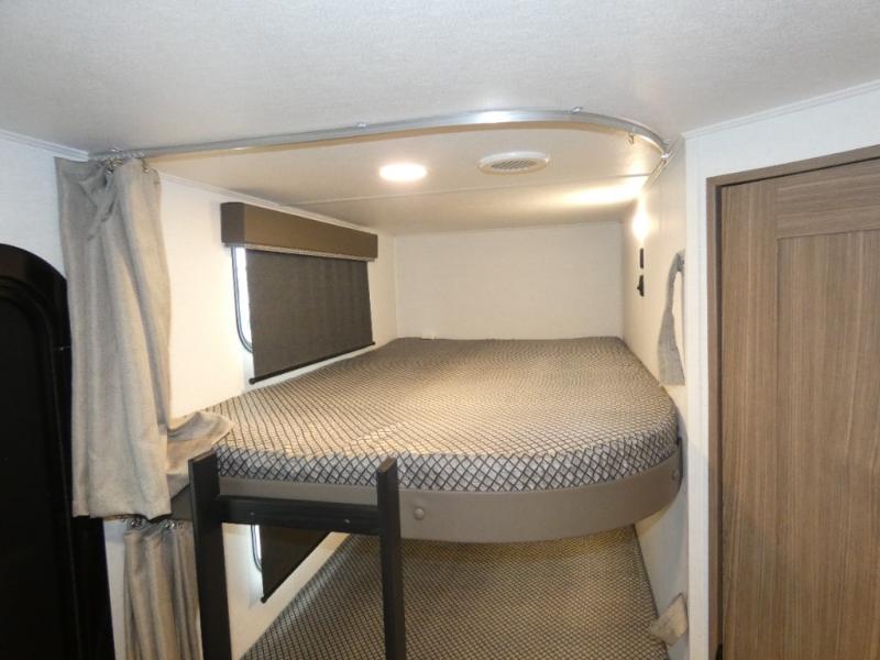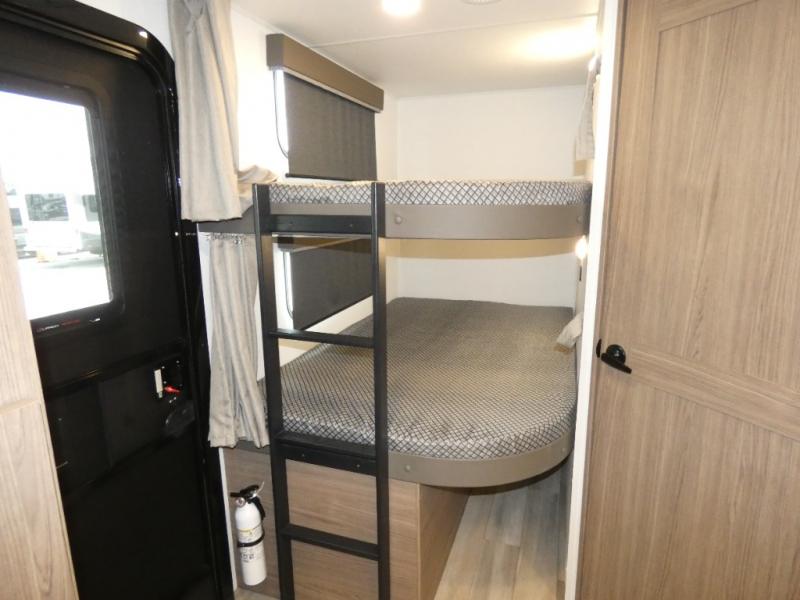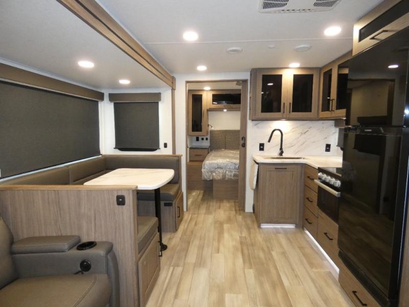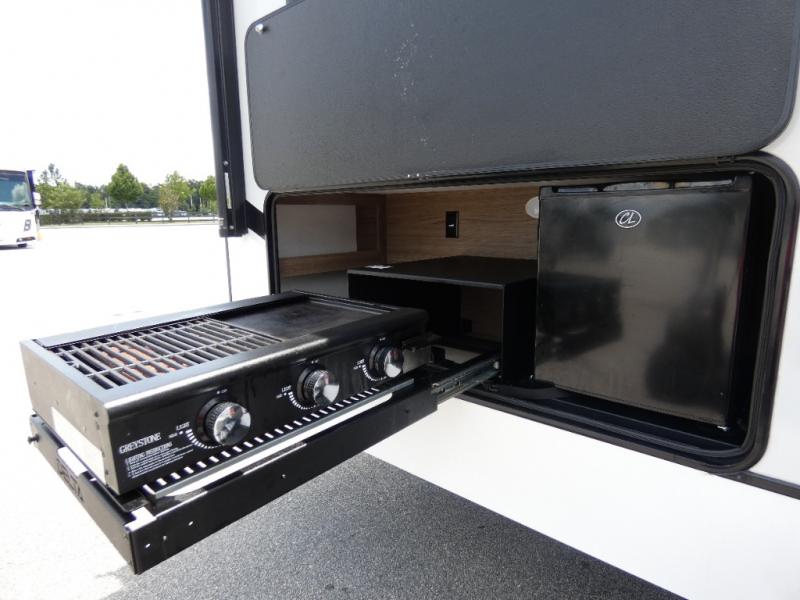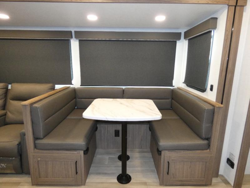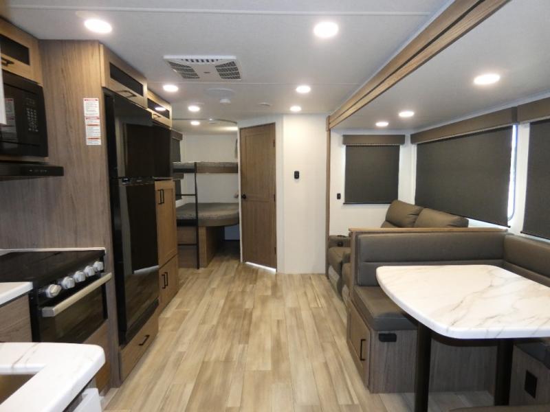 The perfect travel trailer for a larger family or one that enjoys traveling with friends! One large slide opens up the interior living space nice and features a U-shaped dinette and theater seating to provide plenty of seating for everyone. Enjoy the 40" HDTV opposite the seating for a movie indoors, and game night will be easy with everyone at the dinette which can also be converted for added sleeping if needed. The double entry doors will make loading and unloading simple, and allows you to easily slip in and out of the private bedroom for a morning walk. \You can easily prepare all of your favorite meals and snacks with the kitchen amenities provided inside. A three burner range allows you to easily cook indoors, or you can enjoy cooking outside using the outdoor griddle/grill if you like. There is a 10 cu. ft. 12V refrigerator to keep all of your perishables and drinks nice and cold, plus a large sink for dishes and cleaning up, and there is also a flip-up counter extension for more prep space. You will also appreciate the rear corner bath featuring a 30" x 36" shower, vanity with sink, soft close porcelain toilet with foot flush, and linen cabinet for your towels.