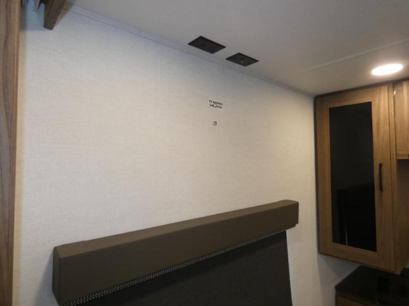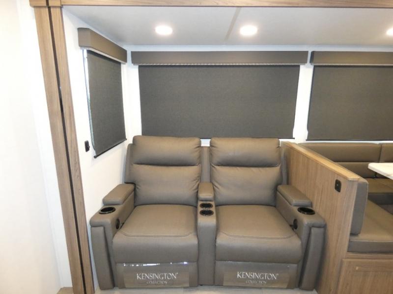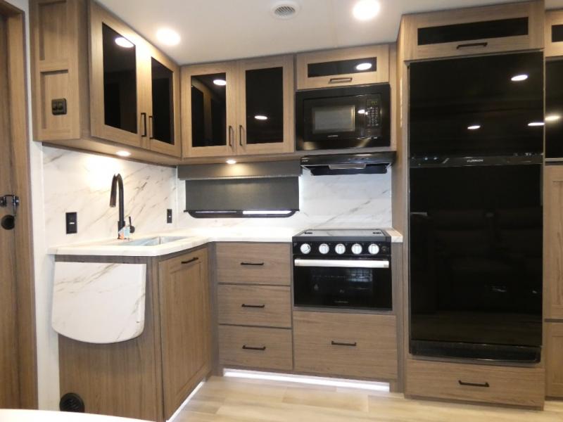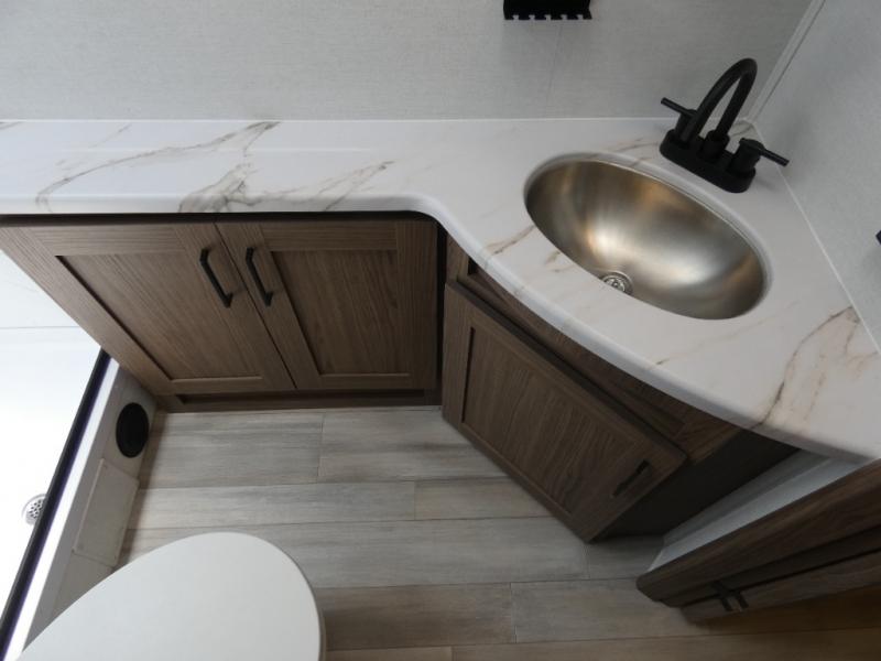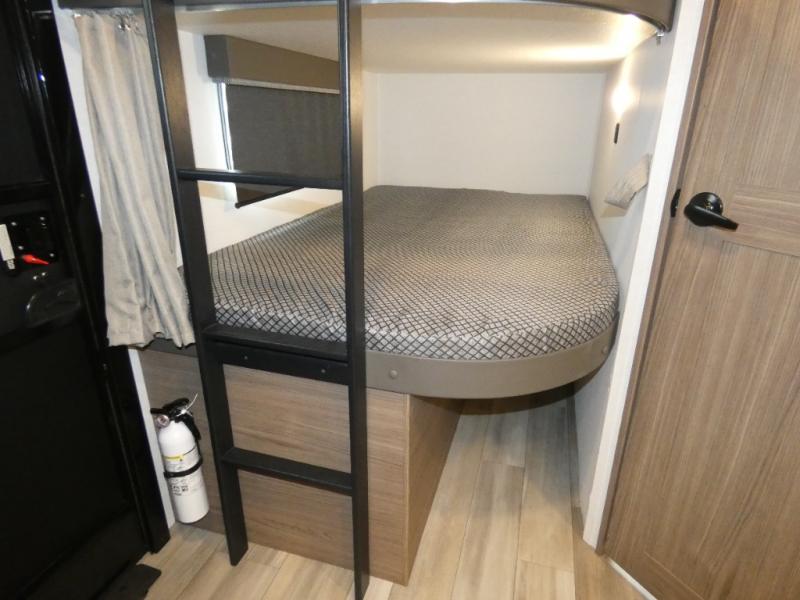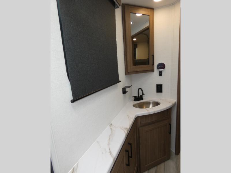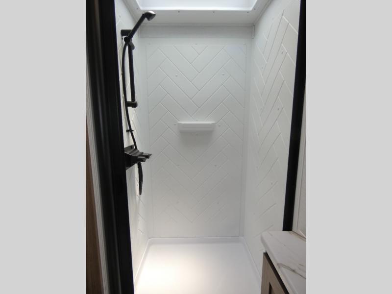The perfect travel trailer for a larger family or one that enjoys traveling with friends! One large slide opens up the interior living space nice and features a U-shaped dinette and theater seating to provide plenty of seating for everyone. Enjoy the 40" HDTV opposite the seating for a movie indoors, and game night will be easy with everyone at the dinette which can also be converted for added sleeping if needed. The double entry doors will make loading and unloading simple, and allows you to easily slip in and out of the private bedroom for a morning walk. \You can easily prepare all of your favorite meals and snacks with the kitchen amenities provided inside. A three burner range allows you to easily cook indoors, or you can enjoy cooking outside using the outdoor griddle/grill if you like. There is a 10 cu. ft. 12V refrigerator to keep all of your perishables and drinks nice and cold, plus a large sink for dishes and cleaning up, and there is also a flip-up counter extension for more prep space. You will also appreciate the rear corner bath featuring a 30" x 36" shower, vanity with sink, soft close porcelain toilet with foot flush, and linen cabinet for your towels.