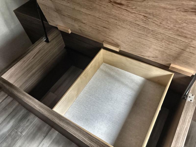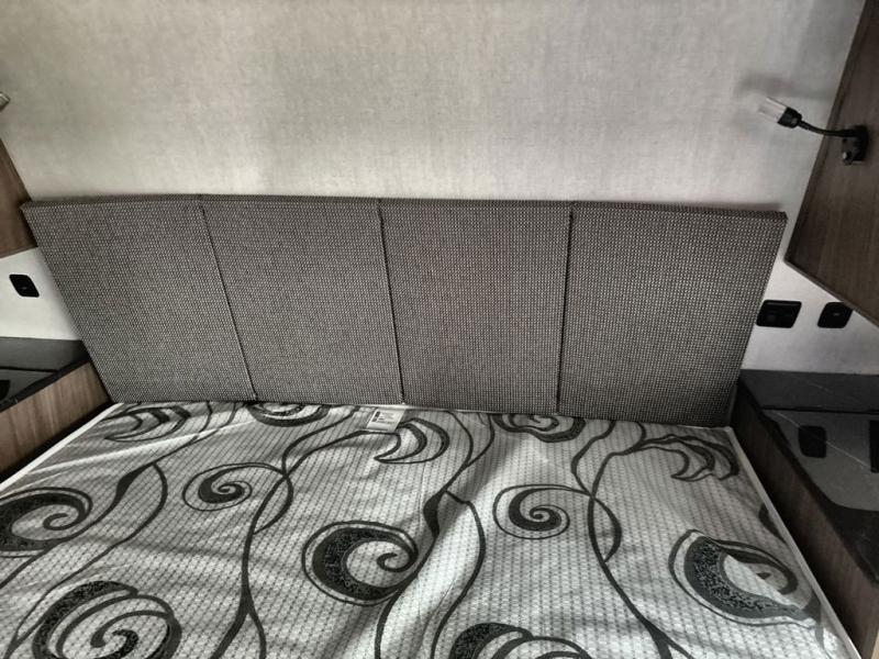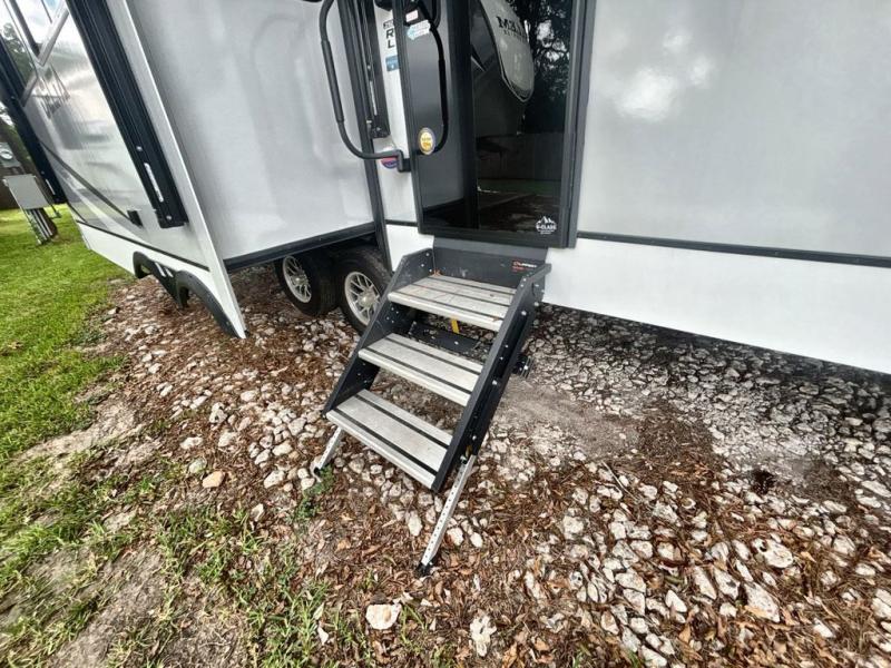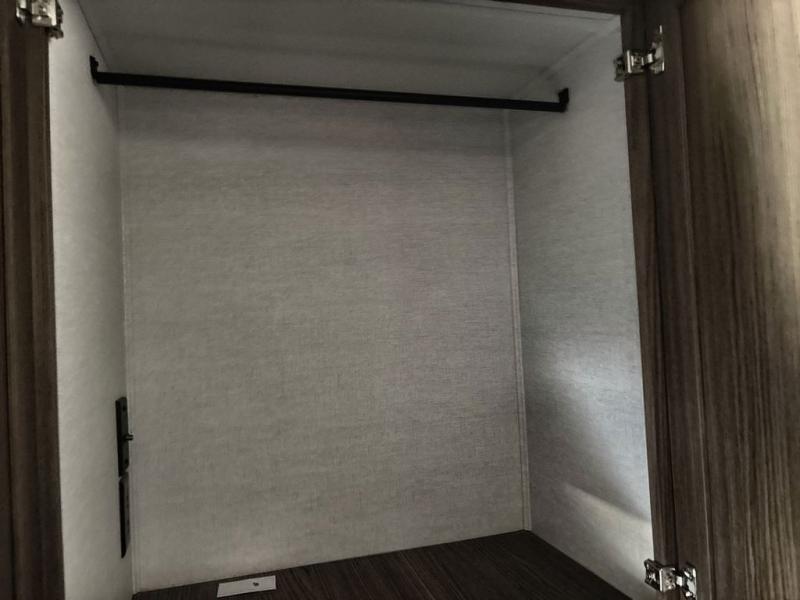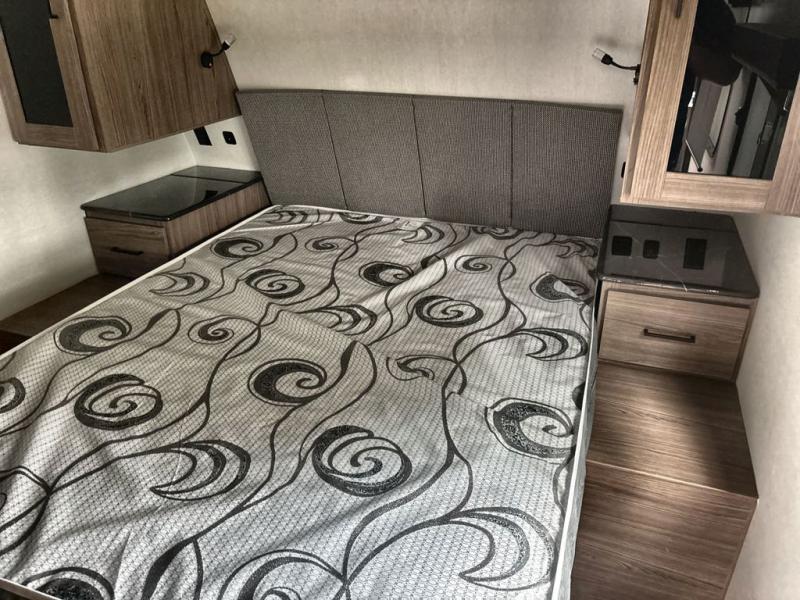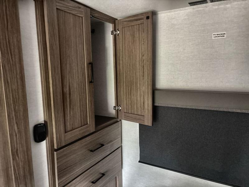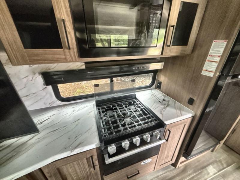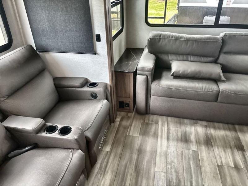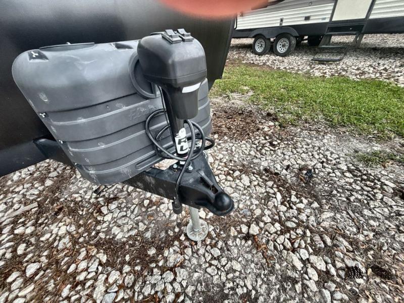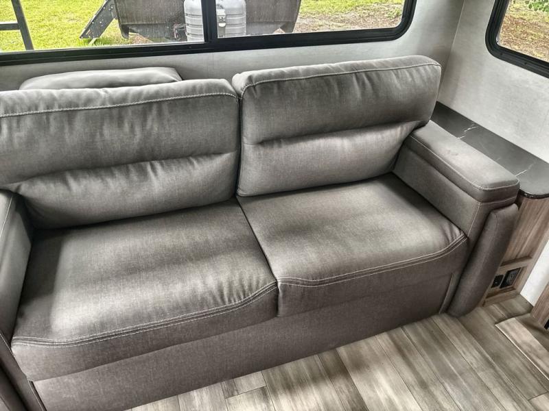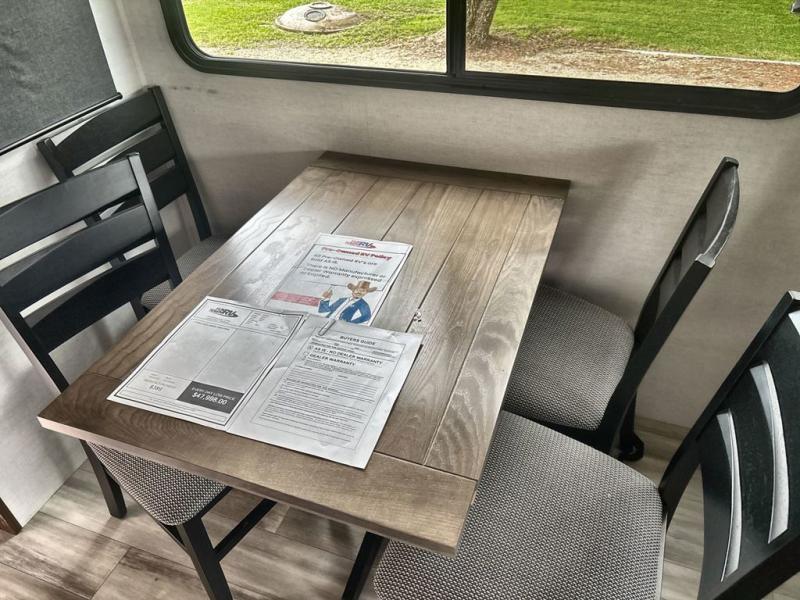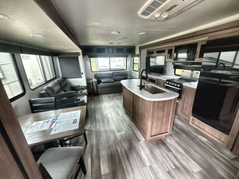 You will feel right at home camping in this travel trailer! The rear living area has a rear sofa and a set of theater seating conveniently across from the entertainment center with a 50" class HDTV above a pull-out fireplace storage for a cozy evening indoors. Prepare your best home cooked meals with the three burner cooktop, kitchen island which even has a tip-out trash can, and 10 cu. ft. 12V refrigerator. Enjoy your meals at the free standing dinette then either freshen up in the full bathroom with the 30" x 36" shower or head outside to relax under one of the two awnings. The front private bedroom has a queen bed for you to lay your head on at night and has wardrobe nightstands for your items!