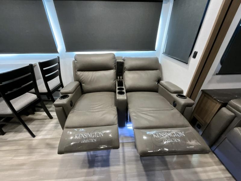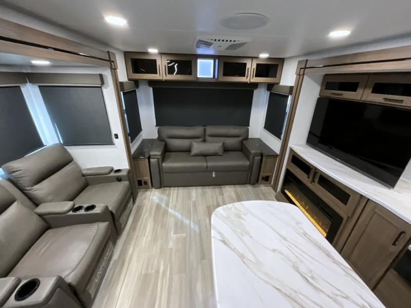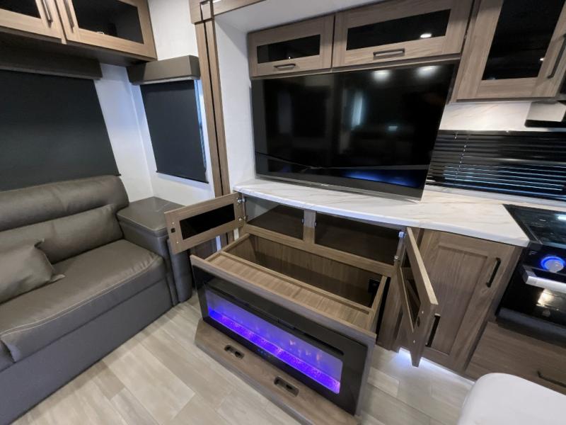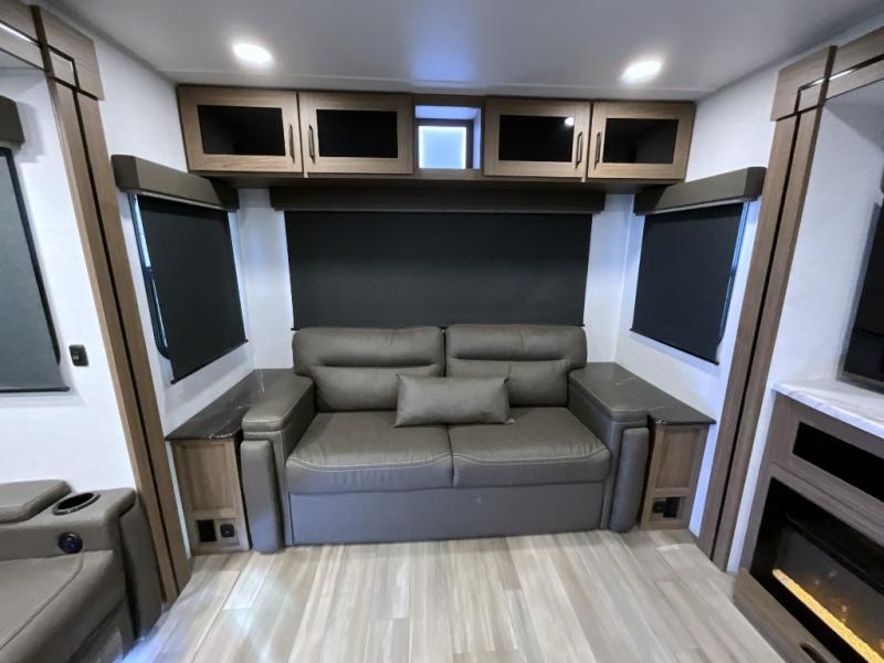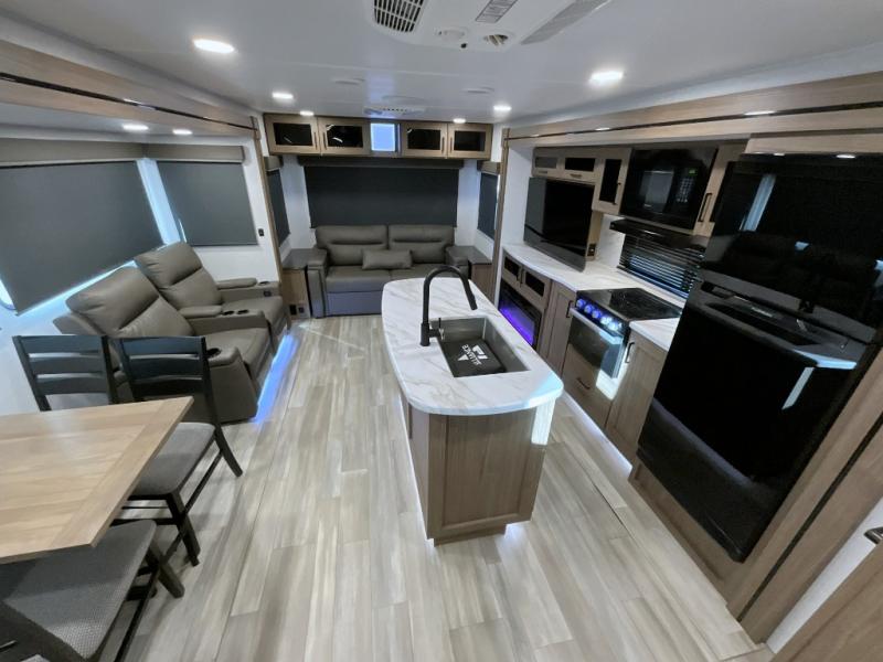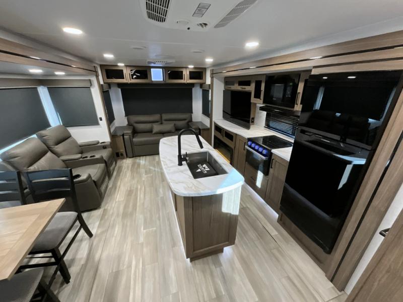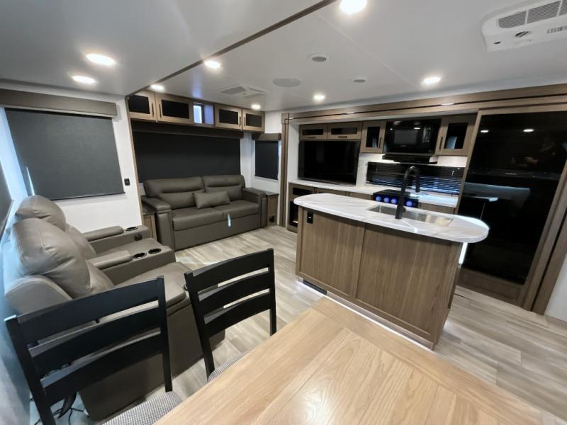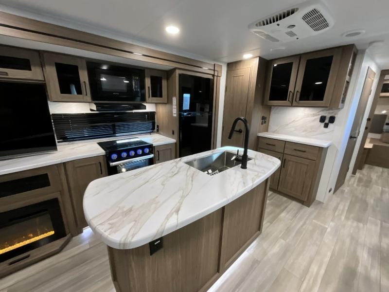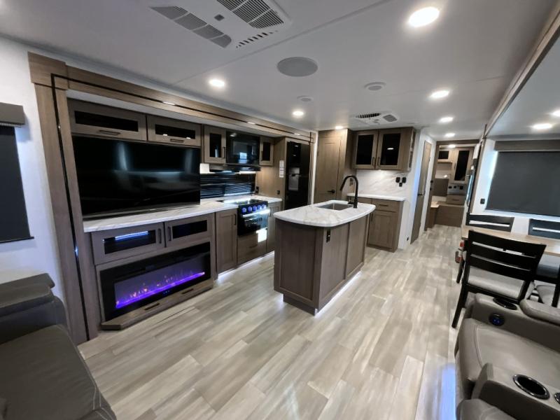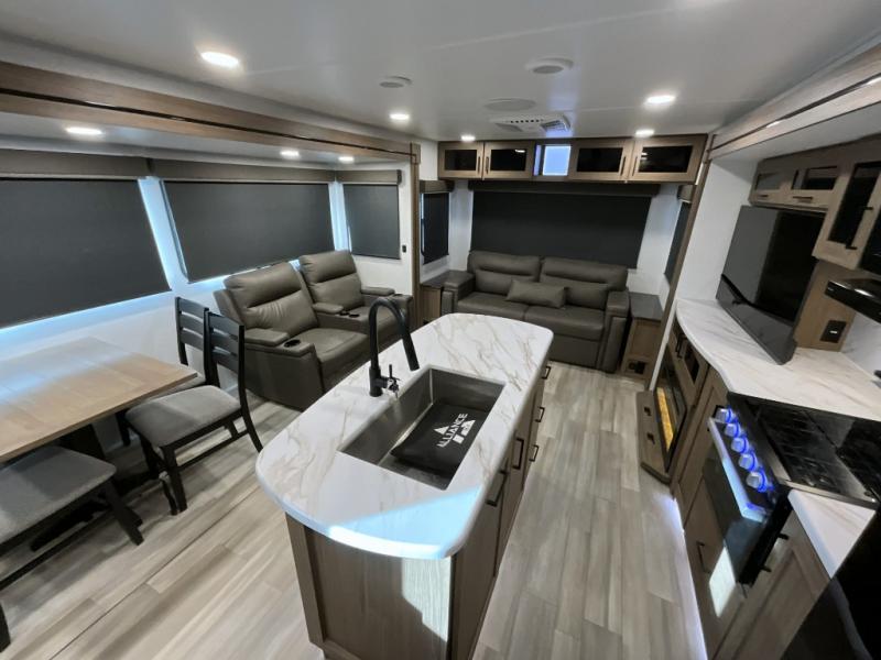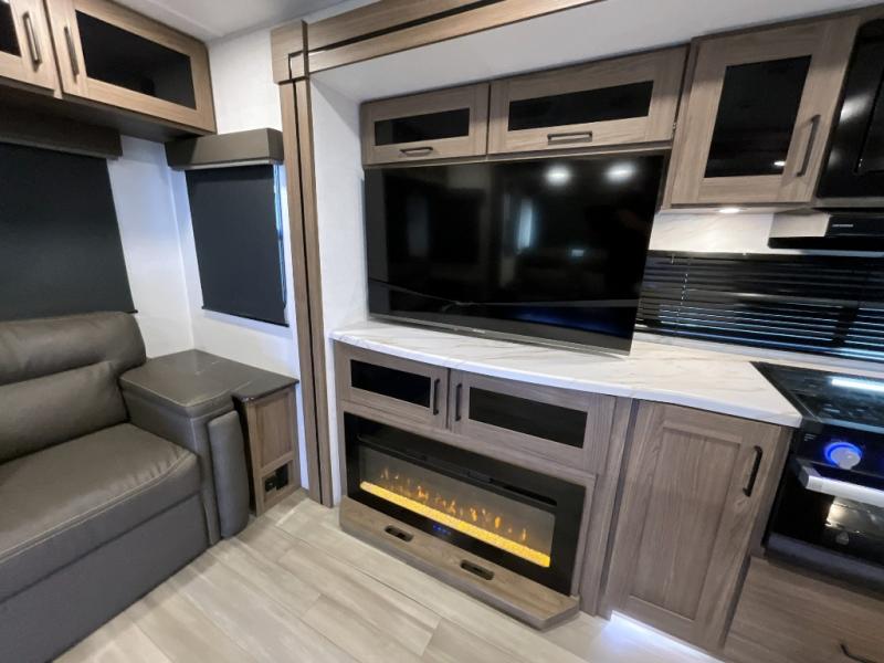 You will feel right at home camping in this travel trailer! The rear living area has a rear sofa and a set of theater seating conveniently across from the entertainment center with a 50" class HDTV above a pull-out fireplace storage for a cozy evening indoors. Prepare your best home cooked meals with the three burner cooktop, kitchen island which even has a tip-out trash can, and 10 cu. ft. 12V refrigerator. Enjoy your meals at the free standing dinette then either freshen up in the full bathroom with the 30" x 36" shower or head outside to relax under one of the two awnings. The front private bedroom has a queen bed for you to lay your head on at night and has wardrobe nightstands for your items!