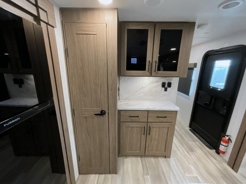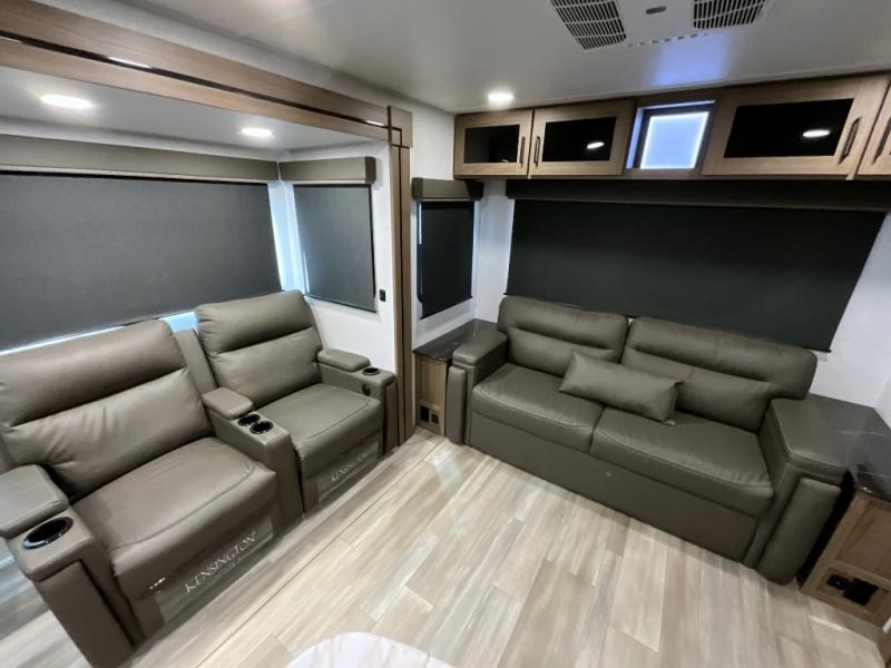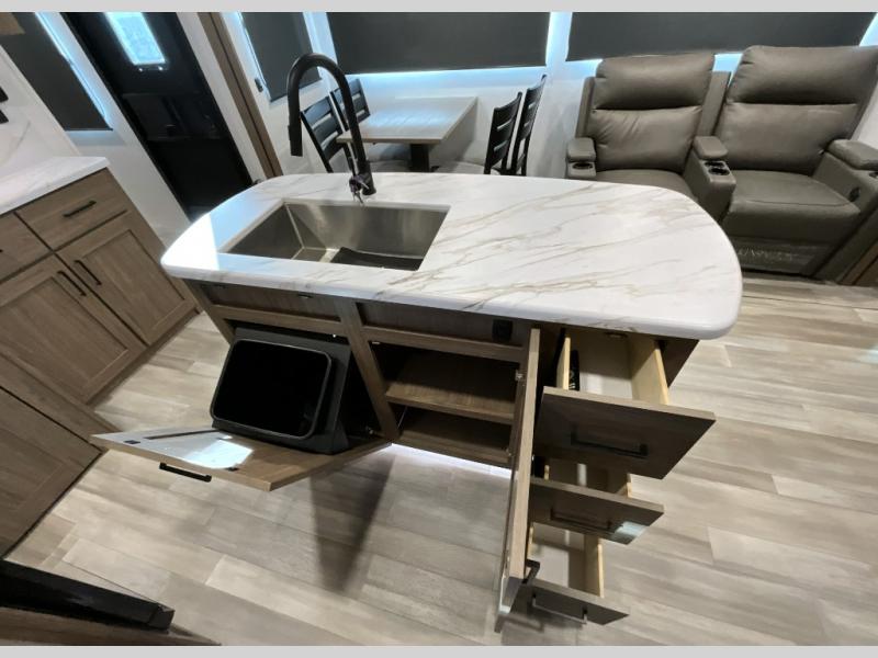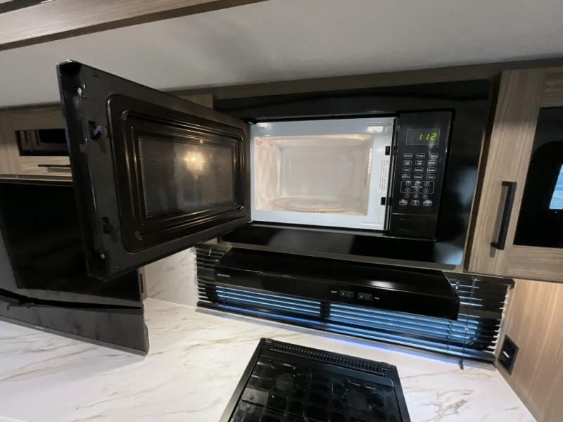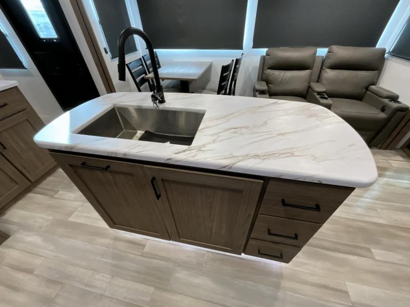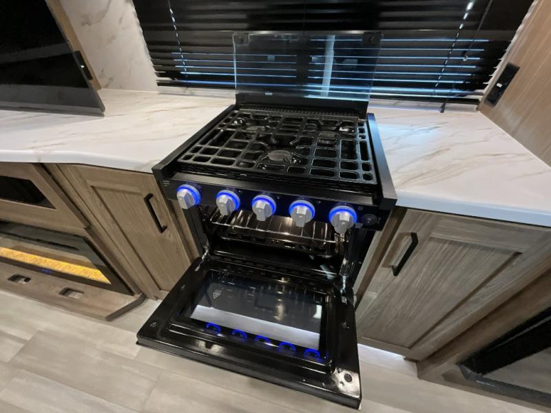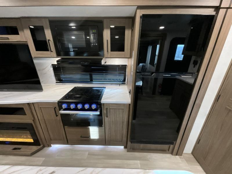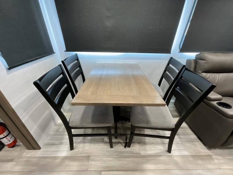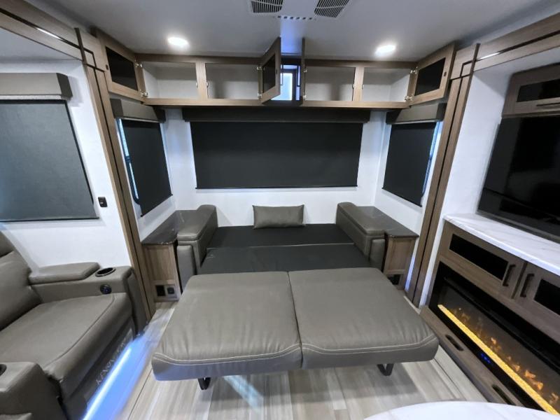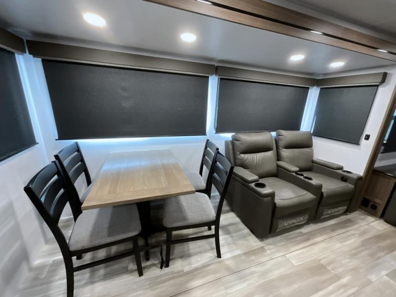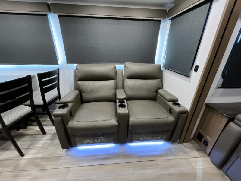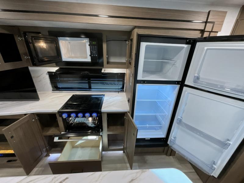 You will feel right at home camping in this travel trailer! The rear living area has a rear sofa and a set of theater seating conveniently across from the entertainment center with a 50" class HDTV above a pull-out fireplace storage for a cozy evening indoors. Prepare your best home cooked meals with the three burner cooktop, kitchen island which even has a tip-out trash can, and 10 cu. ft. 12V refrigerator. Enjoy your meals at the free standing dinette then either freshen up in the full bathroom with the 30" x 36" shower or head outside to relax under one of the two awnings. The front private bedroom has a queen bed for you to lay your head on at night and has wardrobe nightstands for your items!