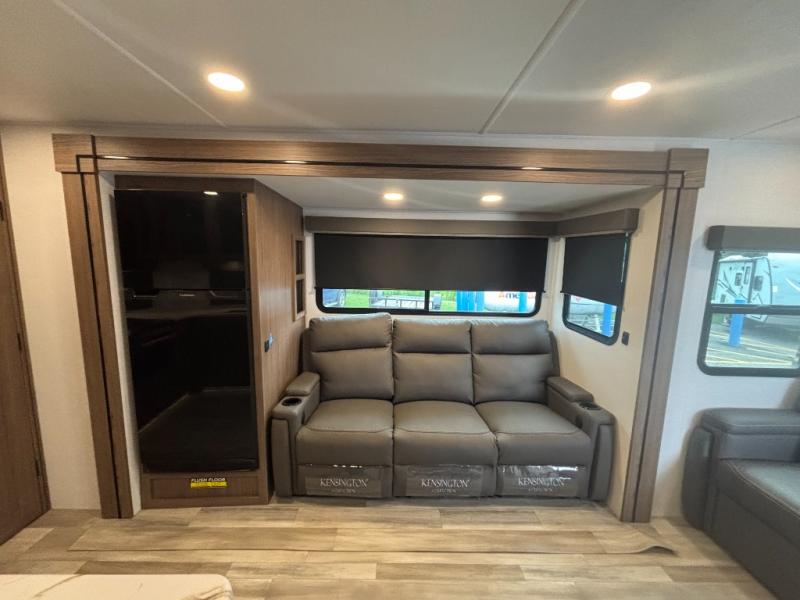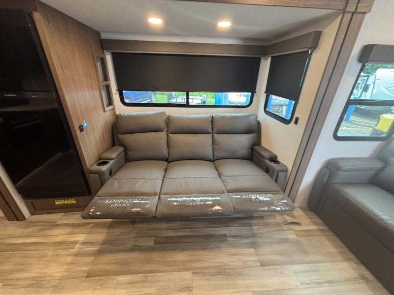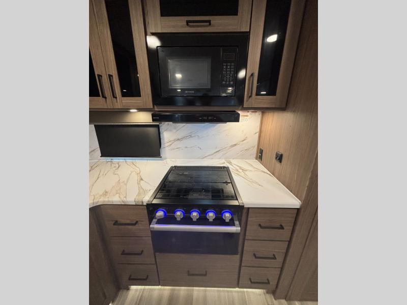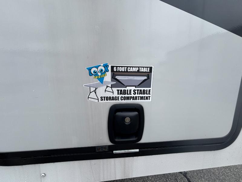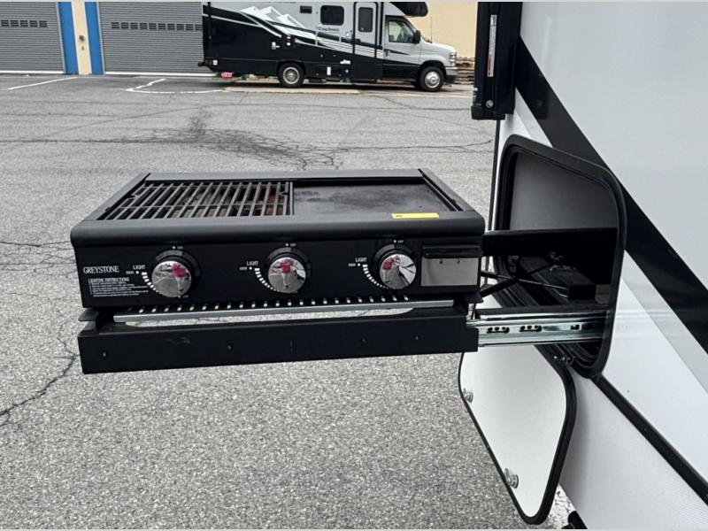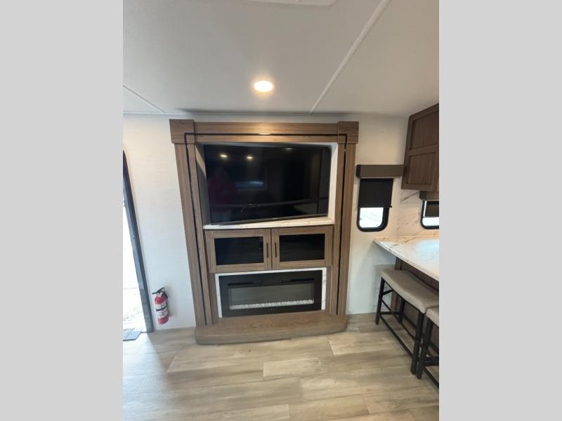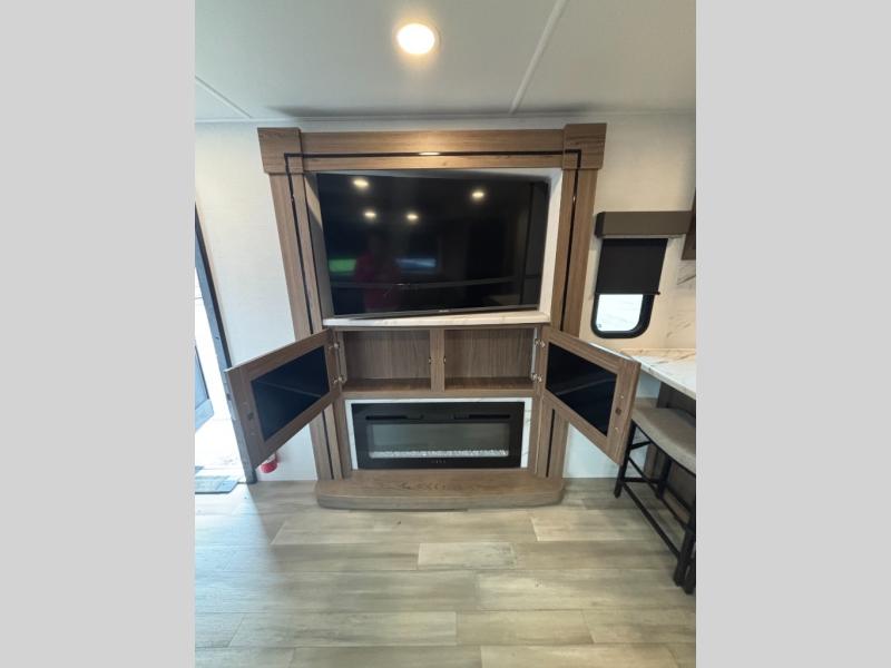 Start camping in luxury with this travel trailer! Prepare your best home cooked meals in the rear kitchen with the three burner cooktop, 10 cu. ft. 12V refrigerator, tip-out trash can, and even two bar stools to enjoy your morning coffee while reading the newspaper. Freshen up in the full bathroom with the 30" x 36" shower or head outside to relax under one of the two awnings. There is even an outdoor griddle/grill underneath one of the awnings to protect you while you grill up some juicy burgers, plus an outside 32" TV. The front private bedroom has a queen bed for you to lay your head on at night and has wardrobe nightstands for your items. Relax in true comfort each night on one of the two furniture spots in front of the entertainment center with a 50" class HDTV with a fireplace below it!