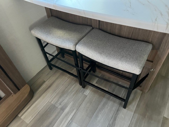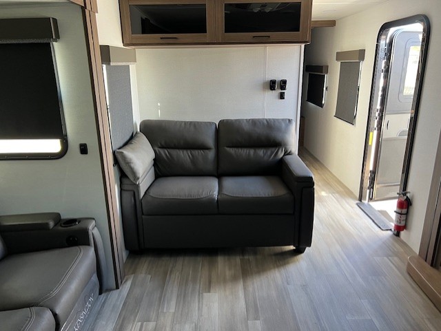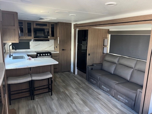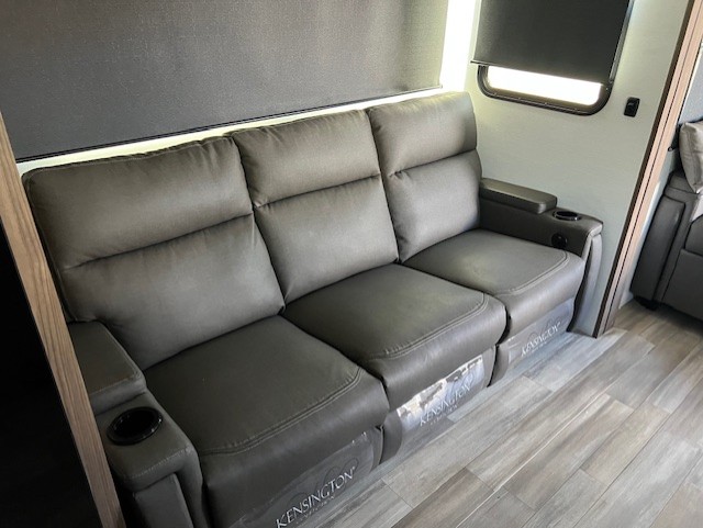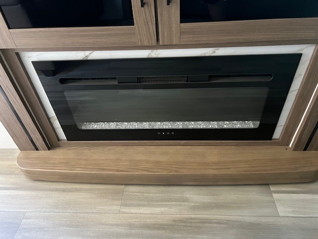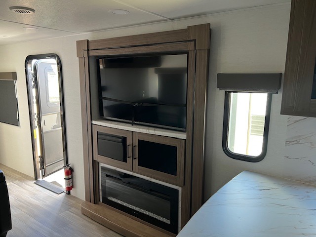 Start camping in luxury with this travel trailer! Prepare your best home cooked meals in the rear kitchen with the three burner cooktop, 10 cu. ft. 12V refrigerator, tip-out trash can, and even two bar stools to enjoy your morning coffee while reading the newspaper. Freshen up in the full bathroom with the 30" x 36" shower or head outside to relax under one of the two awnings. There is even an outdoor griddle/grill underneath one of the awnings to protect you while you grill up some juicy burgers, plus an outside 32" TV. The front private bedroom has a queen bed for you to lay your head on at night and has wardrobe nightstands for your items. Relax in true comfort each night on one of the two furniture spots in front of the entertainment center with a 50" class HDTV with a fireplace below it!