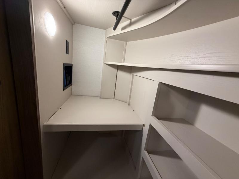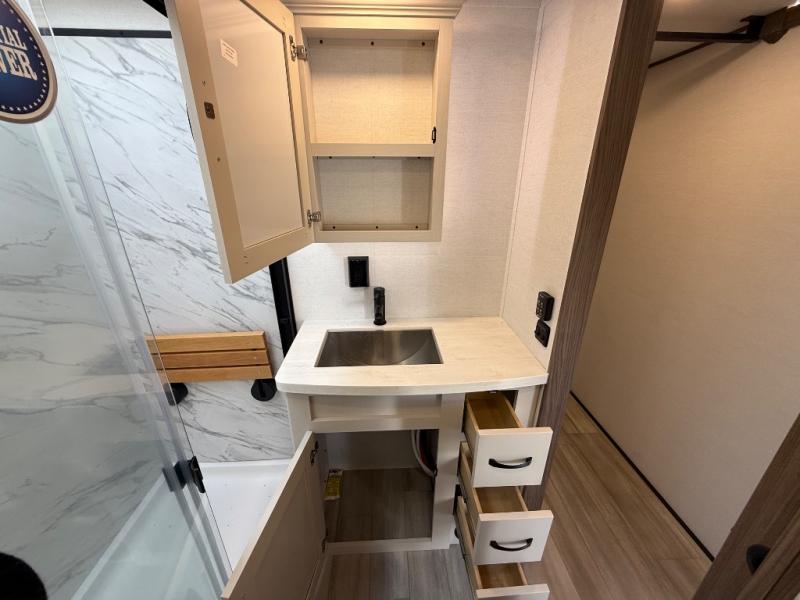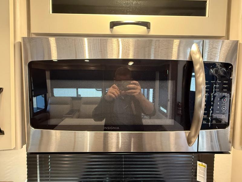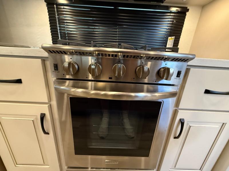 Search for the best views, the nicest RV park, or a place you haven't seen for years with this Paradigm in tow! There is a king bed slide in the master bedroom, a Smart TV, and a dresser with flip-up hidden storage for your belongings. The full bathroom offers a large residential shower, a porcelain toilet with a soft close seat, and storage for your linens, while the kitchen gives you two pantries, an island with a large undermount single basin sink and dishwasher prep if you want the option for easy clean up. You will also have an Insignia residential microwave and range, plus a 3.73 cu. ft. oven to make meals. When you're ready to relax for the evening, head to the rear living area to enjoy the dual recliner love seat across from the 50" Smart TV and fireplace!
