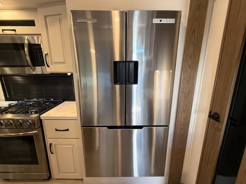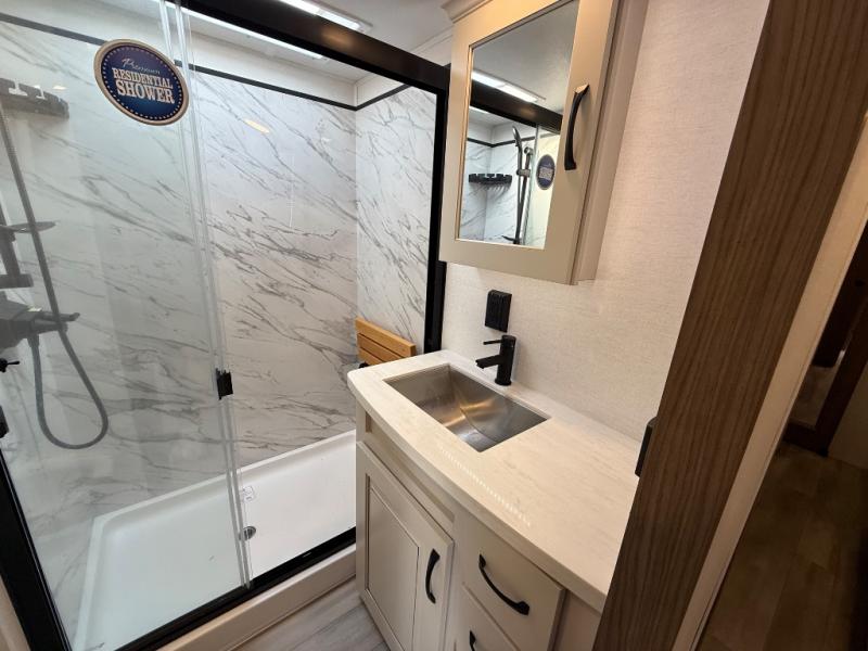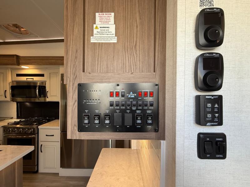 The Paradigm fifth wheels by Alliance RV are functional, high-quality, and luxurious for an unforgettable camping experience. There are three A/C units and a 40K BTU furnace to keep you comfortable year around, and you'll appreciate additional convenient amenities, like the all-in-one enclosed/heated utility center and the color coded and numbered wiring. A Rota-Flex pin box comes standard for hassle-free towing, along with Super-G 4,400 lb. rated tires and Dexter 7,000 lb. axles. You'll love the kitchen with its LG solid surface countertops and Insignia range, plus there is LED motion lighting in the pantry and a Maxx fan with a rain sensor to keep everything fresh when making dinner. Each model also includes an HD Smart TV in the living room and bedroom, plus a Winegard Air 360 antenna to keep you connected to the outside world. And of course there are a variety of options you can choose from to further customize your fifth wheel; dual pane windows, Super Solar Plus, slide out awning toppers, and generator prep or a generator to name a few!