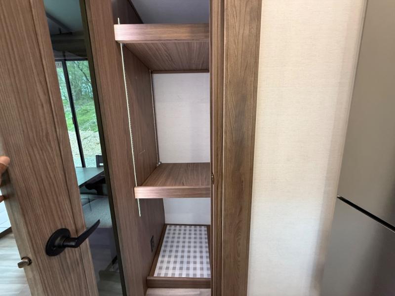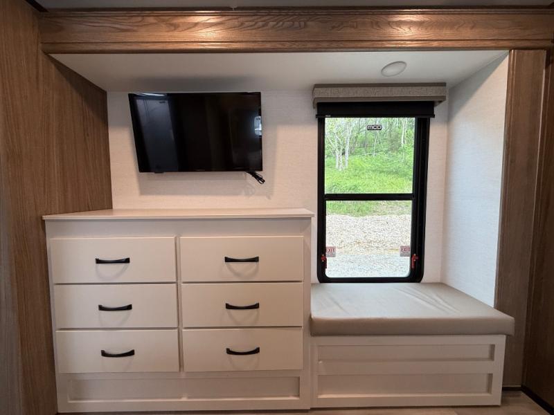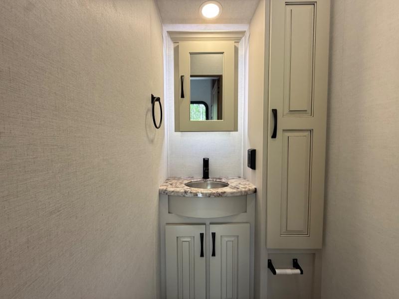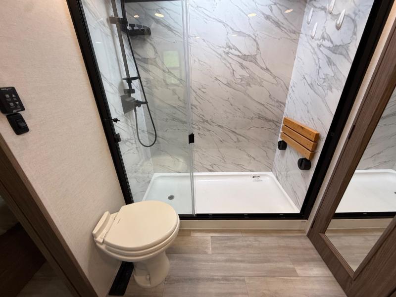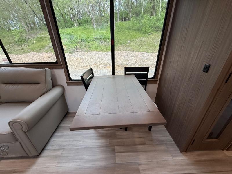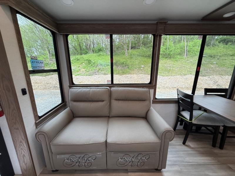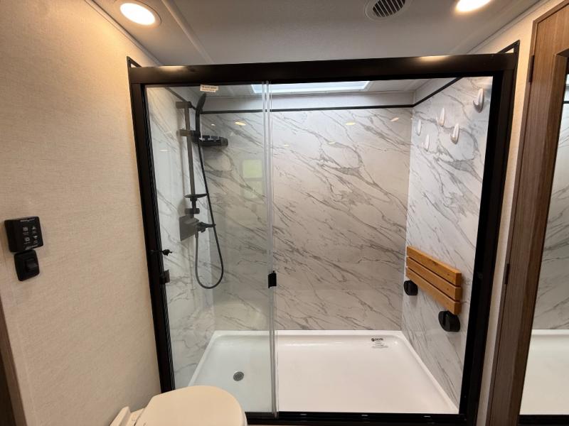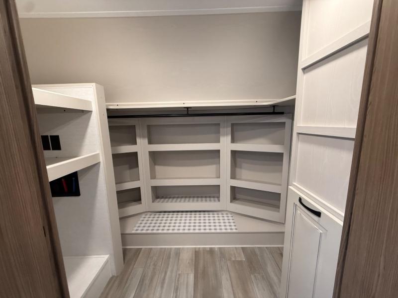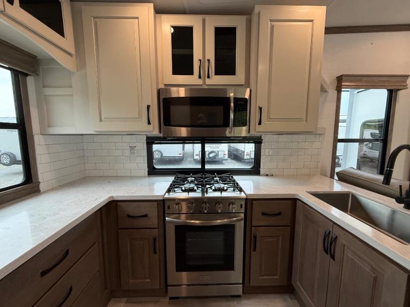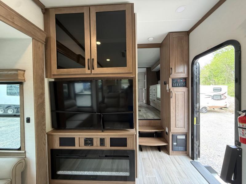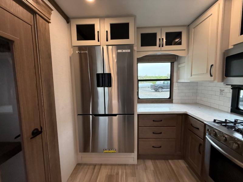 You won't want to camp any other way once you step inside this fifth wheel! the chef will enjoy all of the space in the rear kitchen with ample counter space, a 19 cu. ft. 12 volt residential refrigerator, and a pantry for snacks. Everyone will love to meet in the middle living area that includes dual sleeper sofas and a dual recliner loveseat across from the 50" Smart TV and fireplace. The half bathroom is nearby for quick bathroom breaks too. You will feel right at home in the master suite with a king bed slide to lay your head on at night, a flip top dresser with a Smart TV above it to watch your movies in true comfort, and a seat with storage, plus access to the front full bathroom. Inside the bathroom, you will find a 61" x 30" shower to freshen up in and a walk-in closet with a hamper, shelves, and washer and dryer prep for clean clothes throughout your entire trip!