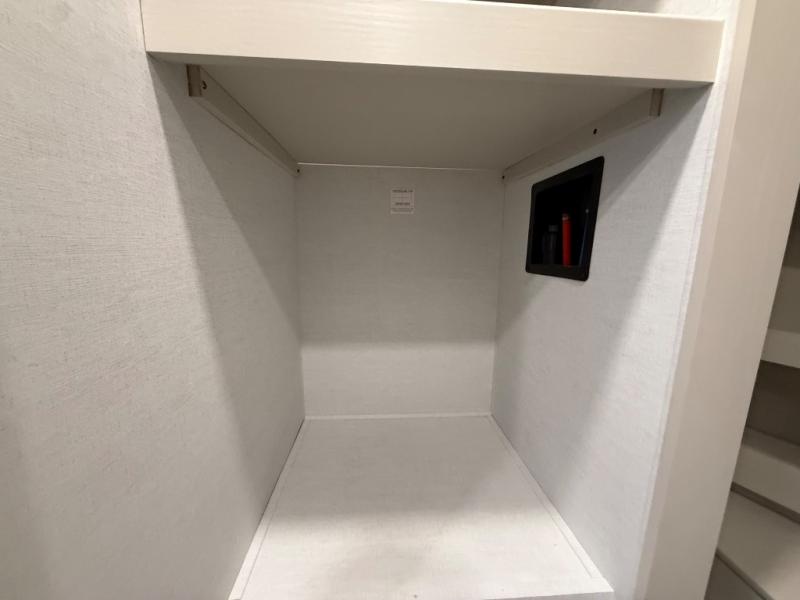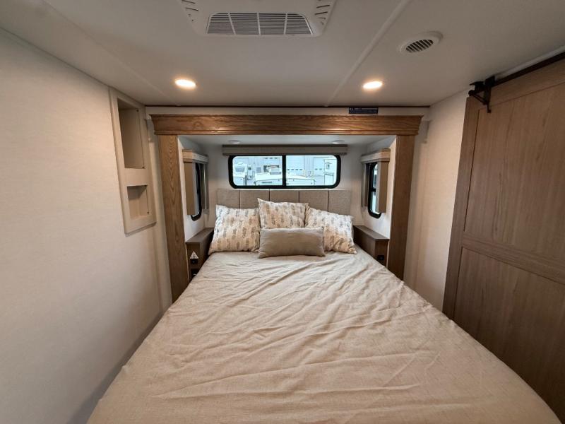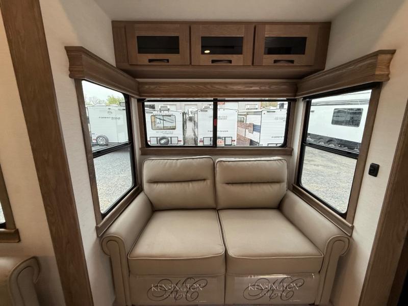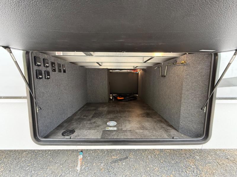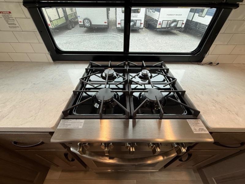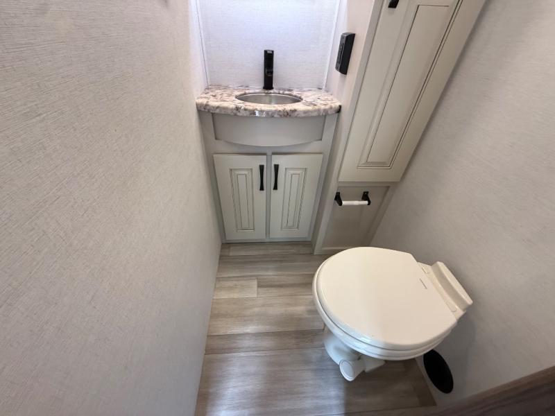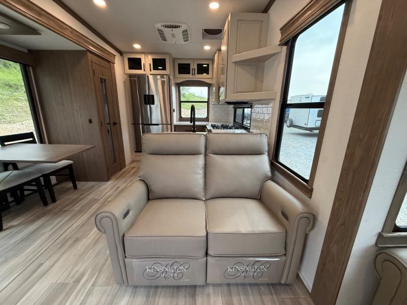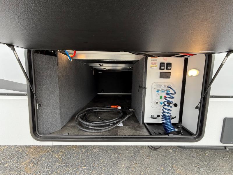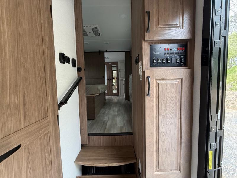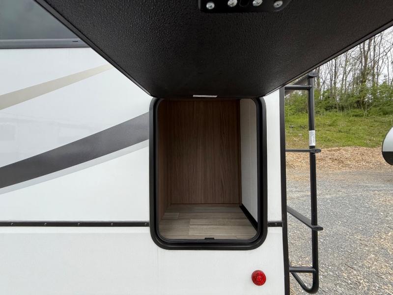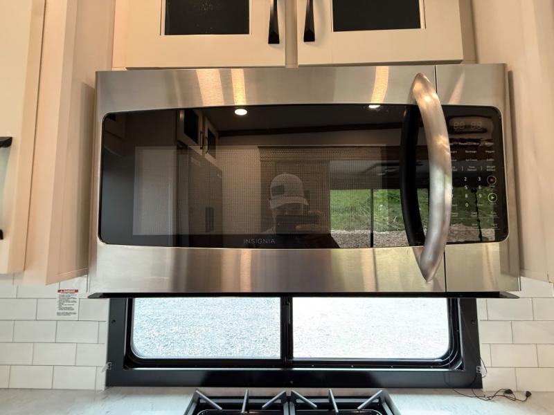 You won't want to camp any other way once you step inside this fifth wheel! the chef will enjoy all of the space in the rear kitchen with ample counter space, a 19 cu. ft. 12 volt residential refrigerator, and a pantry for snacks. Everyone will love to meet in the middle living area that includes dual sleeper sofas and a dual recliner loveseat across from the 50" Smart TV and fireplace. The half bathroom is nearby for quick bathroom breaks too. You will feel right at home in the master suite with a king bed slide to lay your head on at night, a flip top dresser with a Smart TV above it to watch your movies in true comfort, and a seat with storage, plus access to the front full bathroom. Inside the bathroom, you will find a 61" x 30" shower to freshen up in and a walk-in closet with a hamper, shelves, and washer and dryer prep for clean clothes throughout your entire trip!