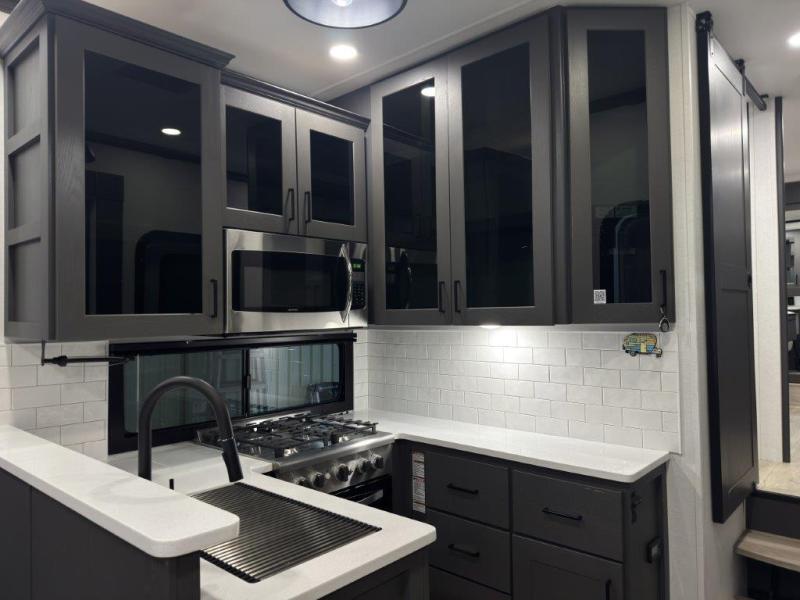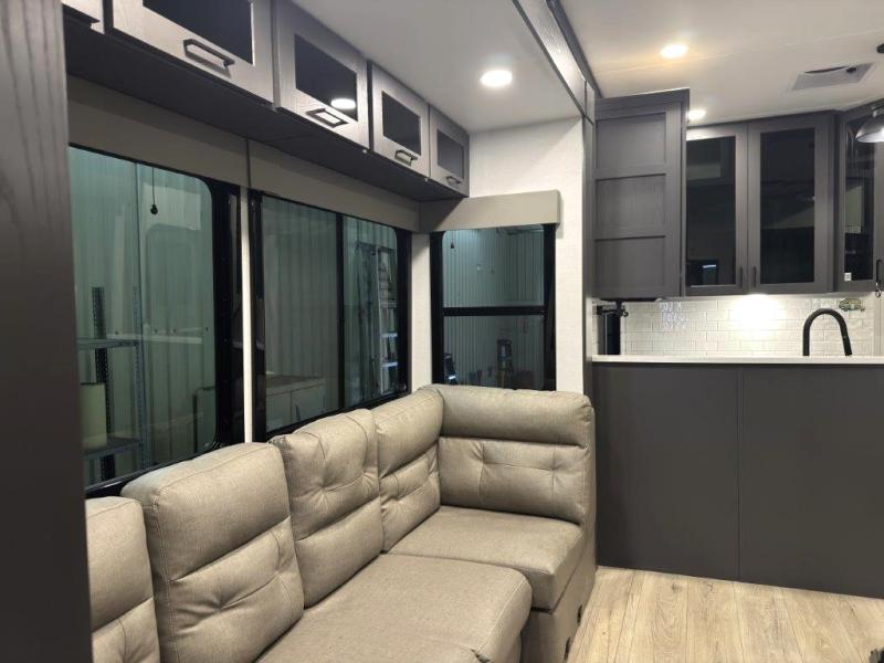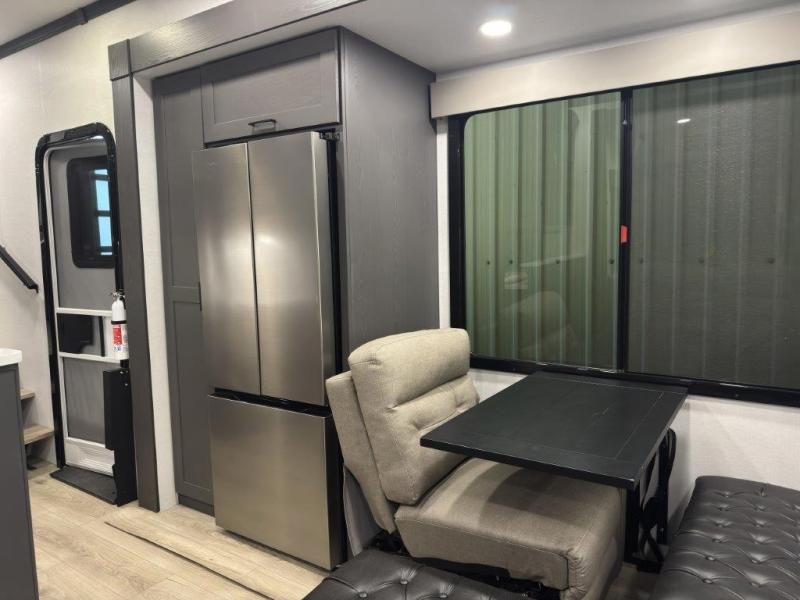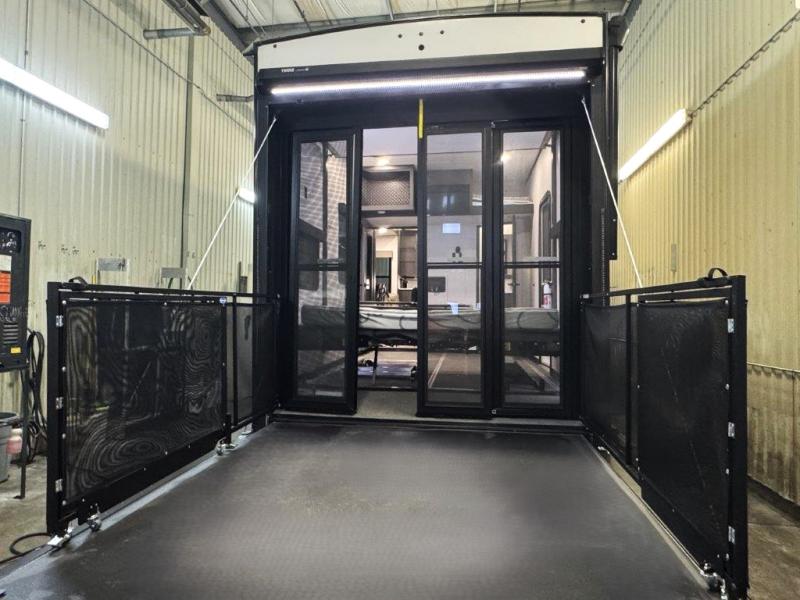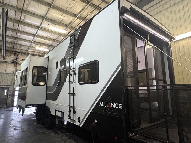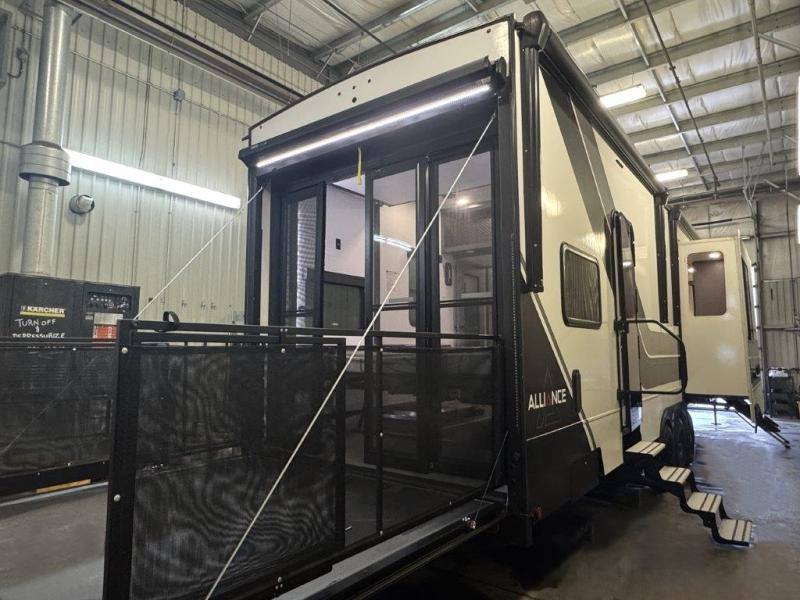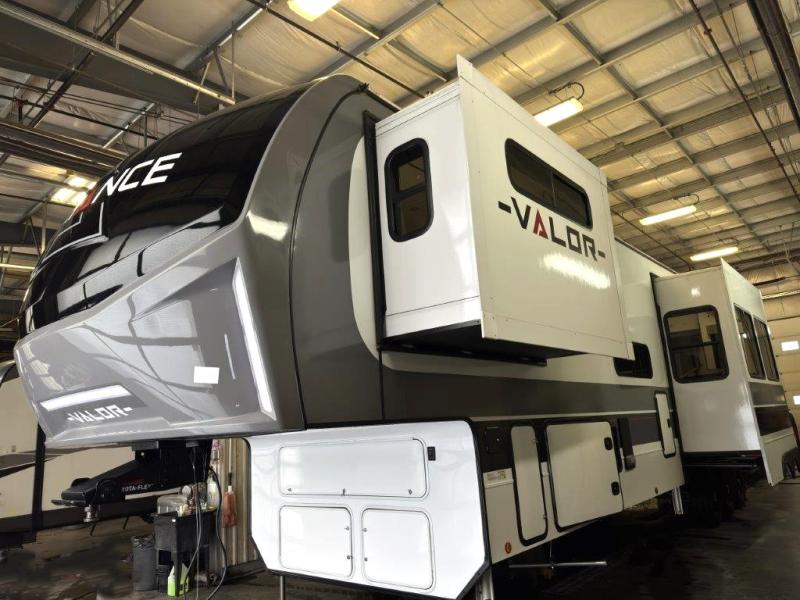 You can bring your toys with you wherever you go with any one of these Alliance RV Valor toy hauler fifth wheels! They are adventure-ready with a quality build from the walk on roof with seamless PVC roof covering to the commercial grade vinyl flooring and MorRyde CRE3000 suspension system. The Performance Running Gear package comes with a 101" wide-body benchmark chassis platform, 7,000 lb. Dexter axles, and a space enhancing drop frame storage compartment to pack in all your riding gear. You can even go off-gridding thanks to the Off the Grid Pack that has two 320 watt solar panels, generator prep, a 40 amp charge controller, and a 100 amp hour lithium iron phosphate battery, plus a battery monitor system. Some of the interior comforts you will enjoy are the hardwood cabinet doors and drawers, solid surface kitchen countertops, and commercial grade vinyl flooring with no carpet to make clean up a breeze. The Valor toy haulers are also the Master of 12 Volt with USB charging station throughout, power recliners, a 17 cu. ft. refrigerator, and more 12 volt features to make camping hassle-free!