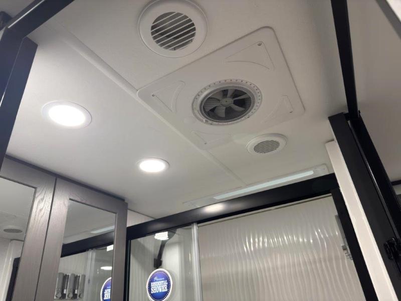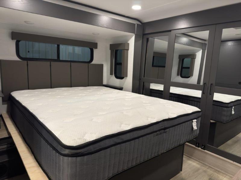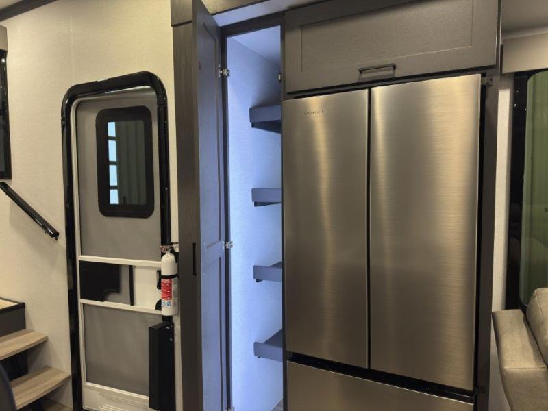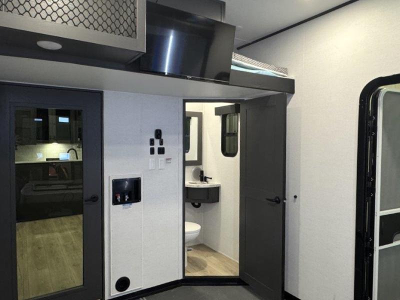 The whole gang will love camping in this toy hauler with 14' of toy parking space for your toys and gear. Once you have arrived at your destination, you can set up the HappiJac roll-over sofas with a queen bed above them, and also a loft which opens to the garage area as well. A half bath is also available off the garage which is an added convenience for those sleeping in this converted area, and for those coming in off the trail so that they do not have to track all through the main unit to use the bathroom. The chef can prepare great meals for their hungry crew with the fully equipped kitchen including a three burner cooktop, a 17 cu. ft. stainless steel 12V refrigerator, large sink, and plenty of countertop prep space. The rest of the gang can be relaxing on the large L-shaped sofa slide watching the 50" HDTV and enjoying the fireplace, or playing a game of cards at the dining table with four chairs. The front private bedroom features a king bed slide for more interior space, a flip top dresser for all of your belongings, and a front wardrobe that is prepped to add an optional washer and dryer, plus it has an entrance into the dual entry bathroom!