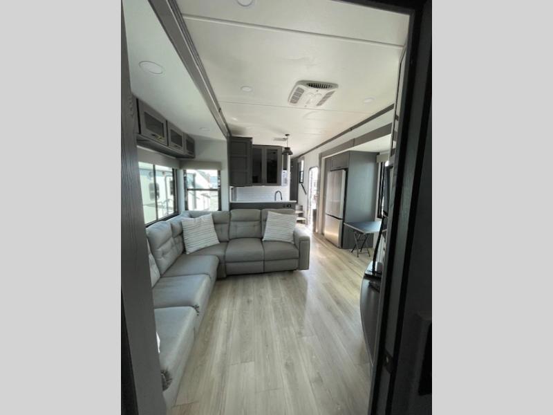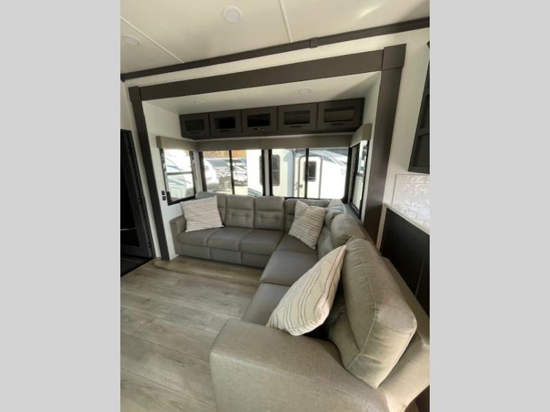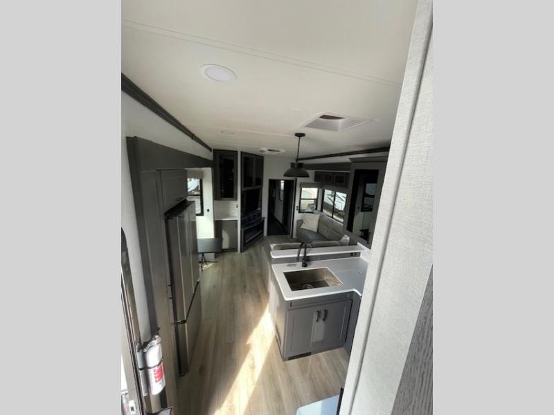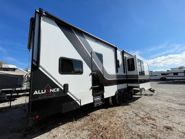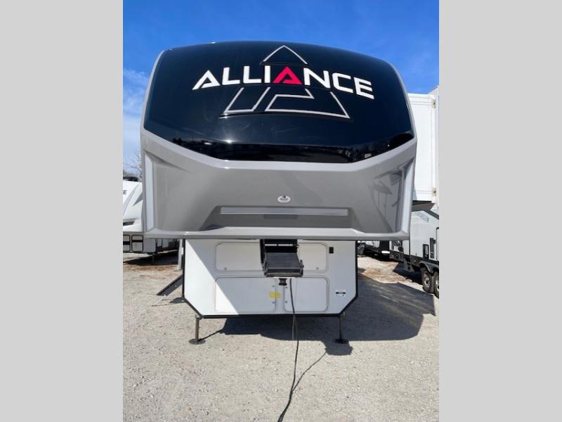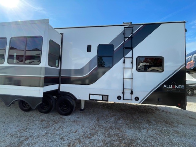 You can bring your toys with you wherever you go with any one of these Alliance RV Valor toy hauler fifth wheels! They are adventure-ready with a quality build from the walk on roof with seamless PVC roof covering to the commercial grade vinyl flooring and MorRyde CRE3000 suspension system. The Performance Running Gear package comes with a 101" wide-body benchmark chassis platform, 7,000 lb. Dexter axles, and a space enhancing drop frame storage compartment to pack in all your riding gear. You can even go off-gridding thanks to the Off the Grid Pack that has two 320 watt solar panels, generator prep, a 40 amp charge controller, and a 100 amp hour lithium iron phosphate battery, plus a battery monitor system. Some of the interior comforts you will enjoy are the hardwood cabinet doors and drawers, solid surface kitchen countertops, and commercial grade vinyl flooring with no carpet to make clean up a breeze. The Valor toy haulers are also the Master of 12 Volt with USB charging station throughout, power recliners, a 17 cu. ft. refrigerator, and more 12 volt features to make camping hassle-free!