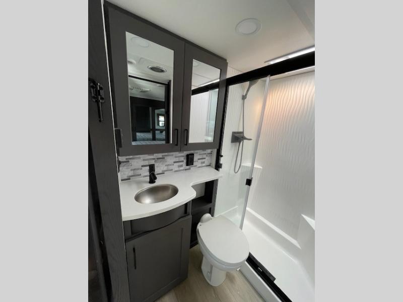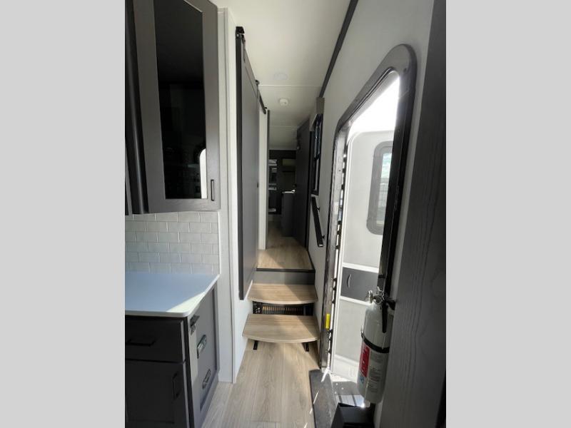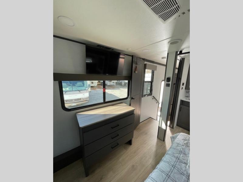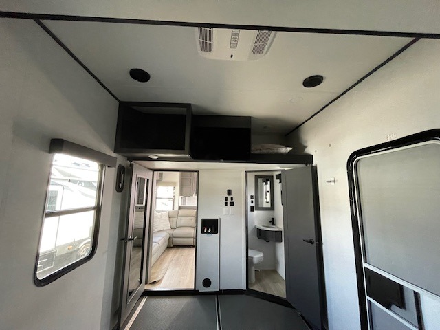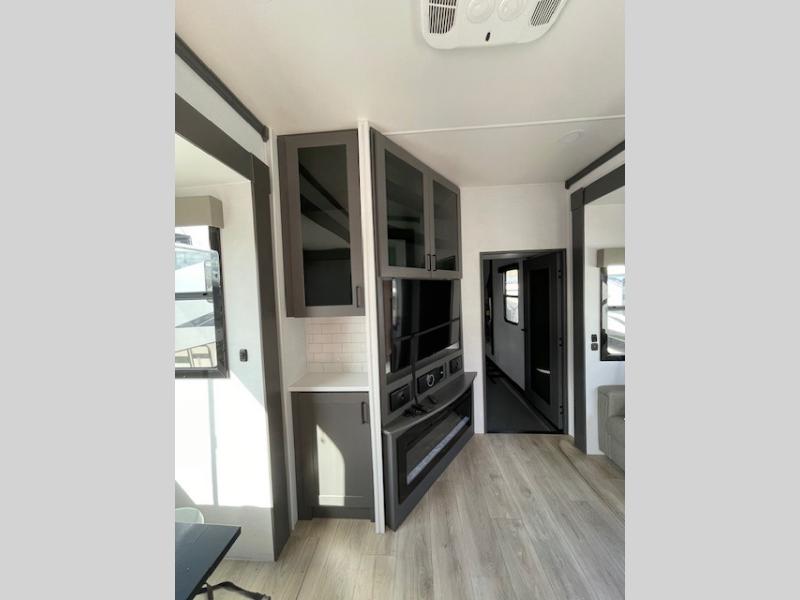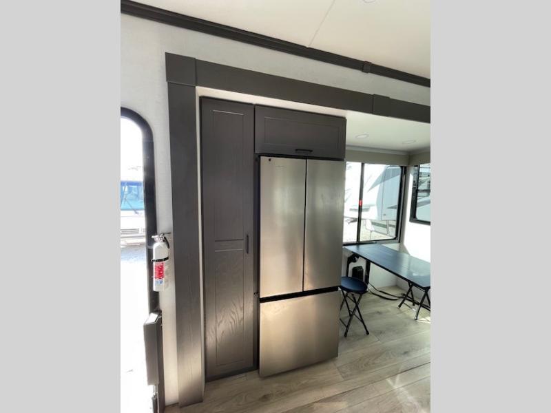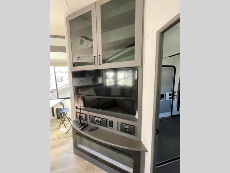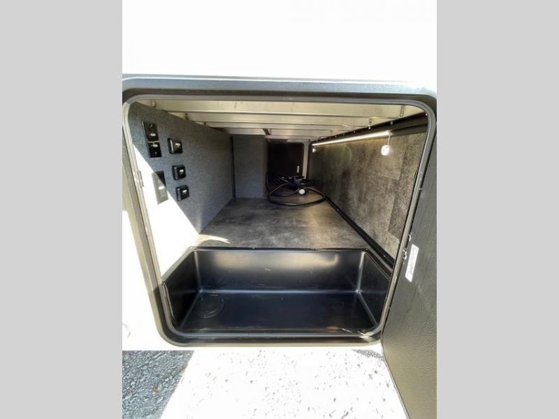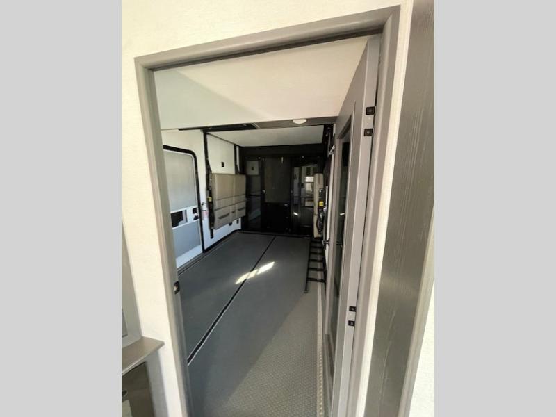 The whole gang will love camping in this toy hauler with 14' of toy parking space for your toys and gear. Once you have arrived at your destination, you can set up the HappiJac roll-over sofas with a queen bed above them, and also a loft which opens to the garage area as well. A half bath is also available off the garage which is an added convenience for those sleeping in this converted area, and for those coming in off the trail so that they do not have to track all through the main unit to use the bathroom. The chef can prepare great meals for their hungry crew with the fully equipped kitchen including a three burner cooktop, a 17 cu. ft. stainless steel 12V refrigerator, large sink, and plenty of countertop prep space. The rest of the gang can be relaxing on the large L-shaped sofa slide watching the 50" HDTV and enjoying the fireplace, or playing a game of cards at the dining table with four chairs. The front private bedroom features a king bed slide for more interior space, a flip top dresser for all of your belongings, and a front wardrobe that is prepped to add an optional washer and dryer, plus it has an entrance into the dual entry bathroom!