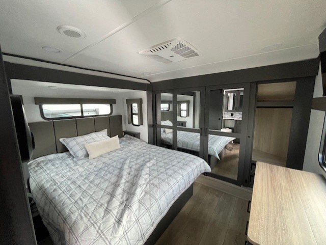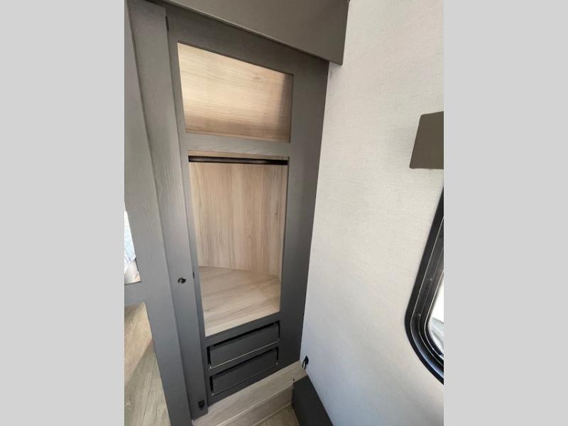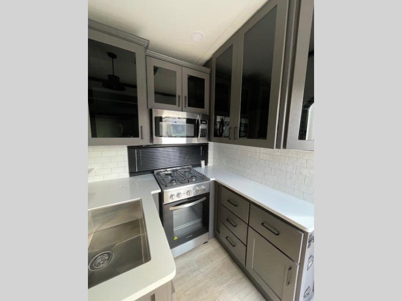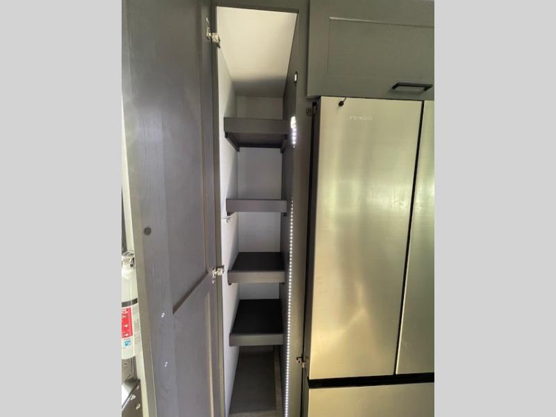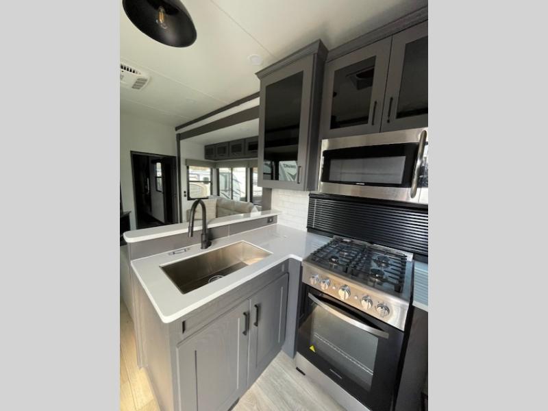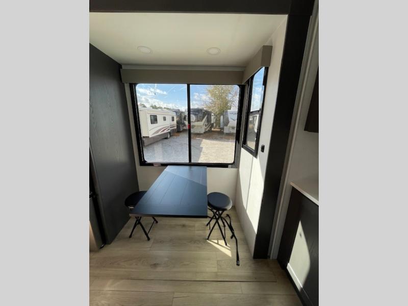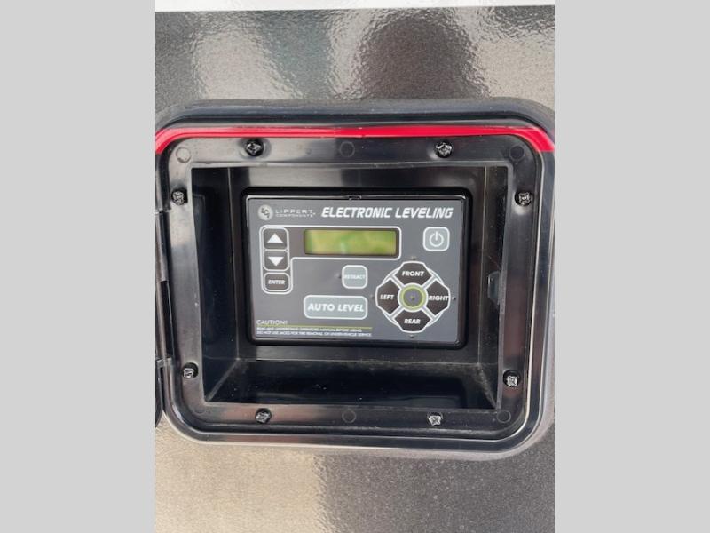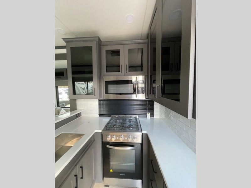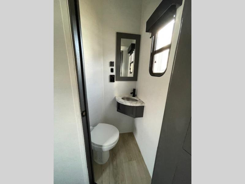 The whole gang will love camping in this toy hauler with 14' of toy parking space for your toys and gear. Once you have arrived at your destination, you can set up the HappiJac roll-over sofas with a queen bed above them, and also a loft which opens to the garage area as well. A half bath is also available off the garage which is an added convenience for those sleeping in this converted area, and for those coming in off the trail so that they do not have to track all through the main unit to use the bathroom. The chef can prepare great meals for their hungry crew with the fully equipped kitchen including a three burner cooktop, a 17 cu. ft. stainless steel 12V refrigerator, large sink, and plenty of countertop prep space. The rest of the gang can be relaxing on the large L-shaped sofa slide watching the 50" HDTV and enjoying the fireplace, or playing a game of cards at the dining table with four chairs. The front private bedroom features a king bed slide for more interior space, a flip top dresser for all of your belongings, and a front wardrobe that is prepped to add an optional washer and dryer, plus it has an entrance into the dual entry bathroom!