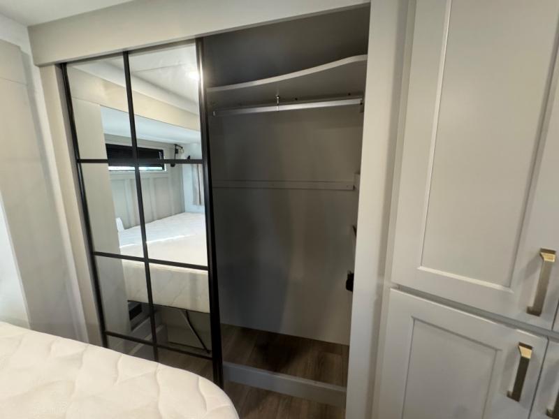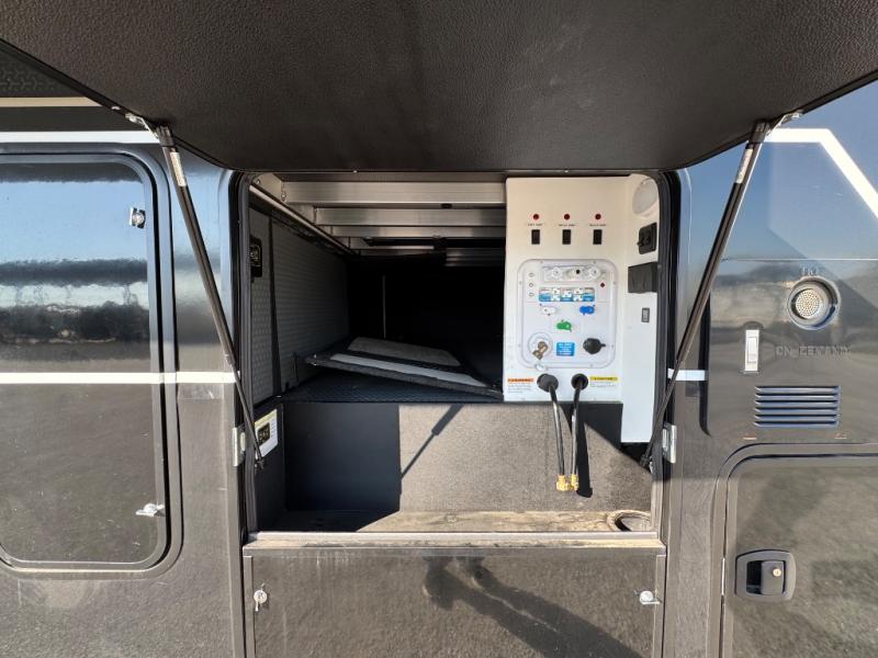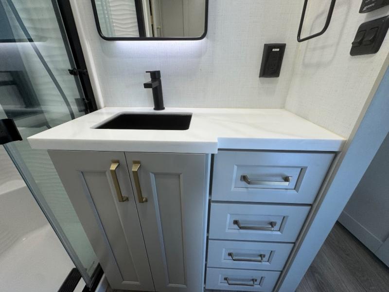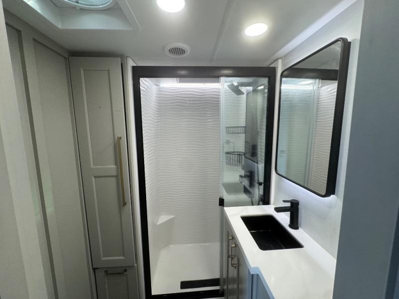 With any Model G toy hauler fifth wheel by Brinkley you will enjoy luxurious amenities, tons of storage space, and innovative features that have been developed and tested in the real world. Durable construction includes an industry leading PDI process, an industry best insulation package, and reinforced and walkable slide roofs. Some of the exterior features you'll find are a 3-way pass-through with a multi-functional flip-up bulkhead wall, under I-beam storage, a MAX-Vision reverse lighting system, and a low-maintenance roof to name a few. A Rockford Fosgate audio system comes standard, along with a OneControl app system that lets you control your fifth wheel's functions right from your mobile device. You will find the solar system with a designated storage area to be ultra convenient, plus there is a FlexPower 5500 with a dual fuel inverter generator for all your power needs. Head inside to find a residential interior with Brinkley's CraftSense wood trim construction, floating entrance steps, integrated window screens and insulated blackout blinds, and residential solid surface countertops plus backsplash. You will also enjoy the neon shower lighting and recessed medicine cabinets in the bath, plus motion activated LED bed lights and dual bedside outlets in the bedroom. Choose a Model G toy hauler fifth wheel to experience all the luxury it has to offer!