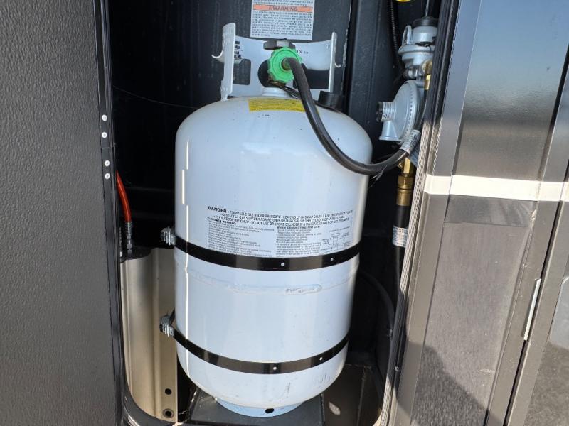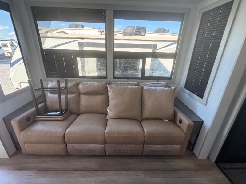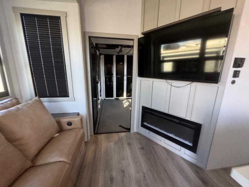 Prepare to be amazed by all the features packed into this toy hauler! There are triple slides that will provide your crew with more space, a separate garage that can sleep five with the loft included, plus a bath and a half for added convenience. The chef of your group will love the middle kitchen with a waterfall island that converts to a counter peninsula, a pull-out pantry, a GE Energy Star 19 cu. ft. refrigerator with ice and filtered water, and much more. In the combined kitchen and living space you'll find a spacious sofa with heat and massage, a fireplace, a TV, plus convenient dog bowls and shoe storage. After your toys are unloaded from the garage, you can relax on the independent dual sofas with a Fold-N-Stow table in between, and your guests can sleep on the Happijac® Sofa and Bed Lift system. You will find the front private bedroom with a king bed slide out will provide a great night's rest, and you'll also find a walk-in closet, under-bed storage, and a sliding dresser top with hidden storage for special belongings.