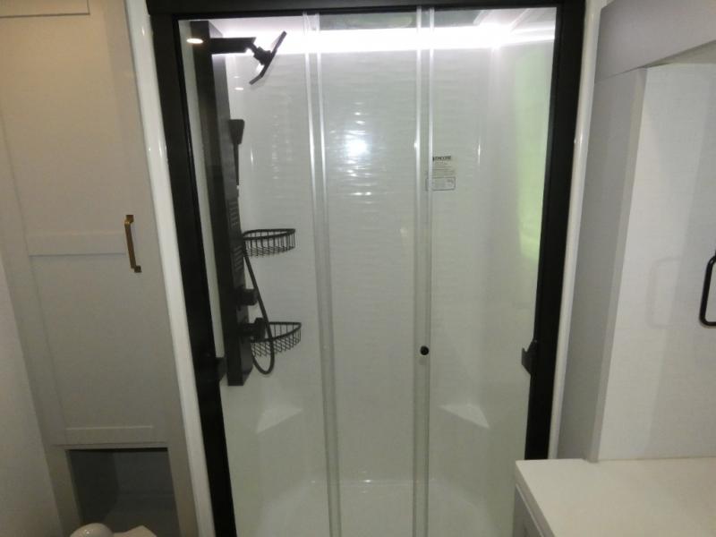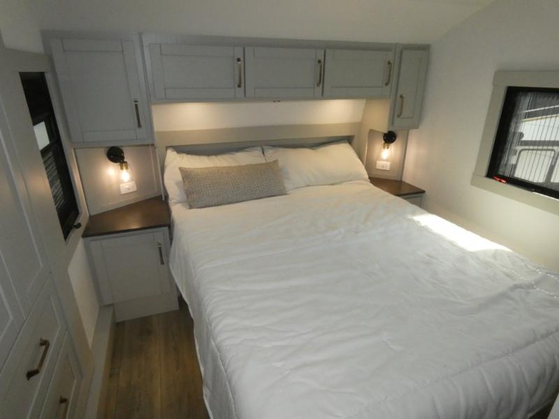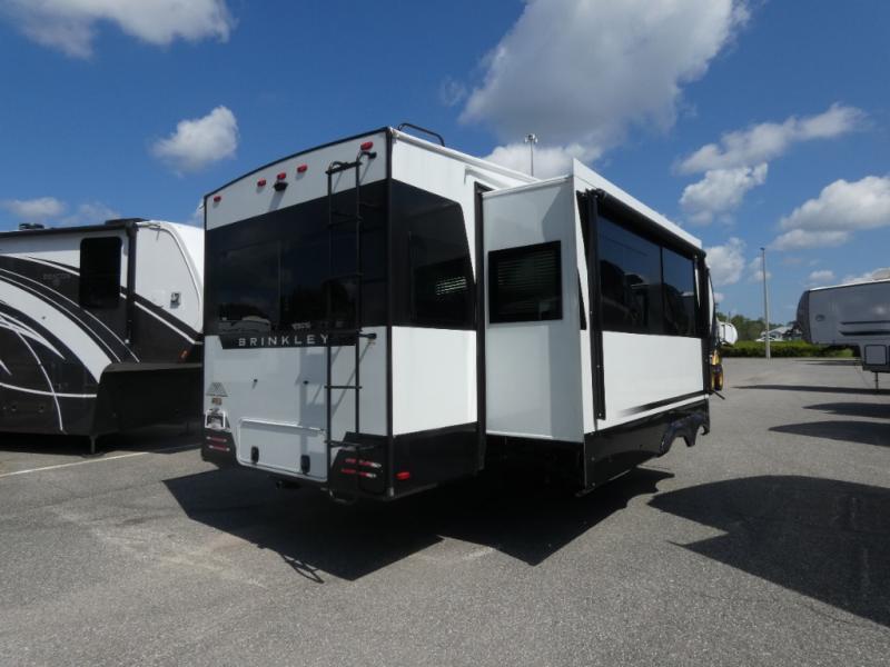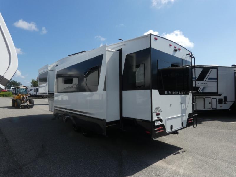 The Brinkley mid-profile Model Z fifth wheels bring you clean lines and an upscale look with plenty of style and exciting new features like the industry first brass plumbing connections. These units also feature an automotive grade front cap, plenty of exterior storage, dual exterior hot and cold showers, and wide stance leveling jacks for easy set up. Residential frameless windows provide a clean look and beautiful views, and ample electrical outlets and 6 USB/USB-C outlets allow all of your electronics and appliances to easily be used and charged.