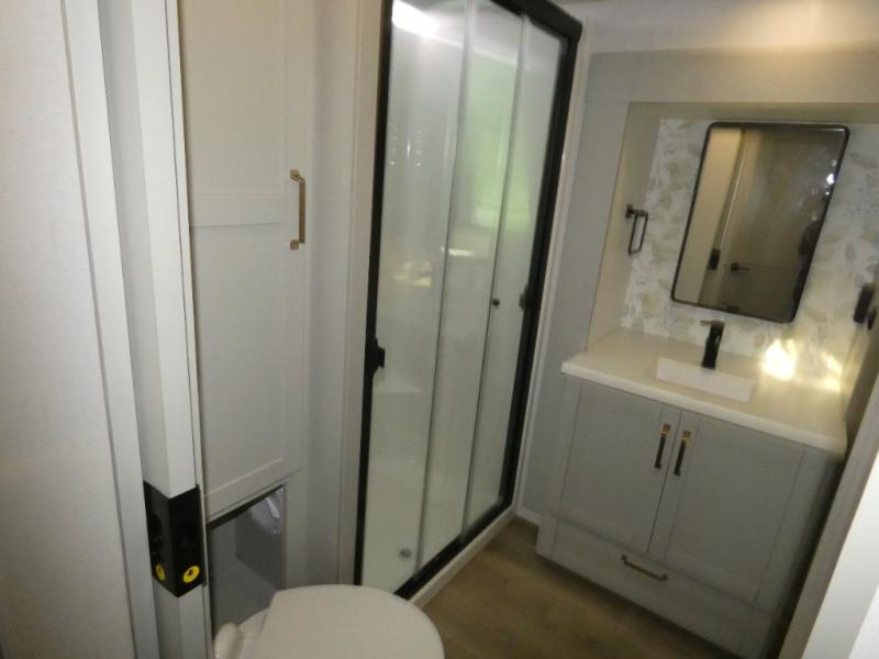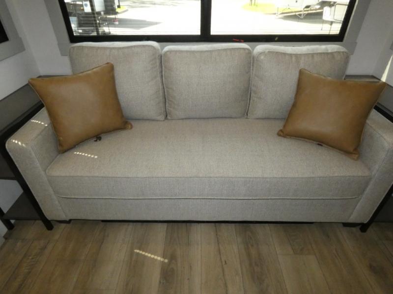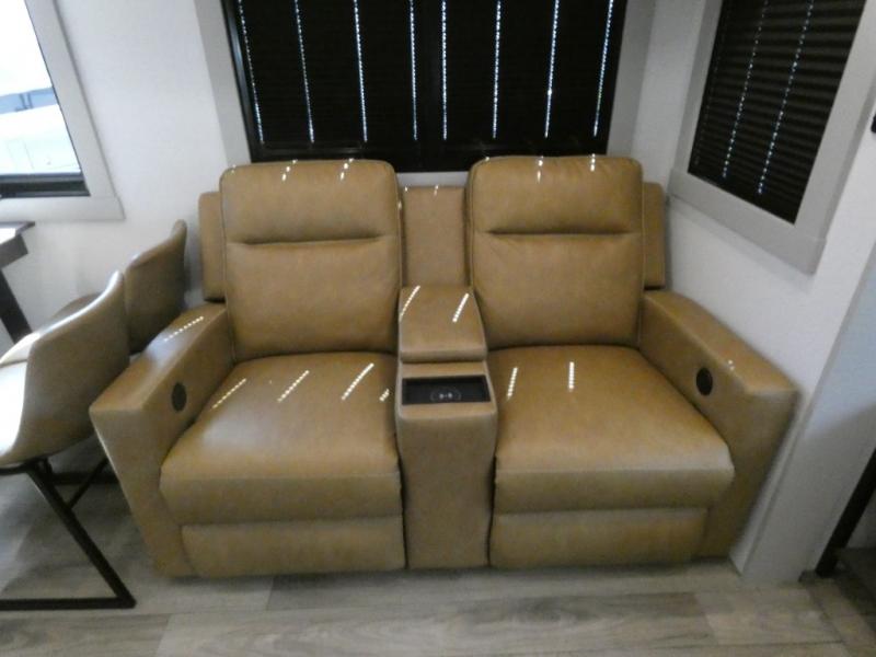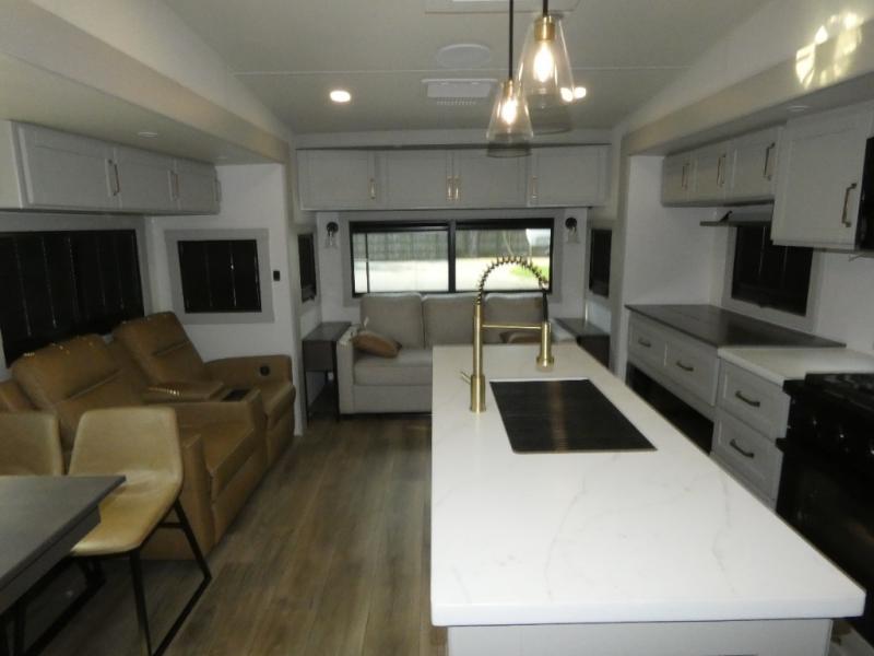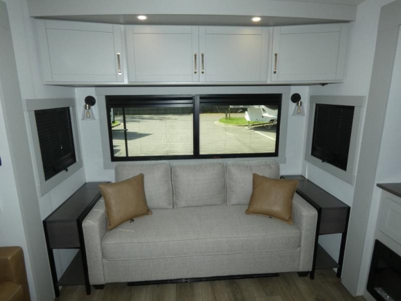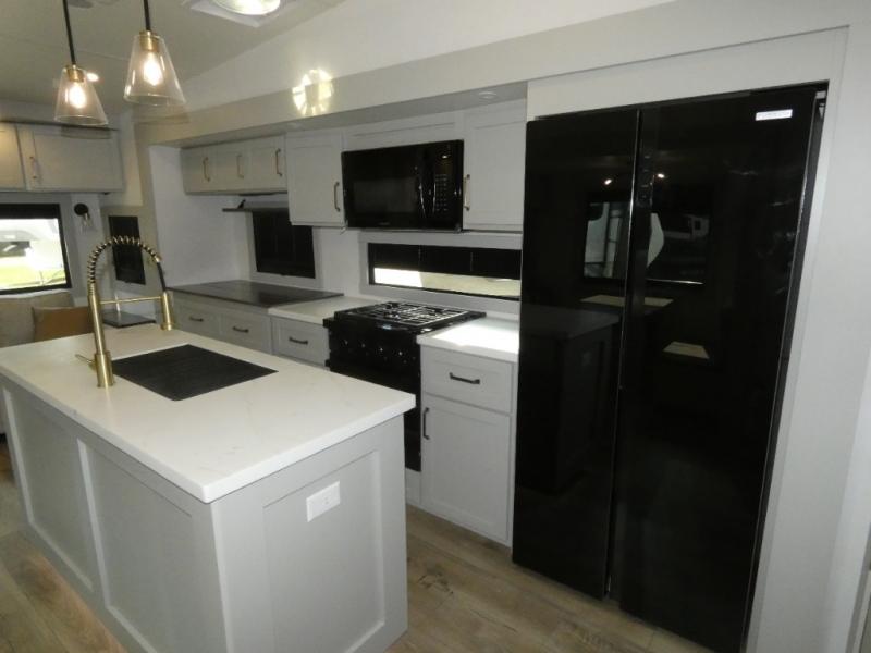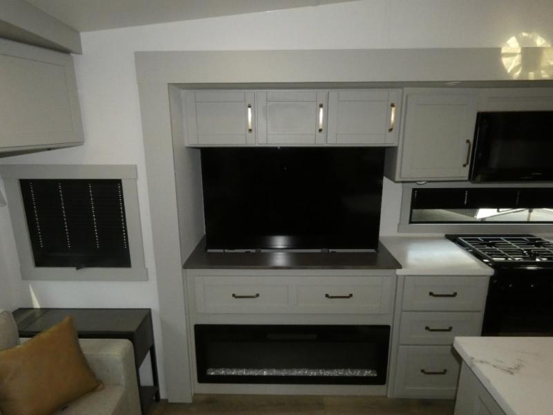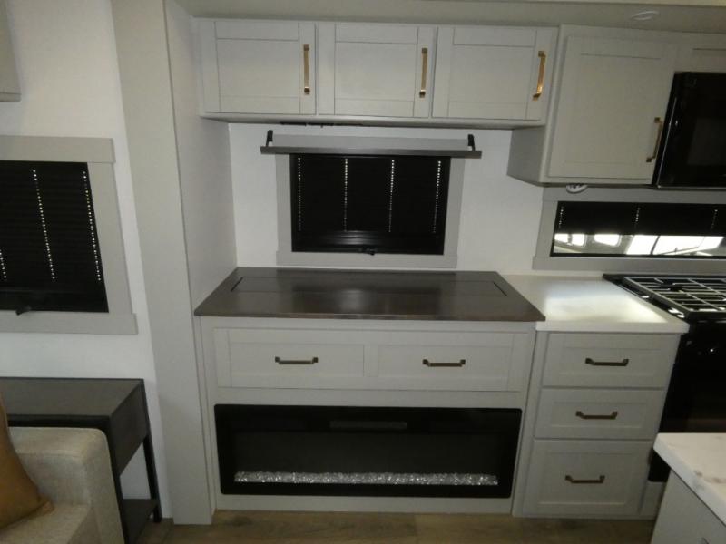 You're going to love every minute spent in this spacious fifth wheel that can sleep four. There is an inviting rear living area with a 72" tri-fold sofa and theater seating across from the telescoping entertainment center and fireplace. The chef of your group can whip up dinner on the three burner cooktop or in the 30" residential microwave, and there is a 16 cu. ft. refrigerator that even opens when with the slide out is in. You will also enjoy the kitchen island with a farmhouse sink and roller cover, dual trash bins with a Stow N' Go paper towel holder, plus convenient dog bowls for your furry friends. You can store all your paper goods and snacks in the 84" pantry with adjustable shelving, and there is a hutch for nice dishes plus shoe storage in this model as well. Head to the front master bedroom where you'll find a queen bed with a TV, a large slide out with a wardrobe and a chest of drawers, plus a spacious bath.