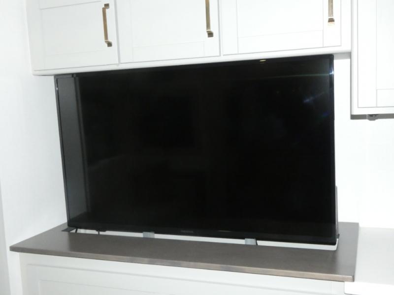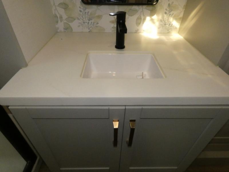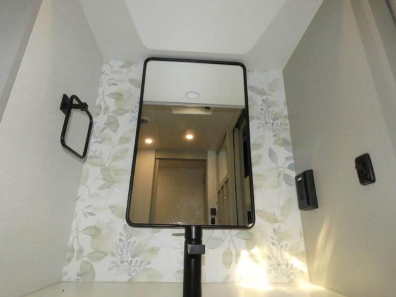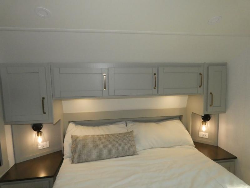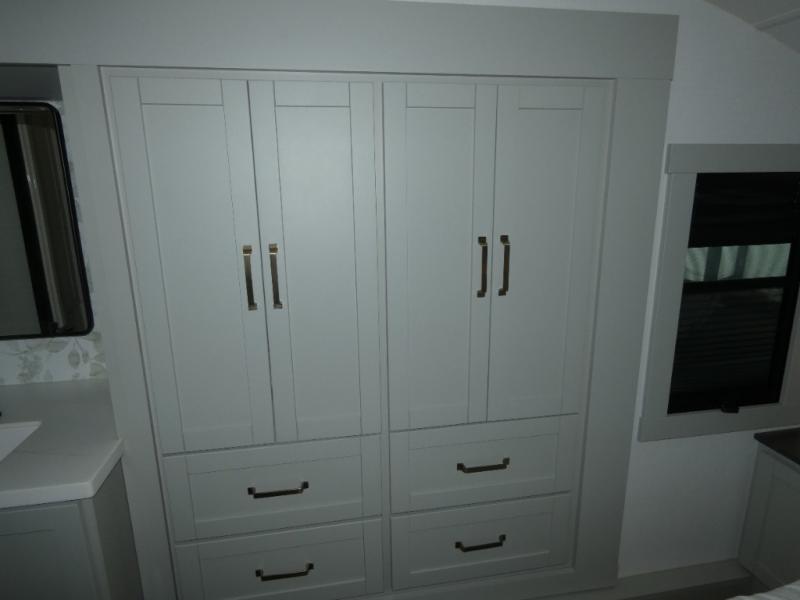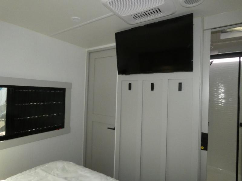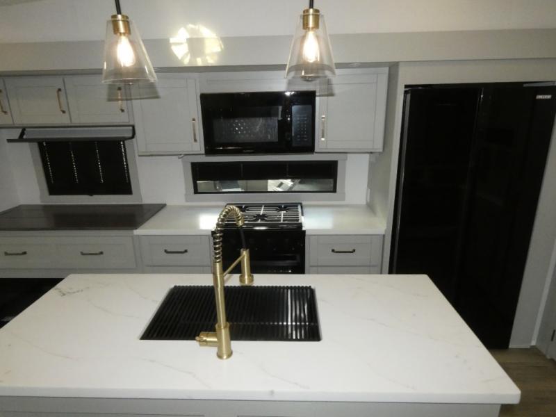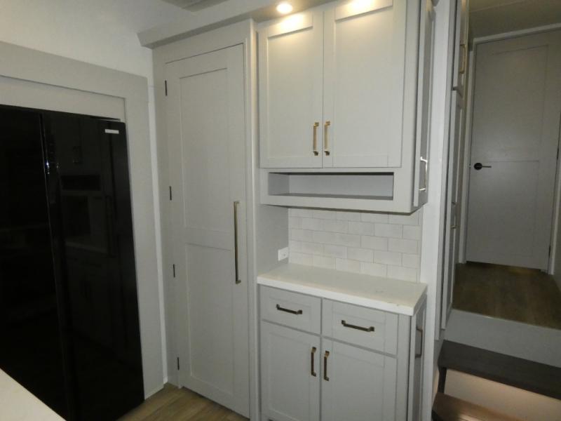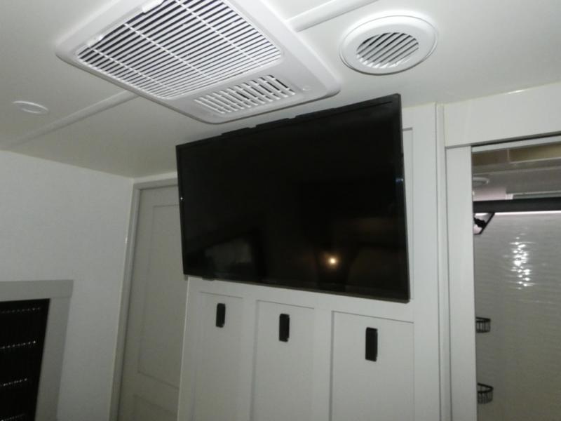 You're going to love every minute spent in this spacious fifth wheel that can sleep four. There is an inviting rear living area with a 72" tri-fold sofa and theater seating across from the telescoping entertainment center and fireplace. The chef of your group can whip up dinner on the three burner cooktop or in the 30" residential microwave, and there is a 16 cu. ft. refrigerator that even opens when with the slide out is in. You will also enjoy the kitchen island with a farmhouse sink and roller cover, dual trash bins with a Stow N' Go paper towel holder, plus convenient dog bowls for your furry friends. You can store all your paper goods and snacks in the 84" pantry with adjustable shelving, and there is a hutch for nice dishes plus shoe storage in this model as well. Head to the front master bedroom where you'll find a queen bed with a TV, a large slide out with a wardrobe and a chest of drawers, plus a spacious bath.