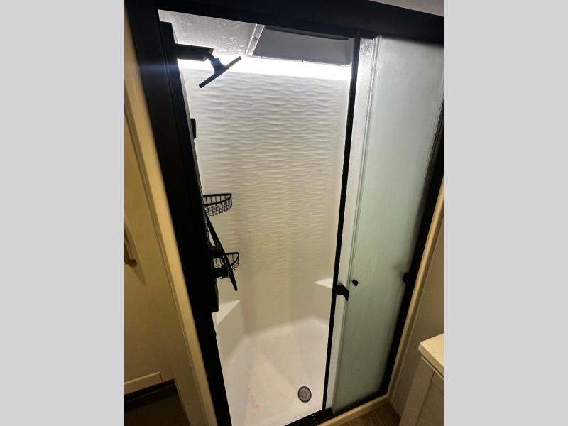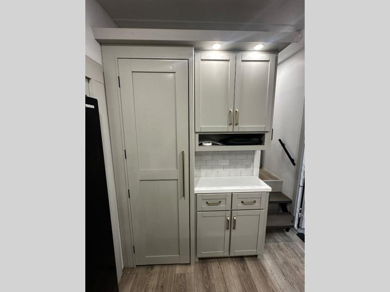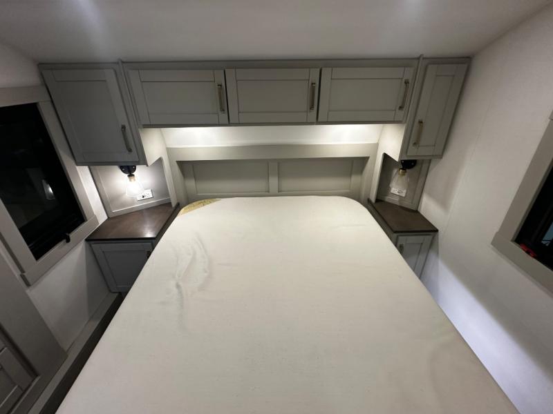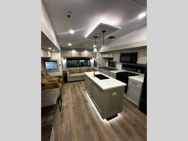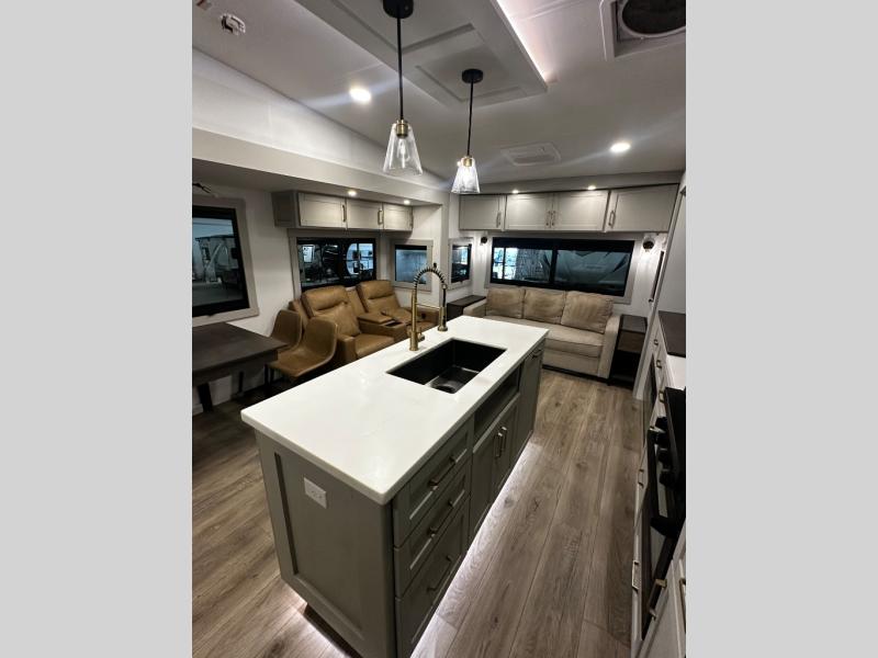 You're going to love every minute spent in this spacious fifth wheel that can sleep four. There is an inviting rear living area with a 72" tri-fold sofa and theater seating across from the telescoping entertainment center and fireplace. The chef of your group can whip up dinner on the three burner cooktop or in the 30" residential microwave, and there is a 16 cu. ft. refrigerator that even opens when with the slide out is in. You will also enjoy the kitchen island with a farmhouse sink and roller cover, dual trash bins with a Stow N' Go paper towel holder, plus convenient dog bowls for your furry friends. You can store all your paper goods and snacks in the 84" pantry with adjustable shelving, and there is a hutch for nice dishes plus shoe storage in this model as well. Head to the front master bedroom where you'll find a queen bed with a TV, a large slide out with a wardrobe and a chest of drawers, plus a spacious bath.