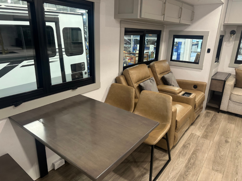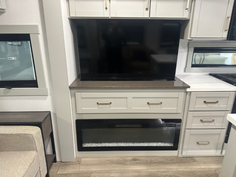 When you want travel accommodations to feel just like home! This Model Z luxury fifth wheel is bright and modern on the inside, with loads of amenities that will have you dreaming of your next trip! Enter and find a spacious combined living/kitchen space thanks to dual opposing slides. There is ample seating with a free standing dinette that includes a built-in utensil drawer, 62" theater seating, and a 72" tri-fold sofa along the rear wall. You can easily relax and enjoy the 50" Smart telescoping TV with a cozy fireplace below. The kitchen offers all that you need to prepare and cook meals just like home with a 16 cu. ft. refrigerator for your perishables, a 30" microwave oven, and three burner range top and oven. You will love the integrated spice rack, and the kitchen island all outfitted with dog bowls and double pull out trash bins with an integrated Stow & Go paper towel holder. There is also an 84" pantry with adjustable shelves for all of your canned and dry goods. Head up the steps to a private master suite with king bed slide. You can opt for the queen bed if you like. A sliding dresser top features hidden storage which is perfect for jewelry and other personal belongings. The front wardrobe features mirrored doors and the corner closet has been prepped for a stackable washer and dryer if you choose to add that option. Relax and enjoy a large bath featuring a linen cabinet, a 30" x 42" shower, and vanity with sink, plus medicine cabinet. You will also appreciate having dual showers on the outside of this unit, and a rear baggage door and mid-coach pass-through storage.