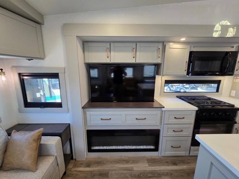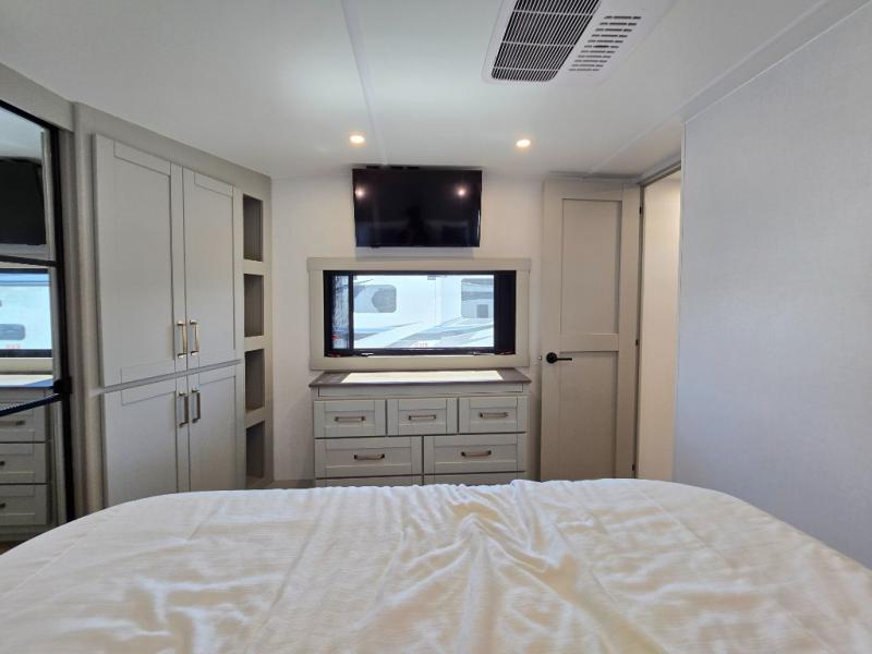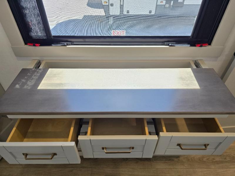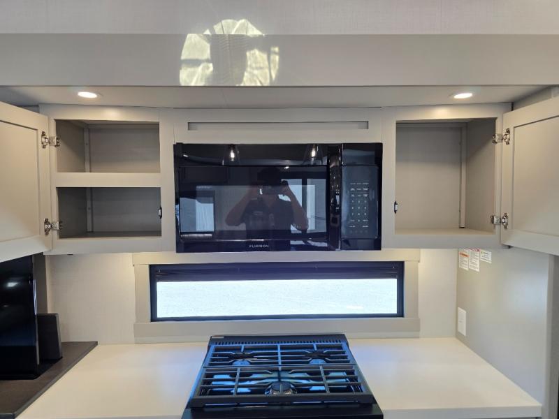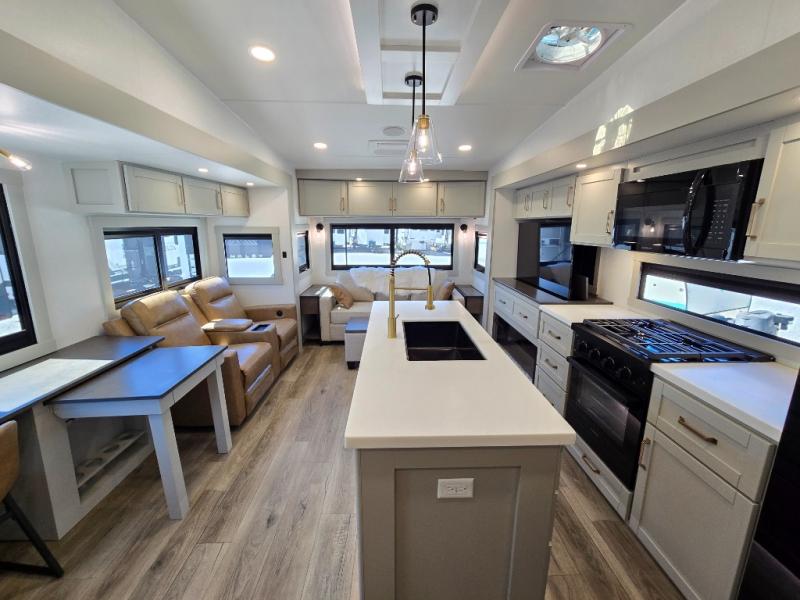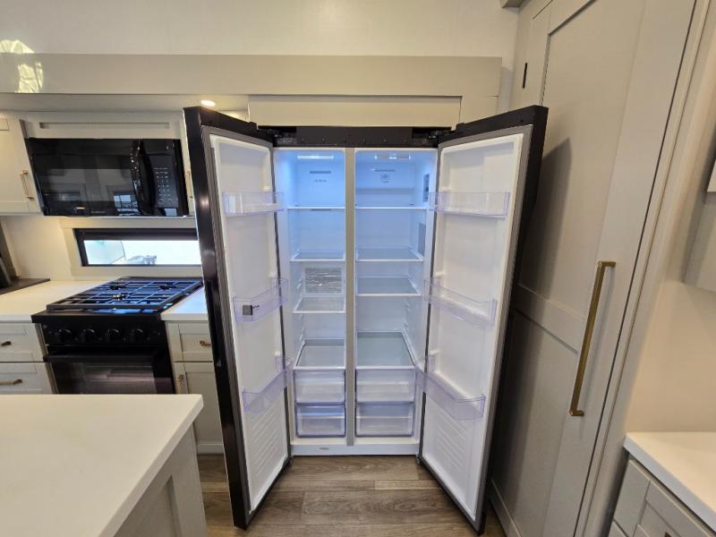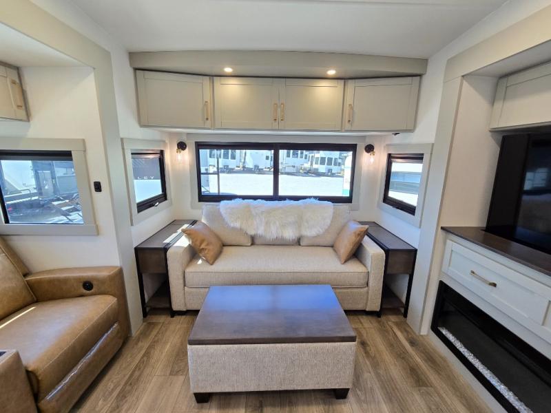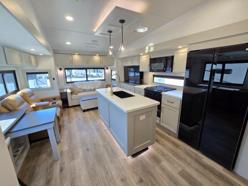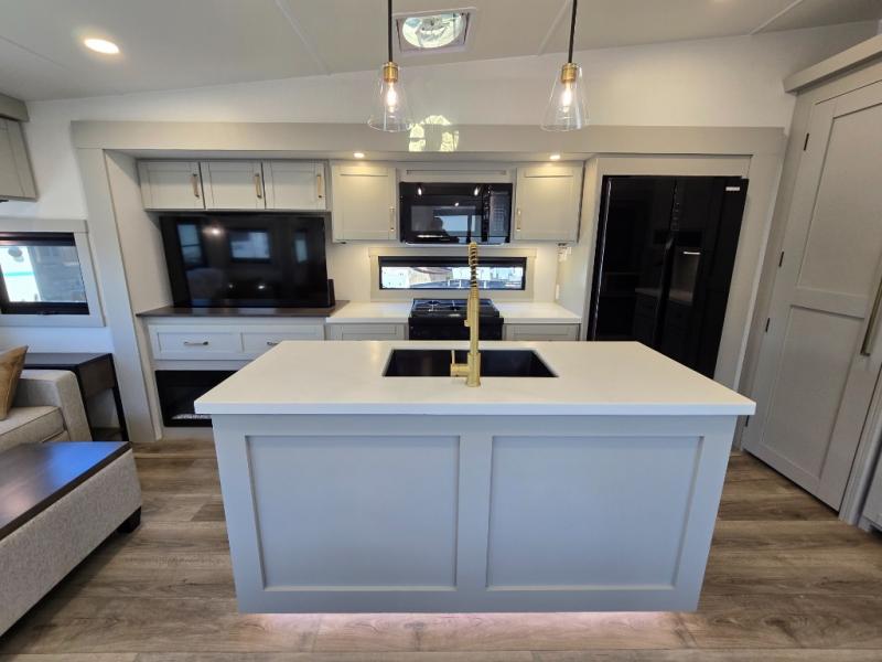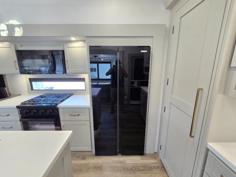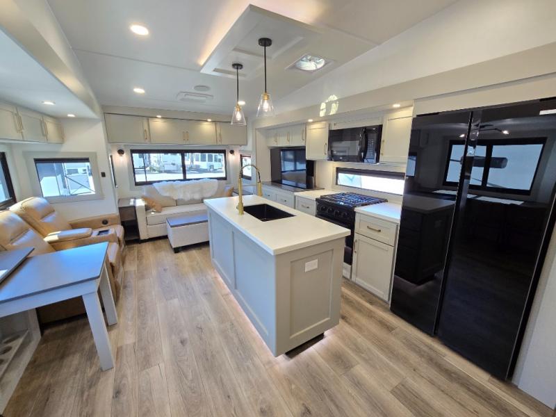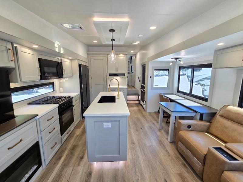 When you want travel accommodations to feel just like home! This Model Z luxury fifth wheel is bright and modern on the inside, with loads of amenities that will have you dreaming of your next trip! Enter and find a spacious combined living/kitchen space thanks to dual opposing slides. There is ample seating with a free standing dinette that includes a built-in utensil drawer, 62" theater seating, and a 72" tri-fold sofa along the rear wall. You can easily relax and enjoy the 50" Smart telescoping TV with a cozy fireplace below. The kitchen offers all that you need to prepare and cook meals just like home with a 16 cu. ft. refrigerator for your perishables, a 30" microwave oven, and three burner range top and oven. You will love the integrated spice rack, and the kitchen island all outfitted with dog bowls and double pull out trash bins with an integrated Stow & Go paper towel holder. There is also an 84" pantry with adjustable shelves for all of your canned and dry goods. Head up the steps to a private master suite with king bed slide. You can opt for the queen bed if you like. A sliding dresser top features hidden storage which is perfect for jewelry and other personal belongings. The front wardrobe features mirrored doors and the corner closet has been prepped for a stackable washer and dryer if you choose to add that option. Relax and enjoy a large bath featuring a linen cabinet, a 30" x 42" shower, and vanity with sink, plus medicine cabinet. You will also appreciate having dual showers on the outside of this unit, and a rear baggage door and mid-coach pass-through storage.