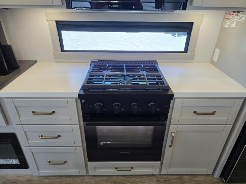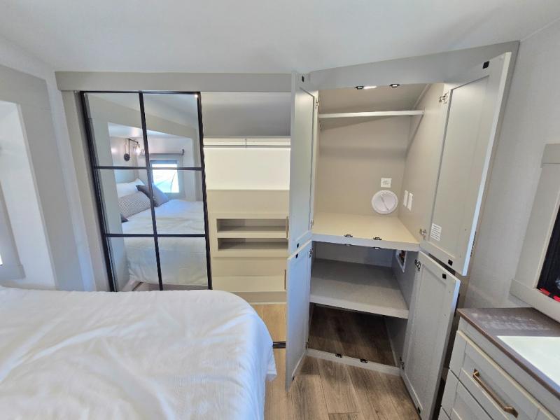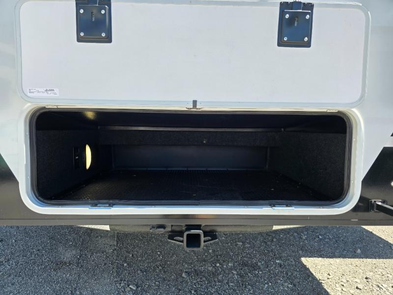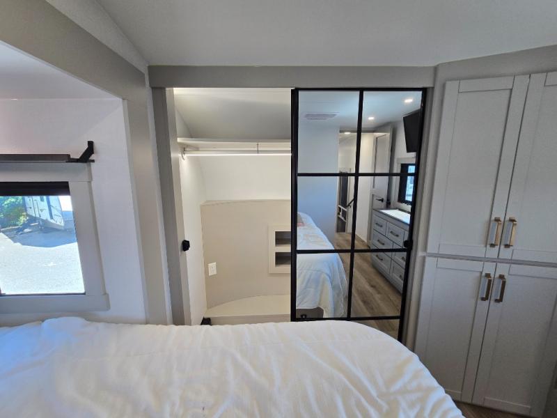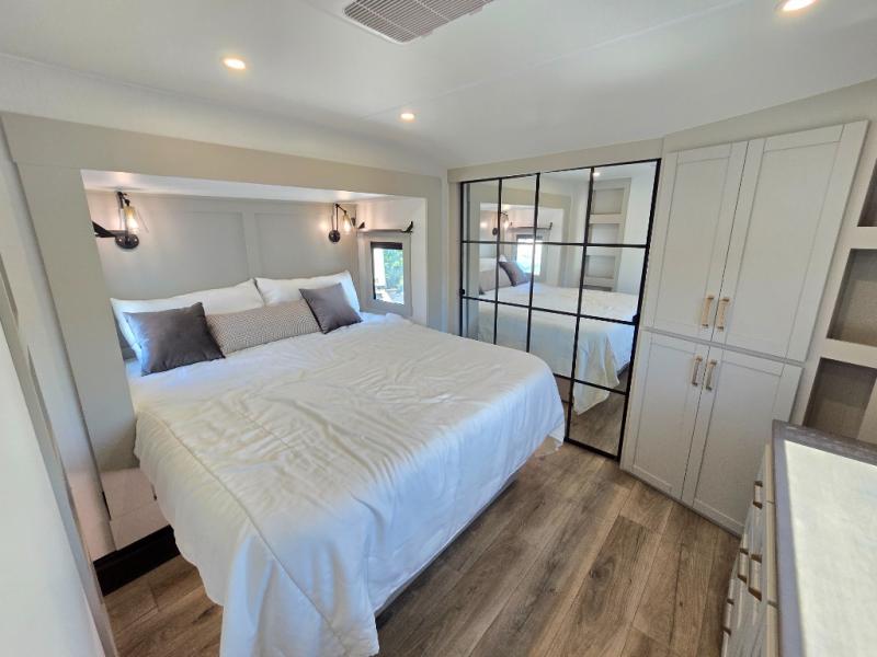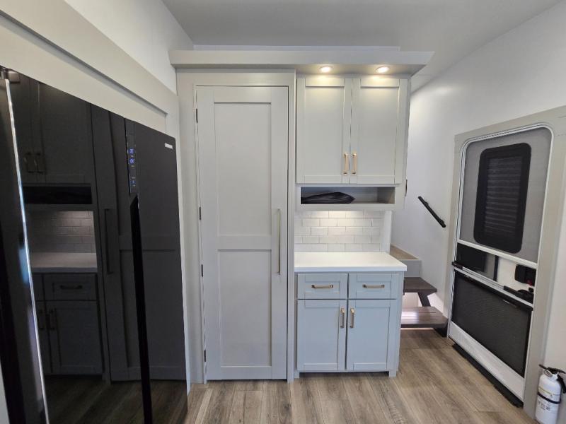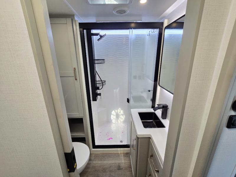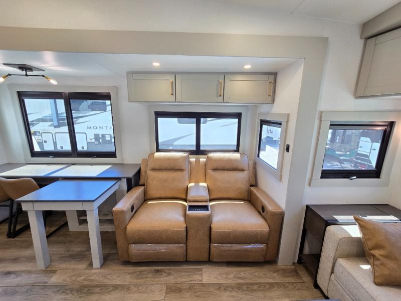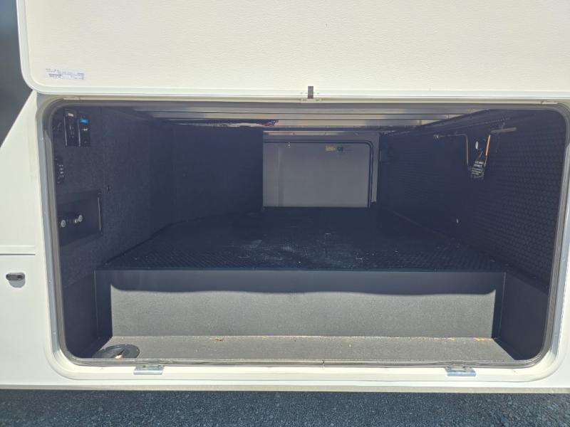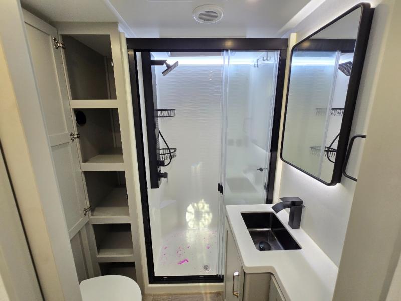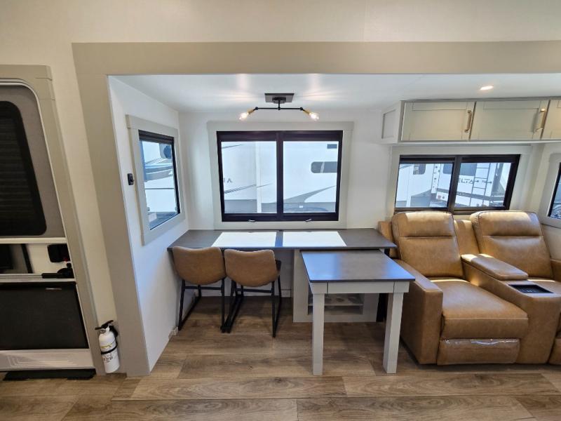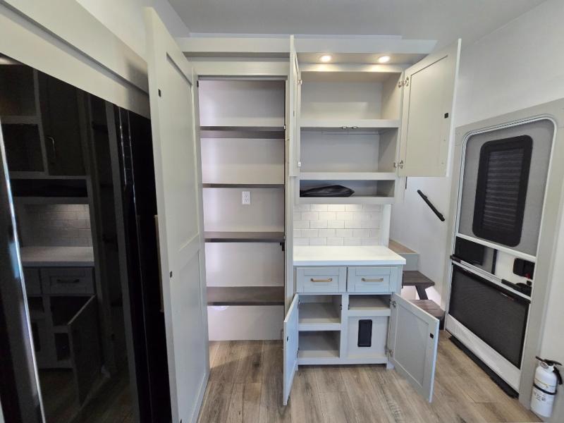 When you want travel accommodations to feel just like home! This Model Z luxury fifth wheel is bright and modern on the inside, with loads of amenities that will have you dreaming of your next trip! Enter and find a spacious combined living/kitchen space thanks to dual opposing slides. There is ample seating with a free standing dinette that includes a built-in utensil drawer, 62" theater seating, and a 72" tri-fold sofa along the rear wall. You can easily relax and enjoy the 50" Smart telescoping TV with a cozy fireplace below. The kitchen offers all that you need to prepare and cook meals just like home with a 16 cu. ft. refrigerator for your perishables, a 30" microwave oven, and three burner range top and oven. You will love the integrated spice rack, and the kitchen island all outfitted with dog bowls and double pull out trash bins with an integrated Stow & Go paper towel holder. There is also an 84" pantry with adjustable shelves for all of your canned and dry goods. Head up the steps to a private master suite with king bed slide. You can opt for the queen bed if you like. A sliding dresser top features hidden storage which is perfect for jewelry and other personal belongings. The front wardrobe features mirrored doors and the corner closet has been prepped for a stackable washer and dryer if you choose to add that option. Relax and enjoy a large bath featuring a linen cabinet, a 30" x 42" shower, and vanity with sink, plus medicine cabinet. You will also appreciate having dual showers on the outside of this unit, and a rear baggage door and mid-coach pass-through storage.