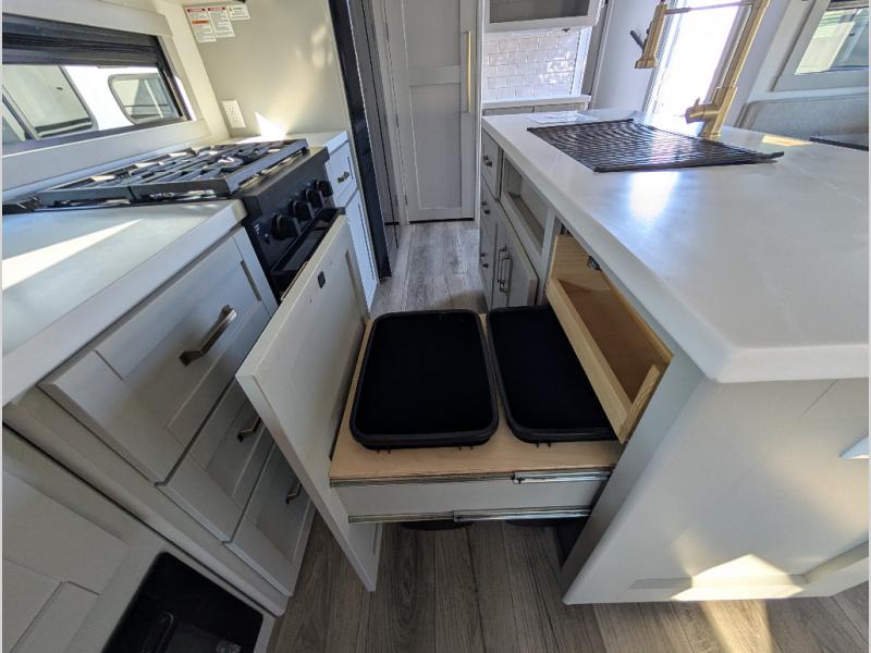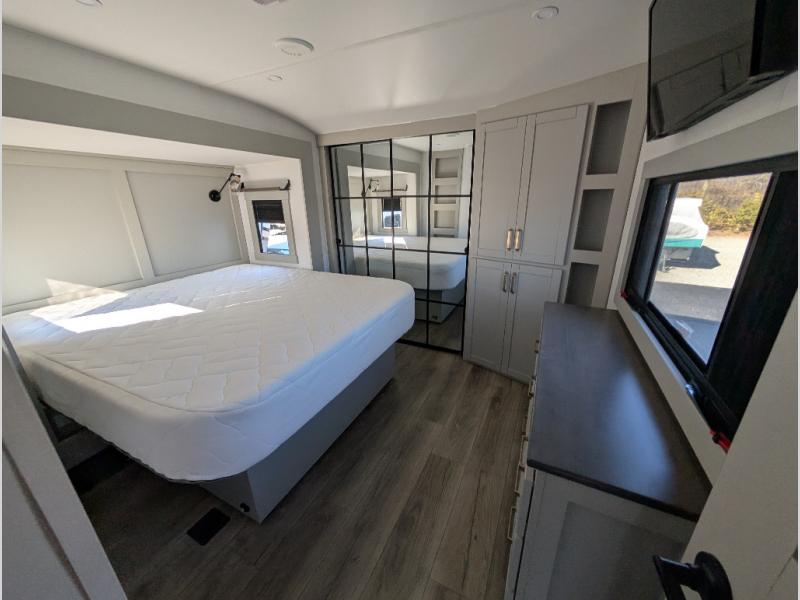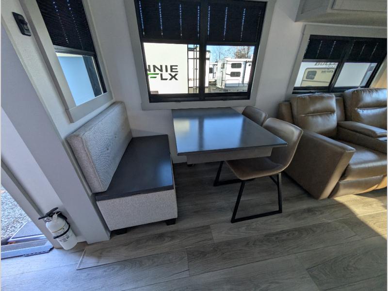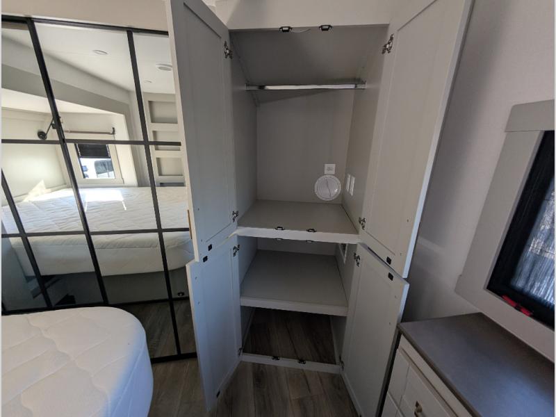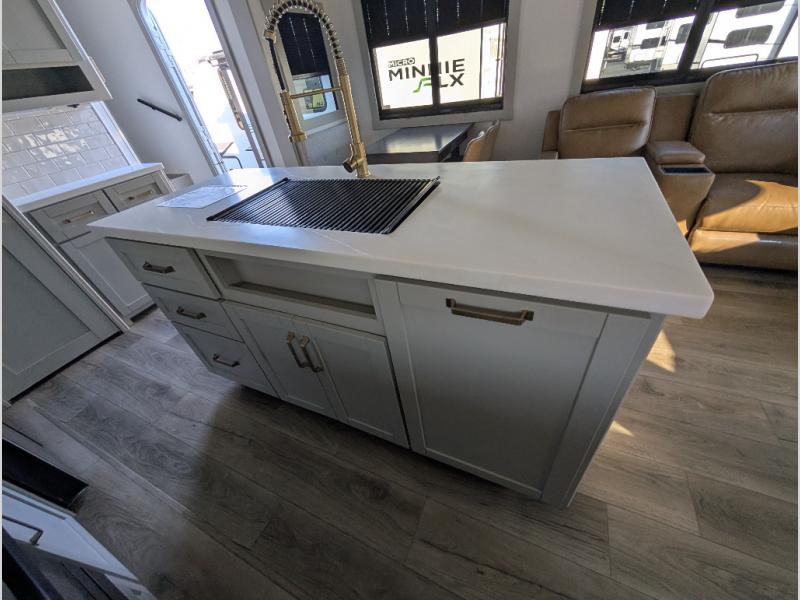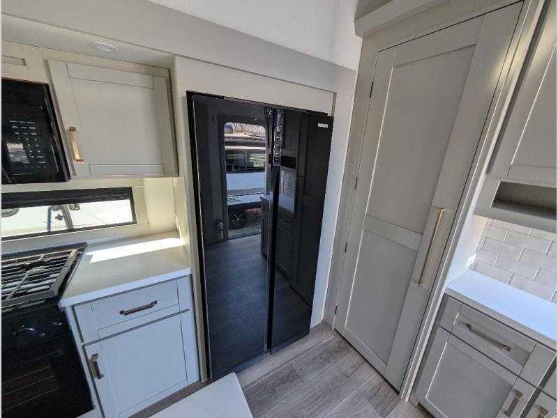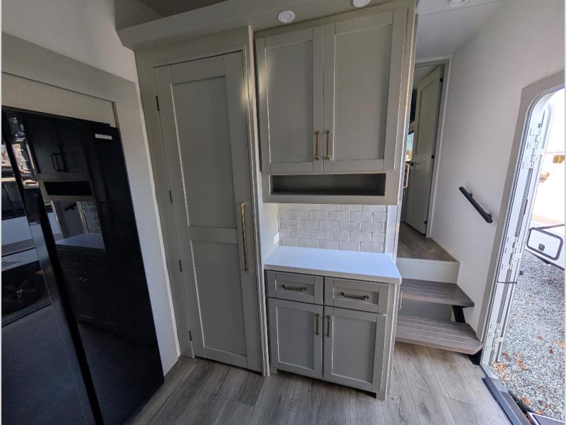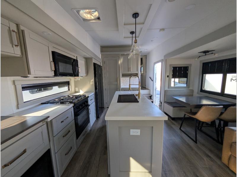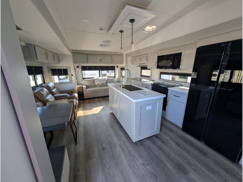 When you want travel accommodations to feel just like home! This Model Z luxury fifth wheel is bright and modern on the inside, with loads of amenities that will have you dreaming of your next trip! Enter and find a spacious combined living/kitchen space thanks to dual opposing slides. There is ample seating with a free standing dinette that includes a built-in utensil drawer, 62" theater seating, and a 72" tri-fold sofa along the rear wall. You can easily relax and enjoy the 50" Smart telescoping TV with a cozy fireplace below. The kitchen offers all that you need to prepare and cook meals just like home with a 16 cu. ft. refrigerator for your perishables, a 30" microwave oven, and three burner range top and oven. You will love the integrated spice rack, and the kitchen island all outfitted with dog bowls and double pull out trash bins with an integrated Stow & Go paper towel holder. There is also an 84" pantry with adjustable shelves for all of your canned and dry goods. Head up the steps to a private master suite with king bed slide. You can opt for the queen bed if you like. A sliding dresser top features hidden storage which is perfect for jewelry and other personal belongings. The front wardrobe features mirrored doors and the corner closet has been prepped for a stackable washer and dryer if you choose to add that option. Relax and enjoy a large bath featuring a linen cabinet, a 30" x 42" shower, and vanity with sink, plus medicine cabinet. You will also appreciate having dual showers on the outside of this unit, and a rear baggage door and mid-coach pass-through storage.