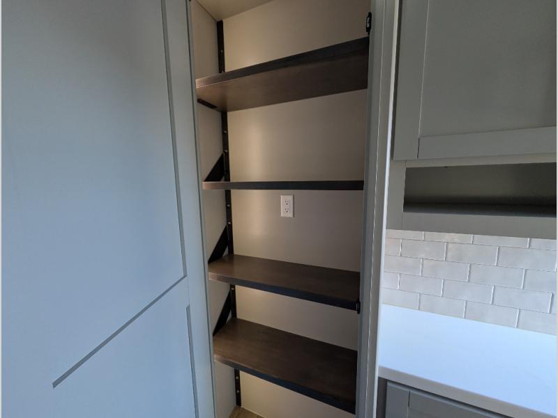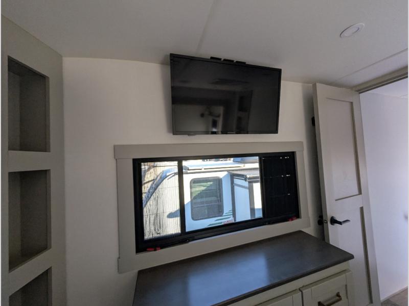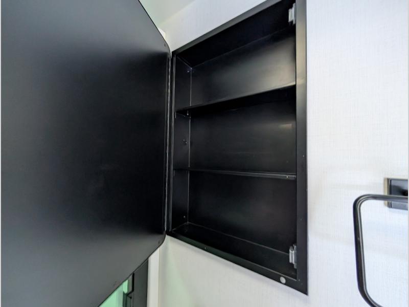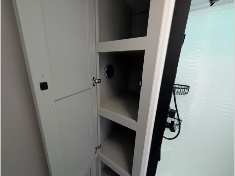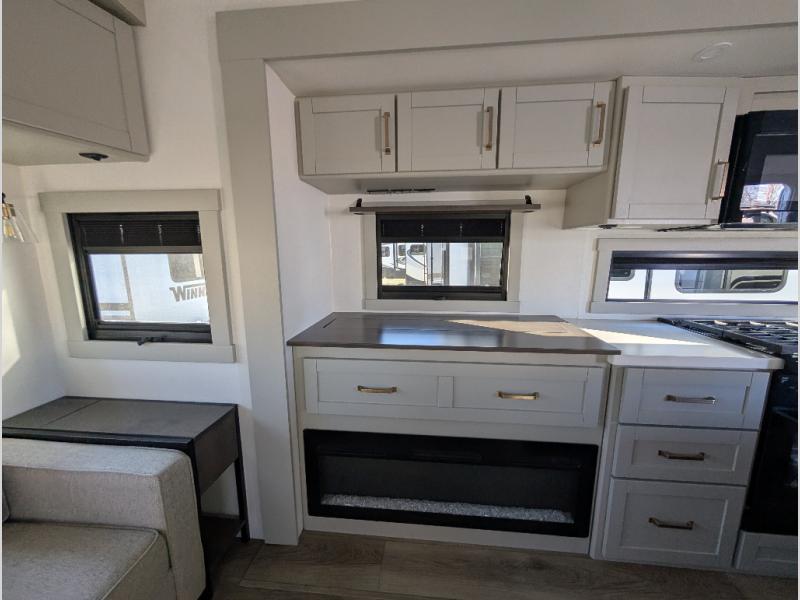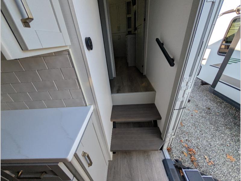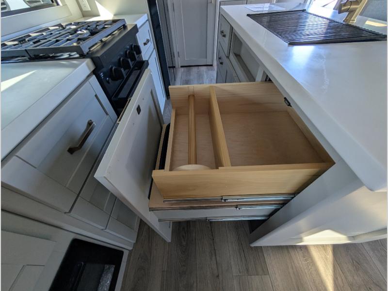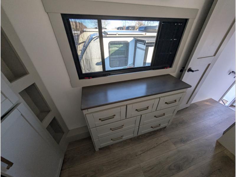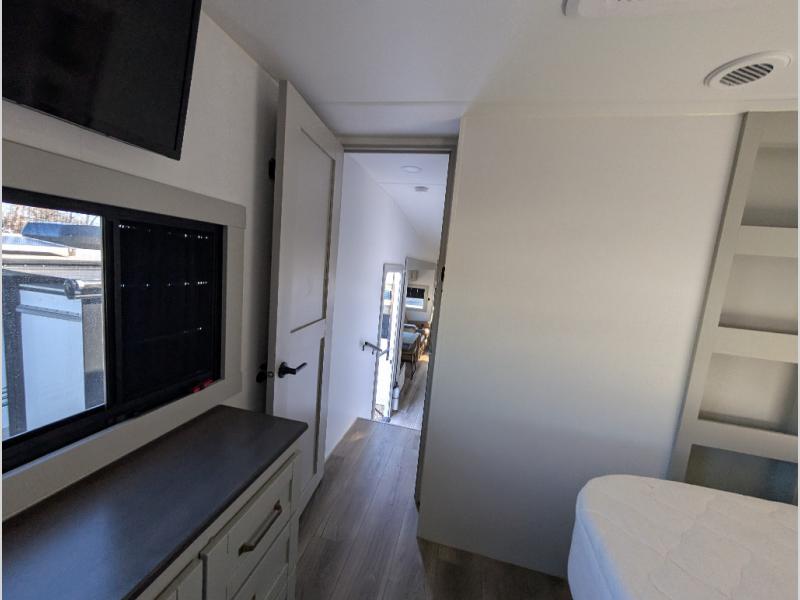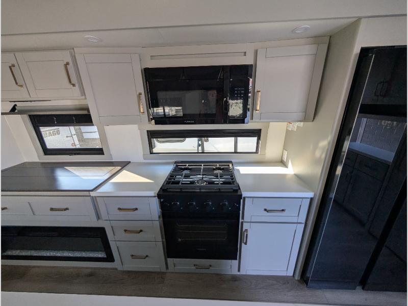 When you want travel accommodations to feel just like home! This Model Z luxury fifth wheel is bright and modern on the inside, with loads of amenities that will have you dreaming of your next trip! Enter and find a spacious combined living/kitchen space thanks to dual opposing slides. There is ample seating with a free standing dinette that includes a built-in utensil drawer, 62" theater seating, and a 72" tri-fold sofa along the rear wall. You can easily relax and enjoy the 50" Smart telescoping TV with a cozy fireplace below. The kitchen offers all that you need to prepare and cook meals just like home with a 16 cu. ft. refrigerator for your perishables, a 30" microwave oven, and three burner range top and oven. You will love the integrated spice rack, and the kitchen island all outfitted with dog bowls and double pull out trash bins with an integrated Stow & Go paper towel holder. There is also an 84" pantry with adjustable shelves for all of your canned and dry goods. Head up the steps to a private master suite with king bed slide. You can opt for the queen bed if you like. A sliding dresser top features hidden storage which is perfect for jewelry and other personal belongings. The front wardrobe features mirrored doors and the corner closet has been prepped for a stackable washer and dryer if you choose to add that option. Relax and enjoy a large bath featuring a linen cabinet, a 30" x 42" shower, and vanity with sink, plus medicine cabinet. You will also appreciate having dual showers on the outside of this unit, and a rear baggage door and mid-coach pass-through storage.