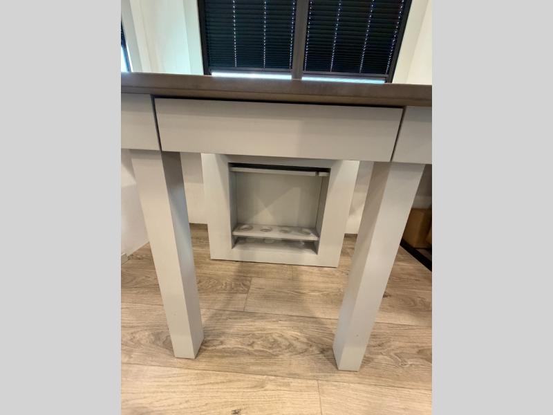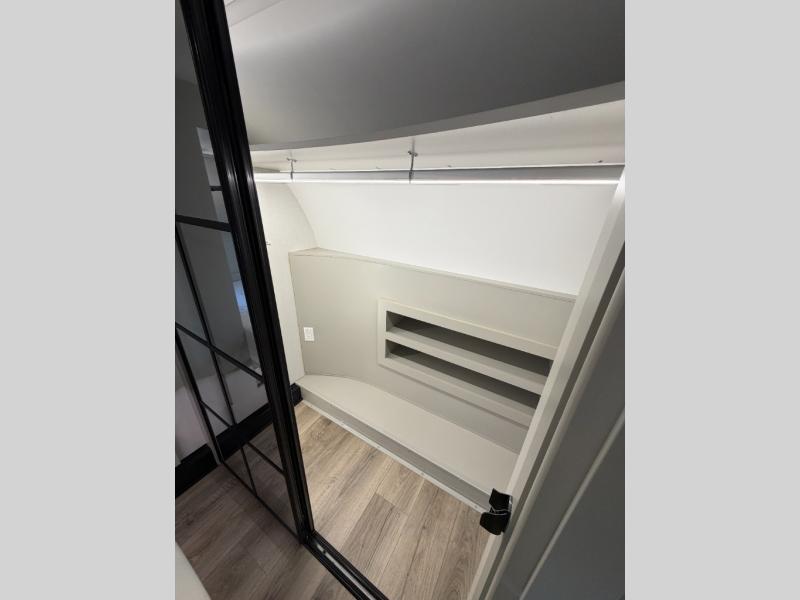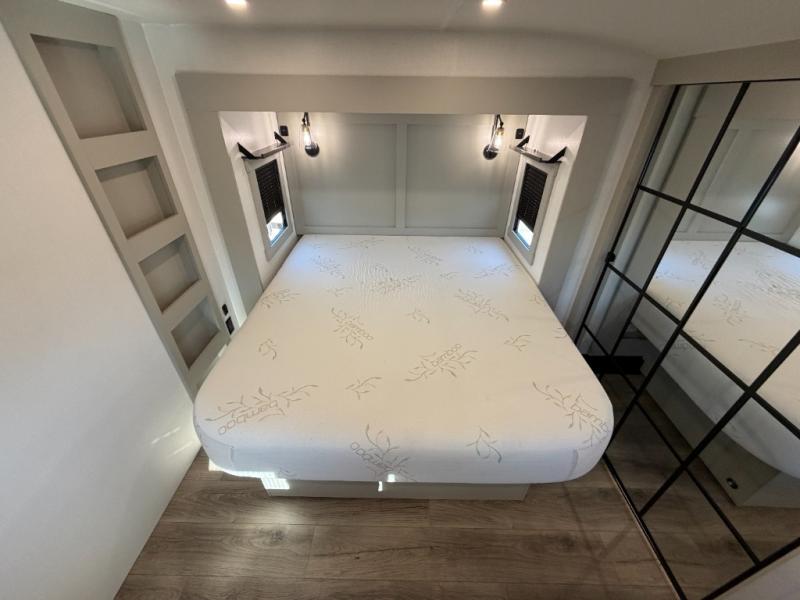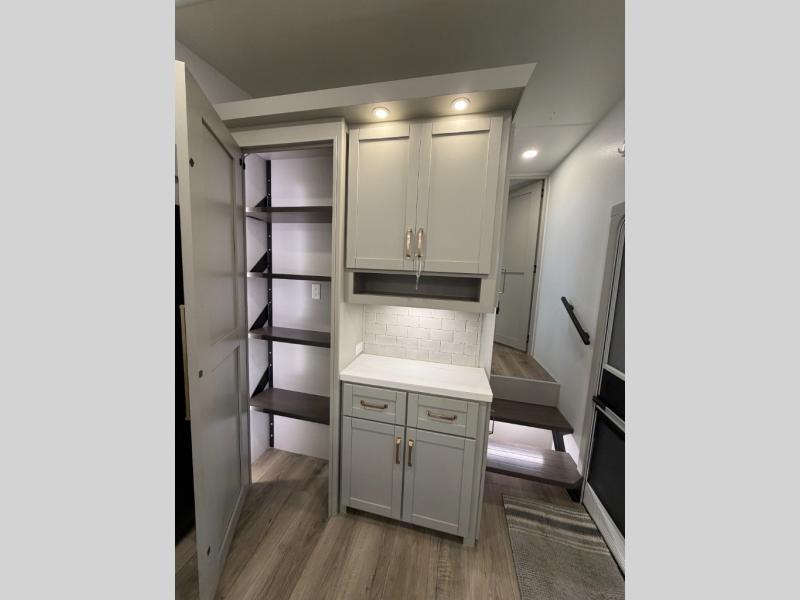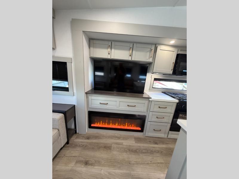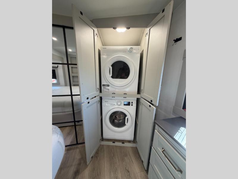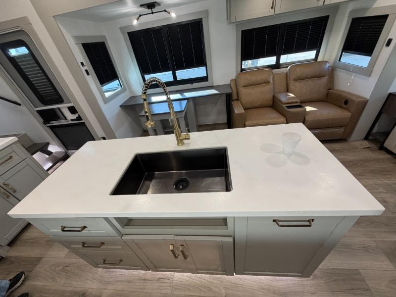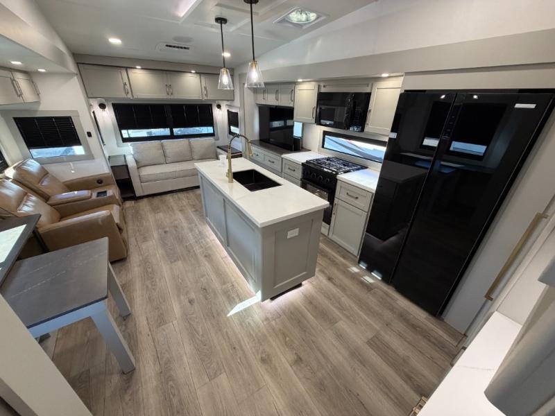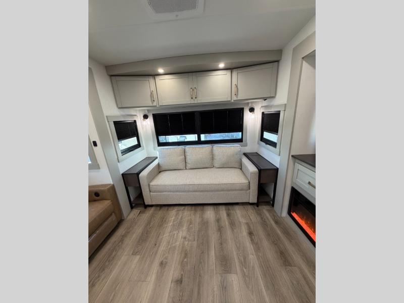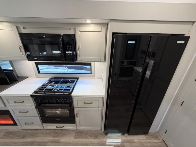 When you want travel accommodations to feel just like home! This Model Z luxury fifth wheel is bright and modern on the inside, with loads of amenities that will have you dreaming of your next trip! Enter and find a spacious combined living/kitchen space thanks to dual opposing slides. There is ample seating with a free standing dinette that includes a built-in utensil drawer, 62" theater seating, and a 72" tri-fold sofa along the rear wall. You can easily relax and enjoy the 50" Smart telescoping TV with a cozy fireplace below. The kitchen offers all that you need to prepare and cook meals just like home with a 16 cu. ft. refrigerator for your perishables, a 30" microwave oven, and three burner range top and oven. You will love the integrated spice rack, and the kitchen island all outfitted with dog bowls and double pull out trash bins with an integrated Stow & Go paper towel holder. There is also an 84" pantry with adjustable shelves for all of your canned and dry goods. Head up the steps to a private master suite with king bed slide. You can opt for the queen bed if you like. A sliding dresser top features hidden storage which is perfect for jewelry and other personal belongings. The front wardrobe features mirrored doors and the corner closet has been prepped for a stackable washer and dryer if you choose to add that option. Relax and enjoy a large bath featuring a linen cabinet, a 30" x 42" shower, and vanity with sink, plus medicine cabinet. You will also appreciate having dual showers on the outside of this unit, and a rear baggage door and mid-coach pass-through storage.
