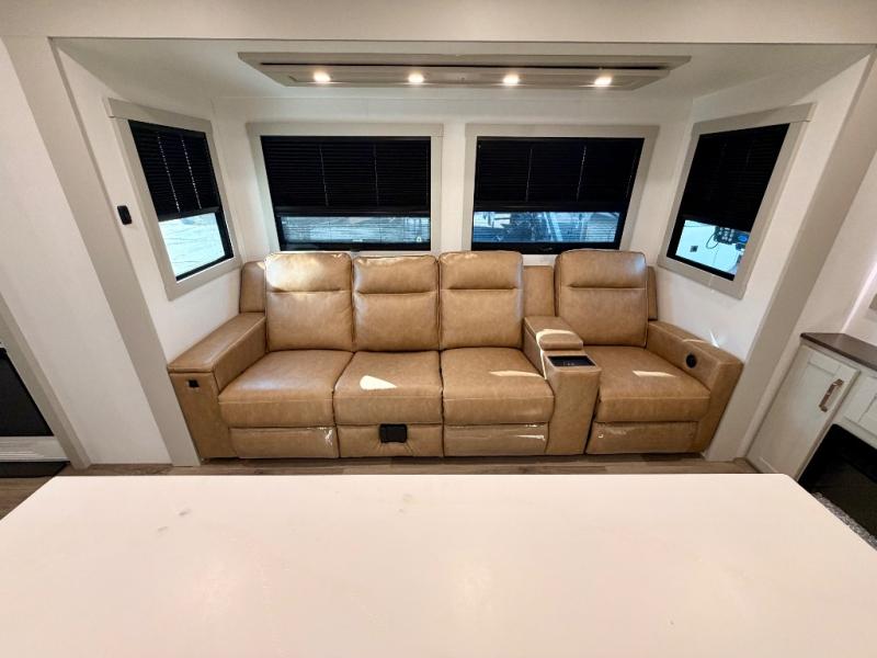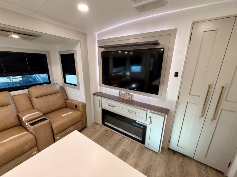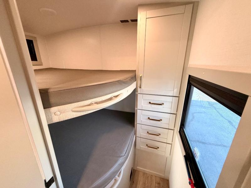 Camping with family or friends just got easier in this spacious travel trailer. There is a rear private bunkhouse with double-size bunks and storage space for your guests' things. You will appreciate your own space in the front private bedroom that includes a queen bed and built-in bedside storage with outlets and USB ports. And the full bath includes a 30" x 42" one-piece fiberglass shower so everyone can stay clean throughout your trip. The combined kitchen and living area will be a favorite place to visit together since there is theater seating with two recliners and a removable table, a TV with swivel, plus a fireplace! You will also enjoy the kitchen island with bar stools, along with additional kitchen counter space, a pantry with adjustable shelves, and a spacious 16 cu. ft. refrigerator that can still open when the slide out is in. Head outside to find drop-frame pass-thru storage and rear storage, two patio awnings, LED chassis lighting, quad step entry, and more!