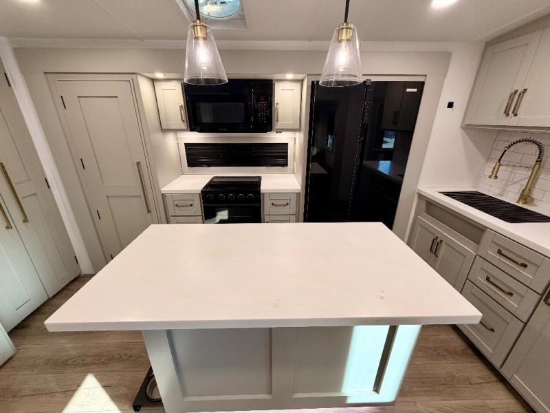 With any Model Z Air travel trailer by Brinkley, you will enjoy premium features at every turn. The industry-first low maintenance roof is sure to be appreciated, plus there are industry-first brass plumbing connections for excellent resistance to corrosion. The drop-frame chassis with over 100 cu. ft. of exterior storage will allow you to bring along camp gear galore, plus there are motion lighting and power outlets for added convenience! You'll also find two hot/cold showers outdoors, along with a 370-watt solar panel, a custom LP box with locked battery storage, and a premium utility center with a retractable 65' water hose to wash off mud from the lake. The interior is just as accommodating with its solid surface countertops, Brinkley CraftSense wood trim construction, integrated window screens and insulated blackout blinds, and the list of luxury features goes on!