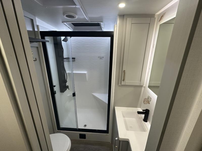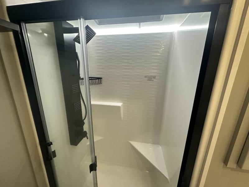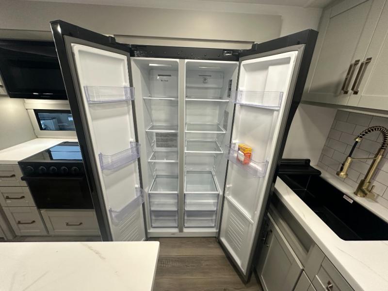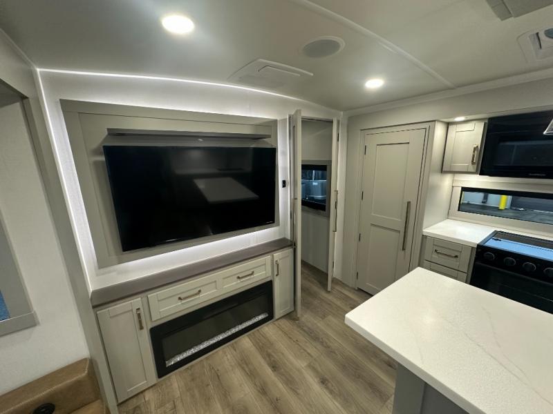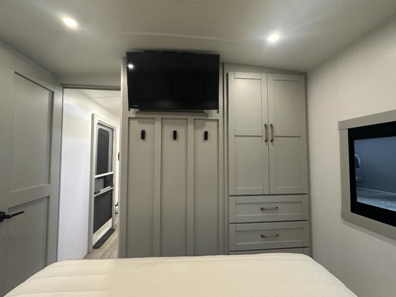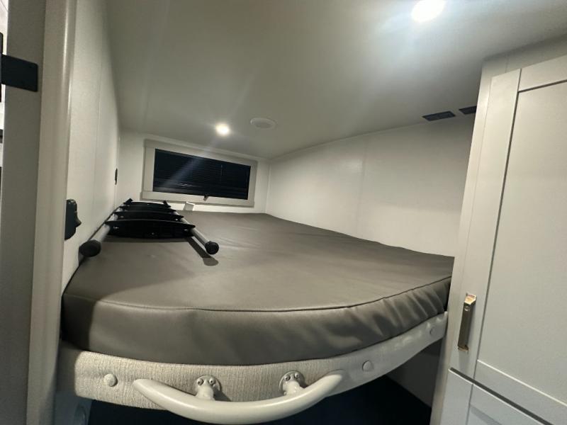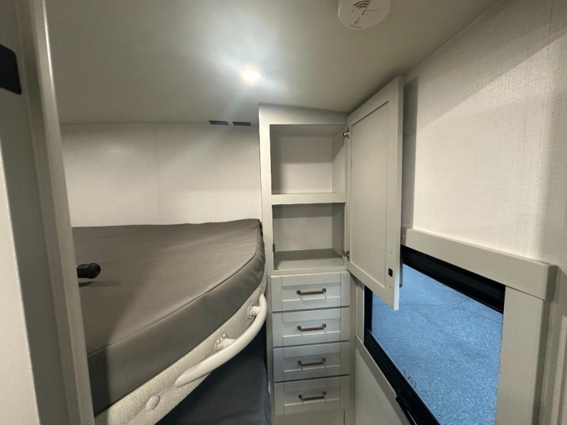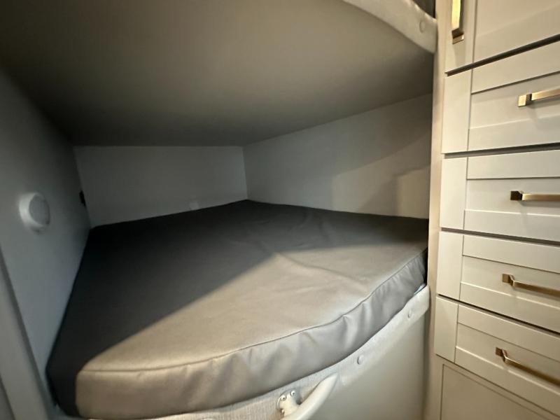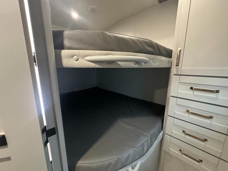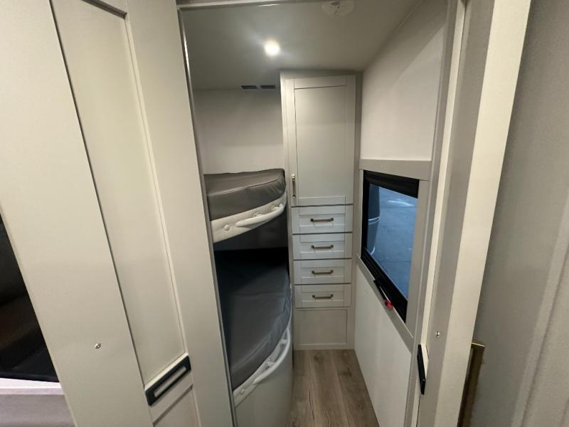 Camping with family or friends just got easier in this spacious travel trailer. There is a rear private bunkhouse with double-size bunks and storage space for your guests' things. You will appreciate your own space in the front private bedroom that includes a queen bed and built-in bedside storage with outlets and USB ports. And the full bath includes a 30" x 42" one-piece fiberglass shower so everyone can stay clean throughout your trip. The combined kitchen and living area will be a favorite place to visit together since there is theater seating with two recliners and a removable table, a TV with swivel, plus a fireplace! You will also enjoy the kitchen island with bar stools, along with additional kitchen counter space, a pantry with adjustable shelves, and a spacious 16 cu. ft. refrigerator that can still open when the slide out is in. Head outside to find drop-frame pass-thru storage and rear storage, two patio awnings, LED chassis lighting, quad step entry, and more!