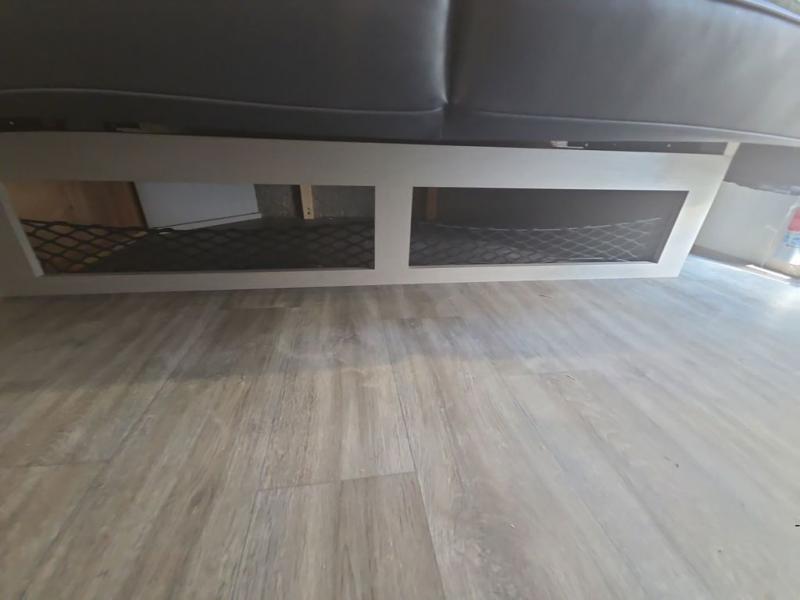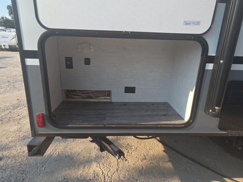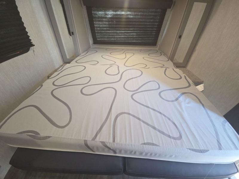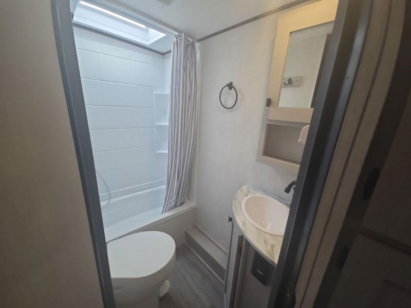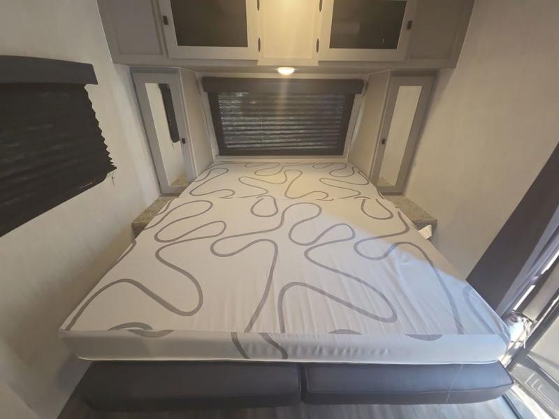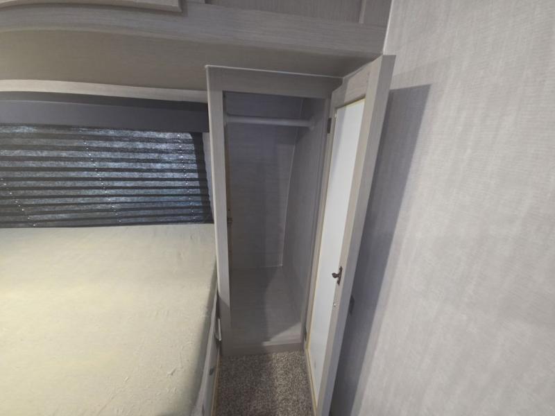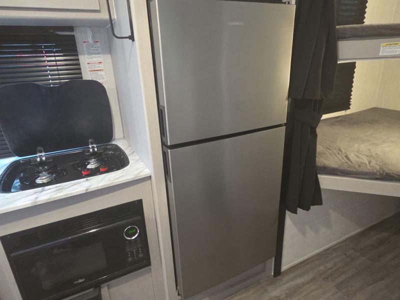You and a few friends or family members can camp comfortably in this travel trailer! It features a front queen bed with wardrobes on either side to keep your clothes out of the way or you can switch it out for the optional Murphy bed for more versatility. Two others can sleep on the rear corner upper double bed and lower flip up double bed. After you have fried up some eggs on the two burner cooktop and heated up a piece of banana bread in the microwave, you can head to the booth dinette slide to enjoy it. There is even a pantry to store your coffee grounds and snacks. Now that your bellies are full, you can freshen up in the rear corner bathroom with the tub/shower.