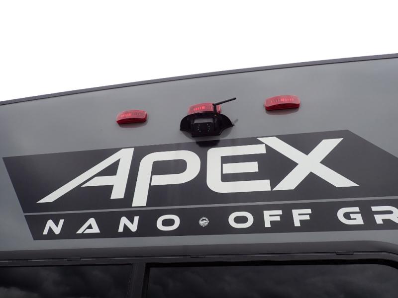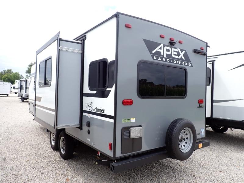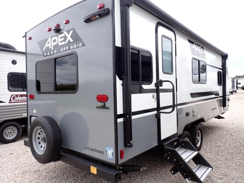 You will find comfort, convenience, and a sturdy construction with each of these Coachmen RV Apex Nano travel trailers! They are held together with an aluma-cage construction, an I-beam chassis, plus vacuum-bonded laminated dual Azdel fiberglass walls for double the protection against the elements. The 200-watt solar panel with a 30 amp control charger is included within the Off-Grid Package, along with two 20 lb. LP tanks, a high velocity power roof vent, plus 12V outlets to keep you powered up. More exterior feature include a hot/cold shower, four stabilizer jacks, a power awning with LED lighting, and magnetic baggage door catches to easily pack and unload your gear. You will love the interior of your Apex Nano with Shaw residential flooring, one-piece seamless edge countertops, matte black hardware in the galley, and a hand-crafted wood medicine cabinet in the bath.